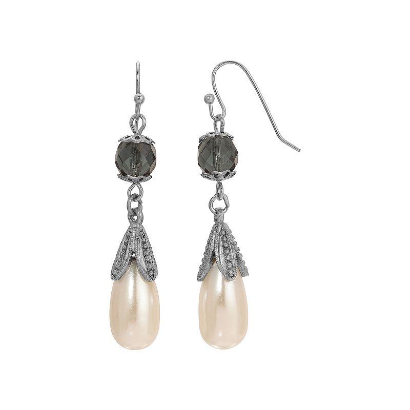 These regal silver tone earrings from 1928 feature a beautiful combination of blue glass beads, filigree flower accents, and white simulated pearl teardrops. These regal silver tone earrings from 1928 feature a beautiful combination of blue glass beads, filigree flower accents, and white simulated pearl teardrops. FEATURES Length: 40 mm Backings: fishhook Metal: alloy Plating: silver tone Finish: antiqued Material: acrylic, crystal Not appropriate for children 14 years old and younger. Size: One Size. Gender: female. Age Group: adult.