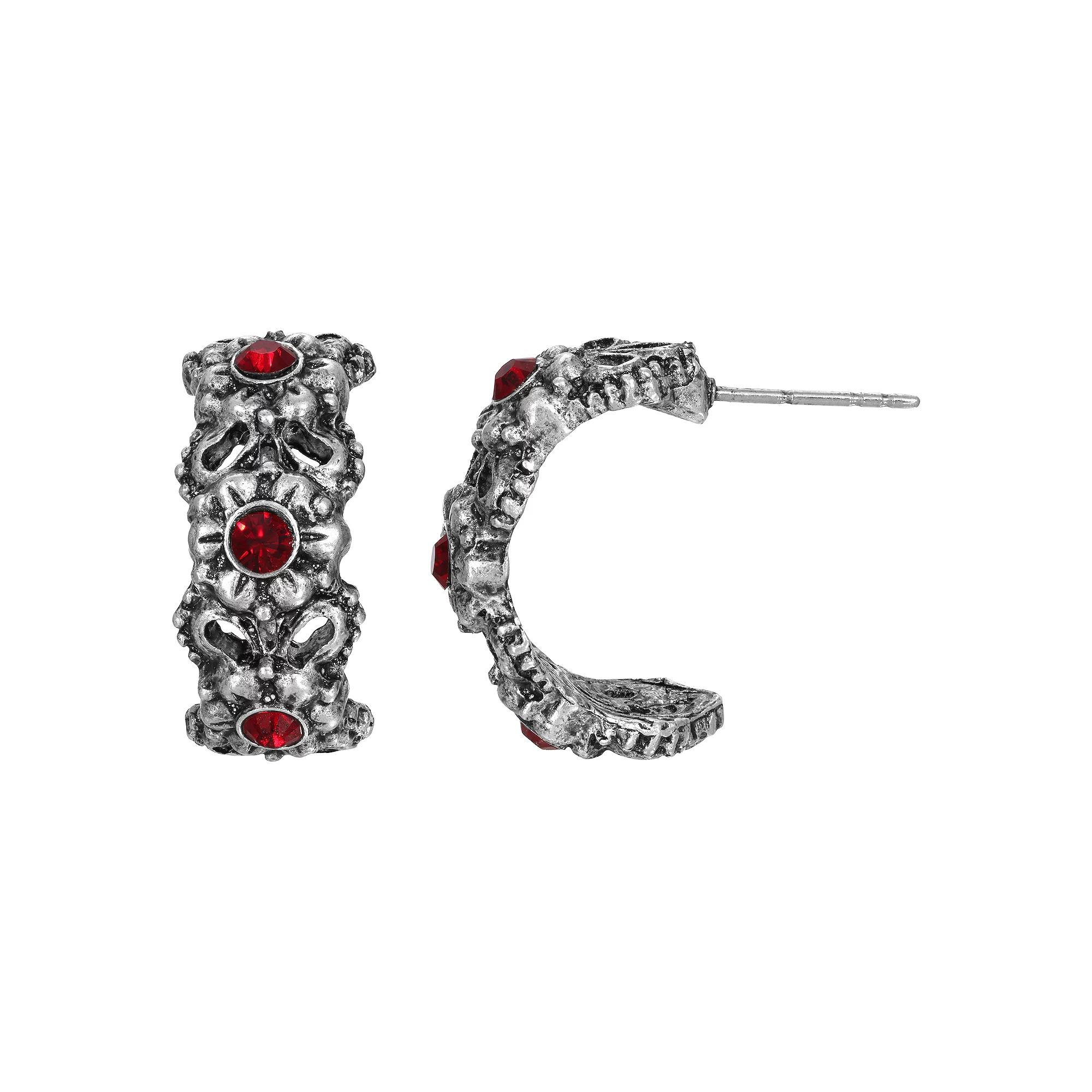 An antique style set of earrings brought back to life, these earrings are perfect for anytime of the day. Featuring antiqued pewter half hoops with petite flower designs & accented with brilliant European crystals. | 1928 Jewelry Peweter With Crystal Stone Earrings, Silver, No Size