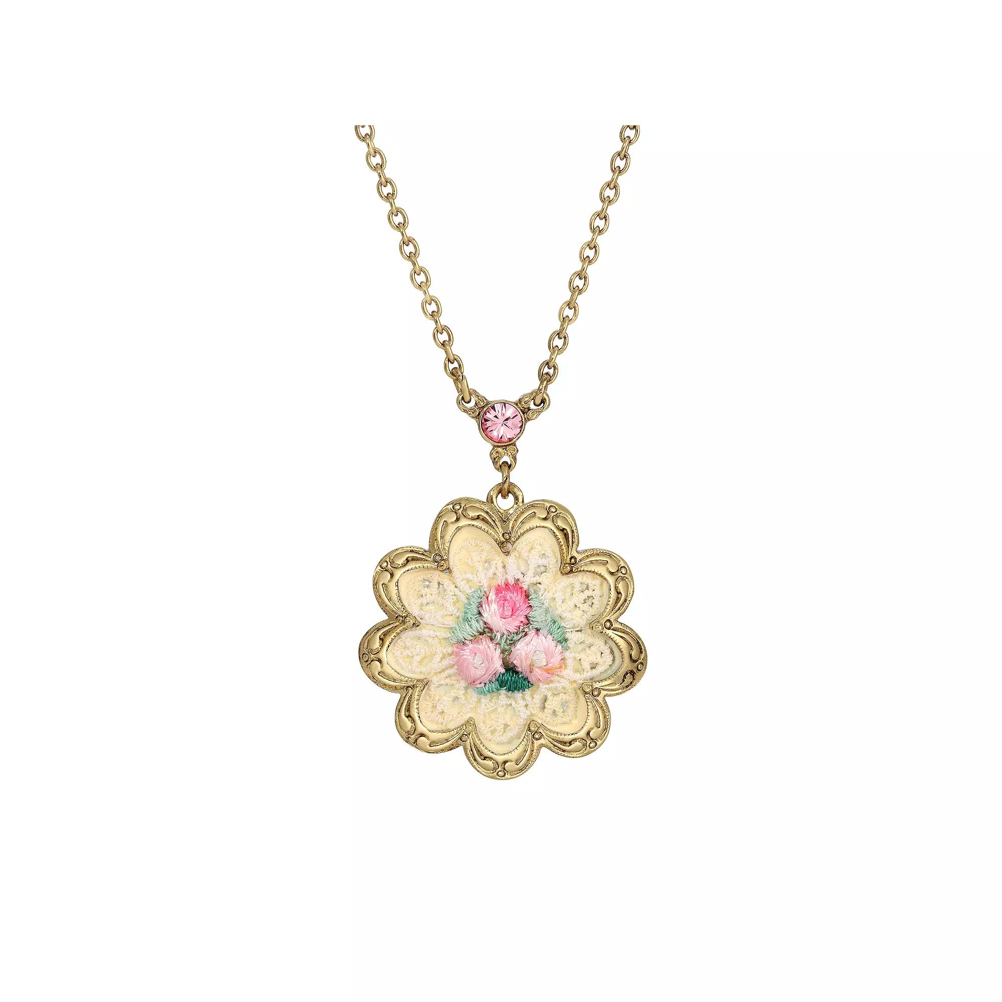 An adorable 1928 White and Pink Knit Flower Pendant Necklace featuring a realistic white knit doily with pink rose flower accents at the center and on an ornate flower shaped pendant. This flower necklace also comes with a beautiful rose pink crystal accent and dangles from an necklace that includes a 3 inch extension chain. An adorable 1928 White and Pink Knit Flower Pendant Necklace featuring a realistic white knit doily with pink rose flower accents at the center and on an ornate flower shaped pendant. This flower necklace also comes with a beautiful rose pink crystal accent and dangles from an necklace that includes a 3 inch extension chain. Metal: alloy Chain length: 16 in. with 3 in. extender Additional material: enamel Plating: gold tone Finish: polished Drop length: 1.5 in. Not appropriate for children 14 years old and younger. Size: One Size. Gender: female. Age Group: adult.