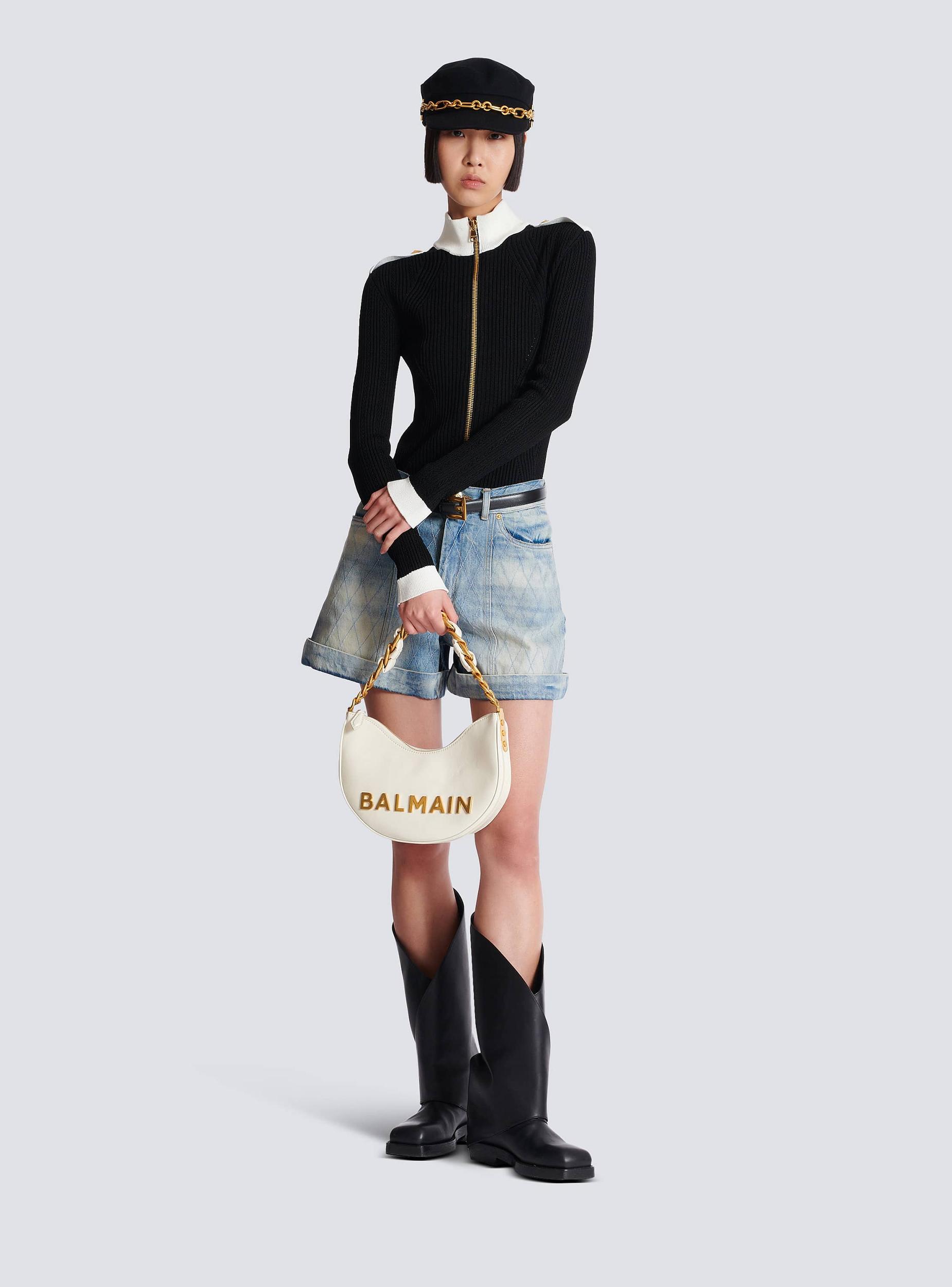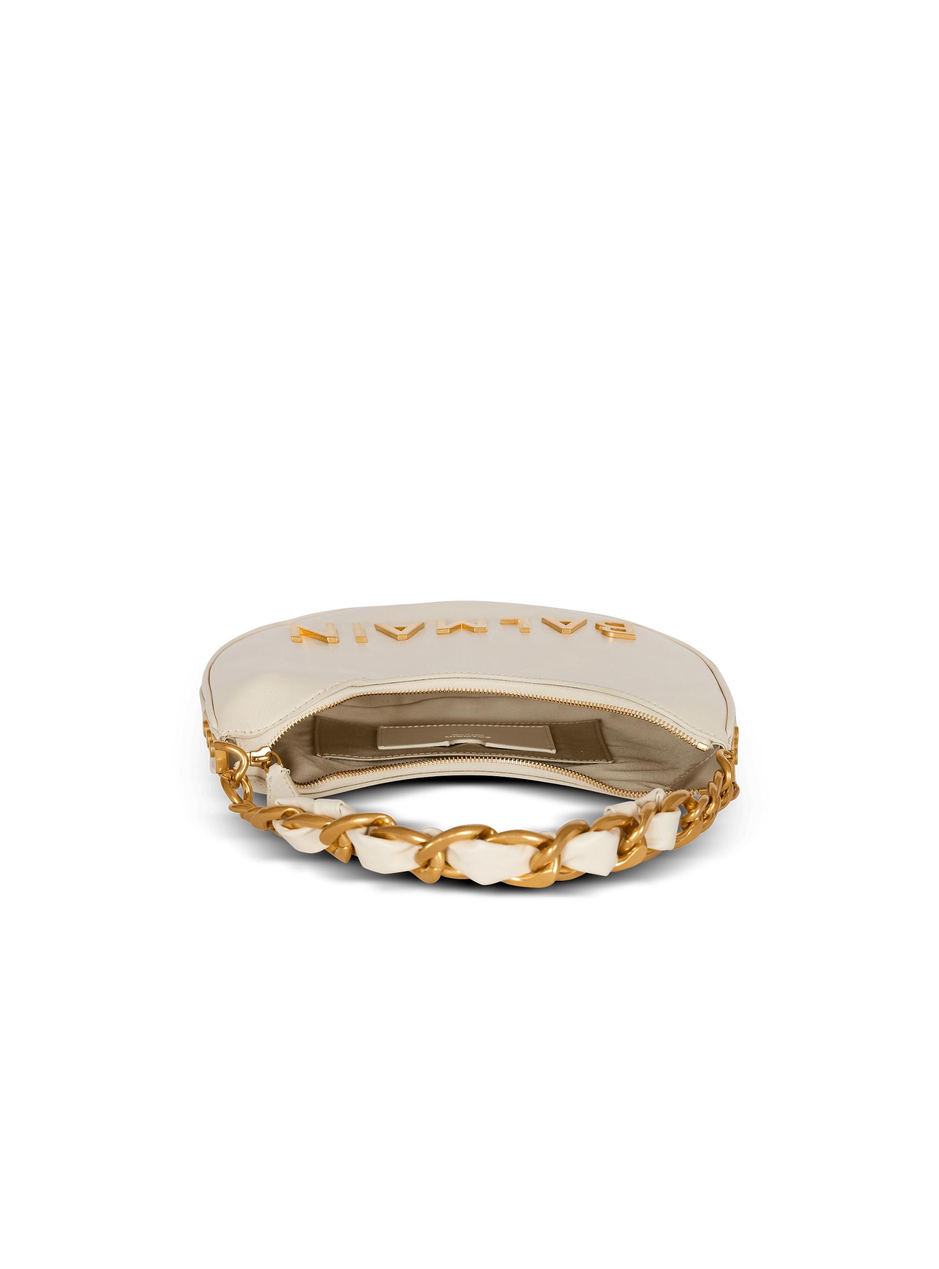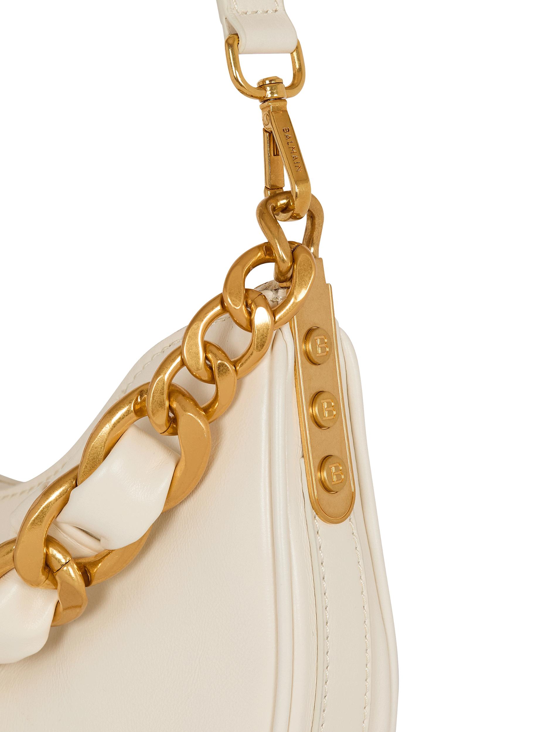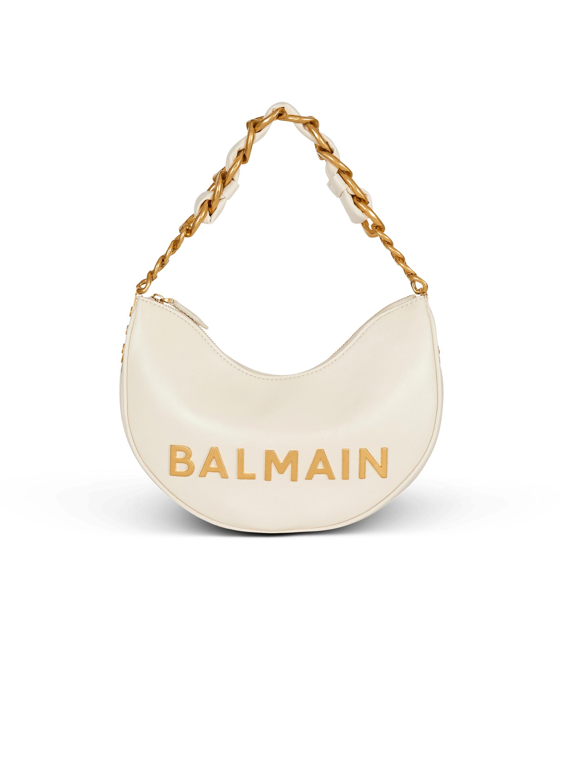 1945 Soft Moon crinkled calfskin leather bagCarry in the hand, on the shoulder or across the bodyMetal Balmain logoChain handle interlaced with leatherAdjustable removable shoulder strap with a buckle and snap hooksMetal side plaques with engraved B buttonsZip fasteningTwill liningInside patch pocketEmbossed leather card pocketGold hardwareDimensions: 28 x 20.5 x 5.5 cmMain material: 100% calfskinMade in ItalyItem: FN1BQ954LTFL