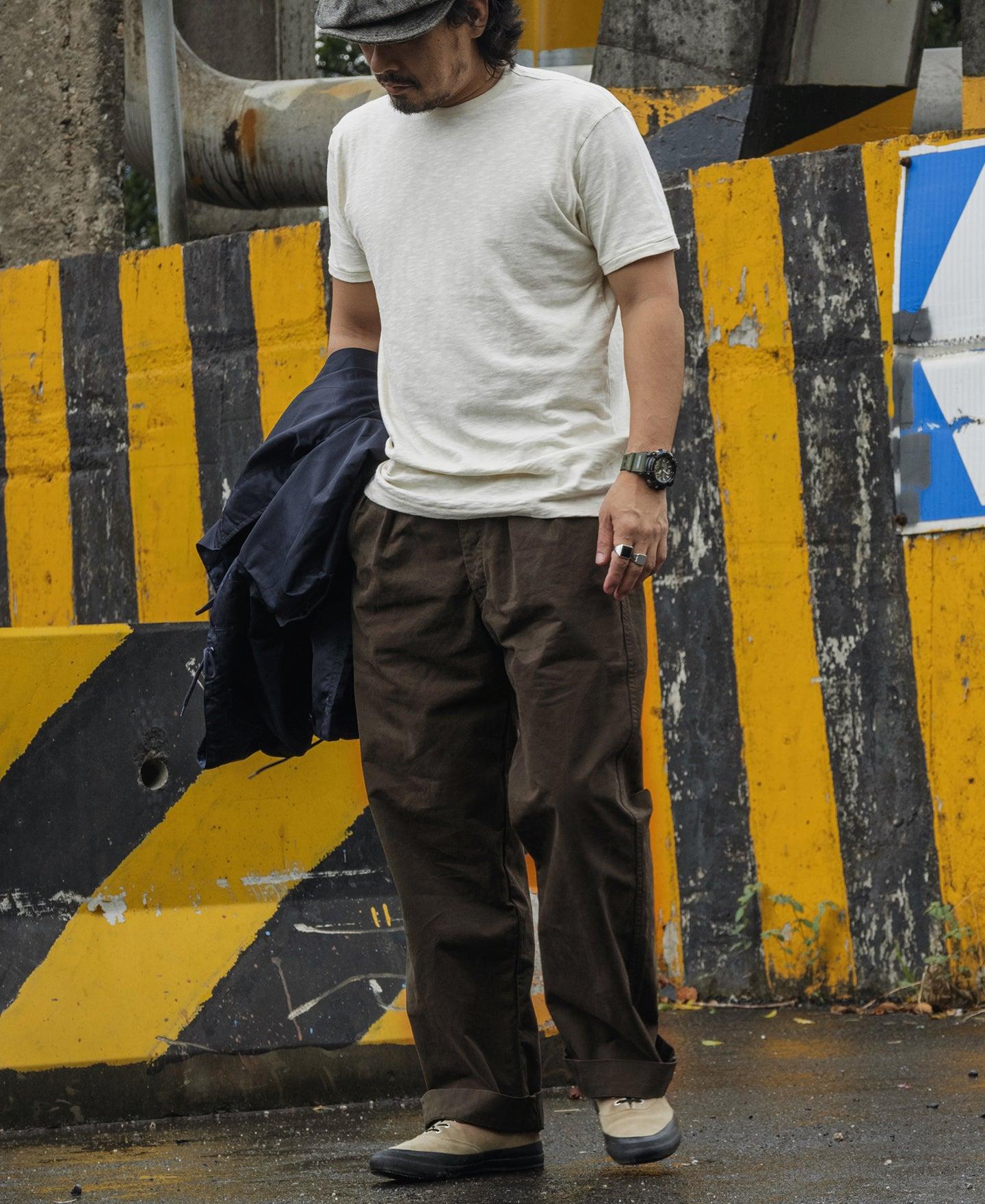◄DESCRIPTION Based on the Australian Army's two-pleated combat trousers of the 1960s, they have the broad outline of traditional British combat trousers, with adjusters at both sides of the waist and snaps fly. ◄DETAILS Loose fit with a straight leg and high rise. Adjusters at both sides of the waist. Snaps fly with two snapped closures. Side on-seam pockets. Two back welt pockets. 11 oz cotton twill, 100% cotton. Machine washable. ◄SIZE & FIT Please carefully read the size info before purchase! Different products have different size info. Please use this info as a general guide as measurements are approximate. Model is 5' 11"/ 178cm and 174lbs/ 79kg. He wears a size 34, wearing effect is fit. IN CM Size Waist Hip 30 29.5" 20.9" 32 31.5" 21.7" 34 33.5" 22.4" 36 35.4" 23.2" 38 37.4" 24" Size Front Rise Back Rise 30 13.6" - 32 13.8" - 34 14.2" - 36 14.4" - 38 14.6" - Size Thigh Inseam 30 27.6" - 32 28.3" - 34 29.1" - 36 30.3" - 38 31.1" - Size Length Leg Opening 30 41.9" 18.5" 32 42.5" 18.9" 34 43.3" 19.3" 36 43.9" 19.7" 38 44.5" 20" Size Waist Hip 30 75 cm 53 cm 32 80 cm 55 cm 34 85 cm 57 cm 36 90 cm 59 cm 38 95 cm 61 cm Size Front Rise Back Rise 30 34.5 cm - 32 35 cm - 34 36 cm - 36 36.5 cm - 38 37 cm - Size Thigh Inseam 30 70 cm - 32 72 cm - 34 74 cm - 36 77 cm - 38 79 cm - Size Length Leg Opening 30 106.5 cm 47 cm 32 108 cm 48 cm 34 110 cm 49 cm 36 111.5 cm 50 cm 38 113 cm 51 cm In order to best determine fit, it may be helpful to compare our garment’s measurements to a similar garment you already own. Lay your garment on a flat surface and take all measurements from the outside of the garment. Click here to check out our Garment Measuring Guide. ** If you are still confused, you can Contact Us to help you choose the size. ** ◄SHIPPING & RETURNS Free shipping on orders $99 (U.S. dollar), Otherwise, a shipping fee of $6.99 will be charged. Click here to see our full shipping policy. BRONSON offers 30 days returning period. Click here to see our full return & exchange policy. * All items must be returned in unused, original condition with tags attached. ◄FAQ Haven't found the answer you are looking for? Take a look at our Frequently Asked Questions or Contact Us.