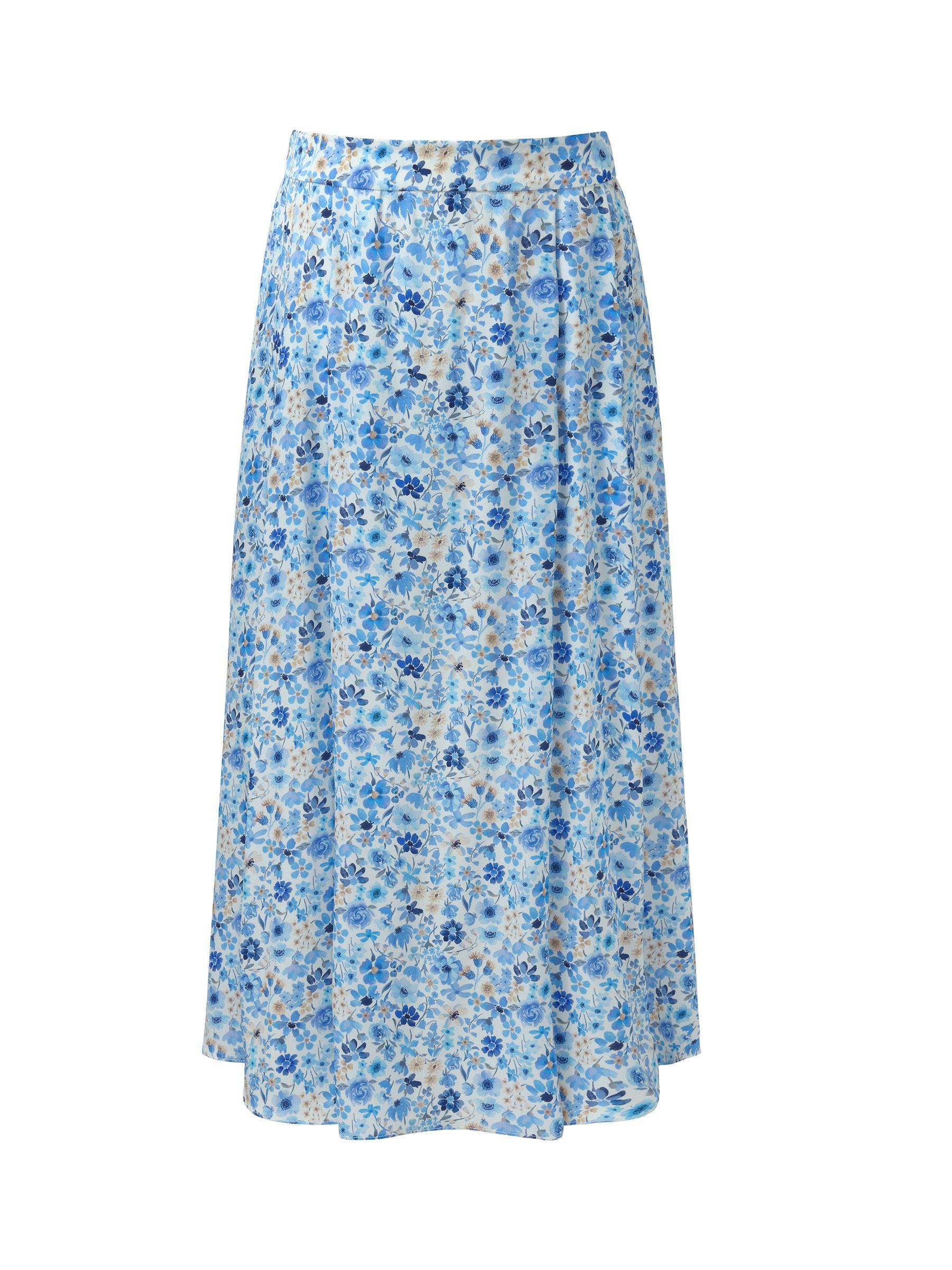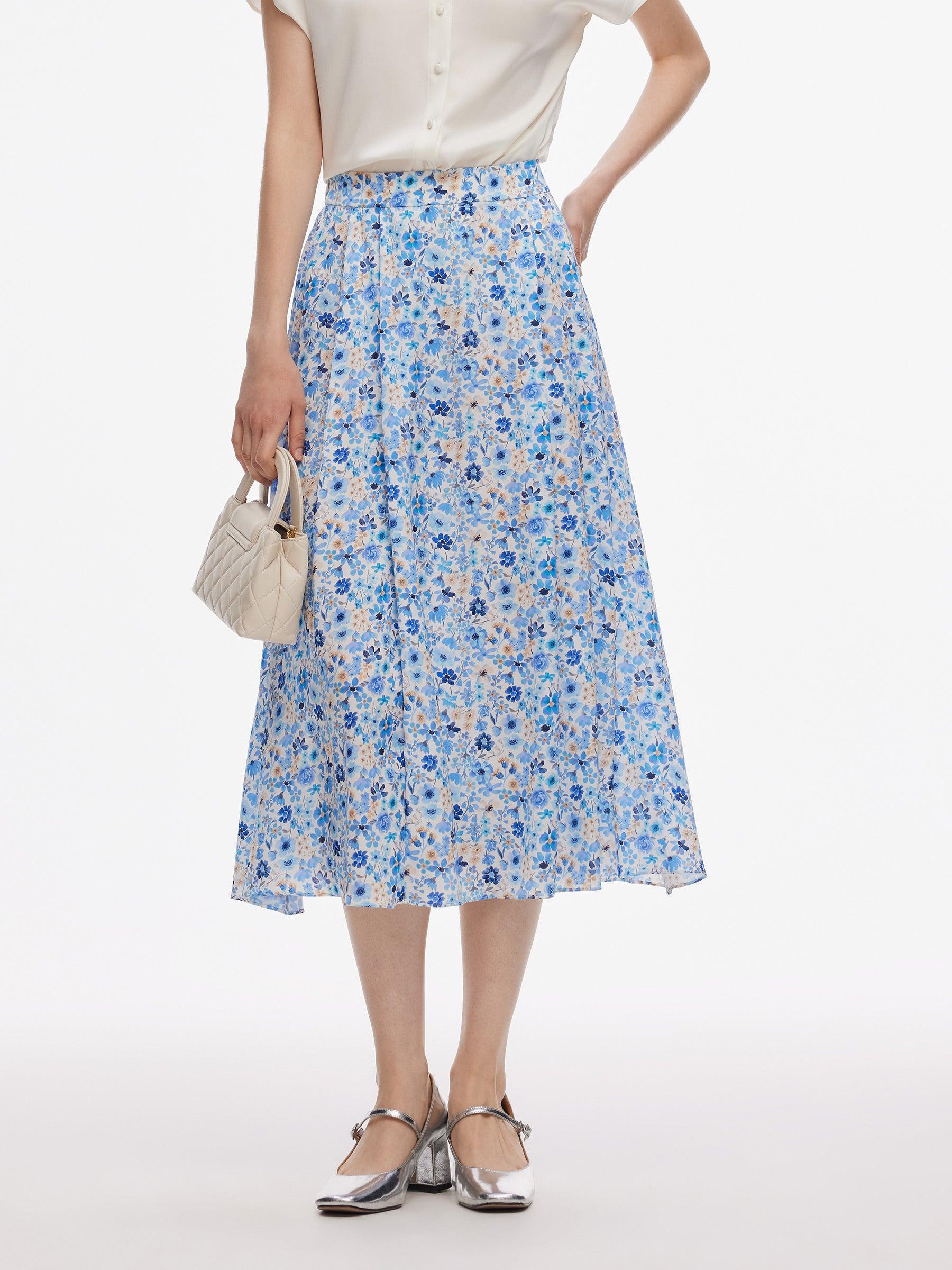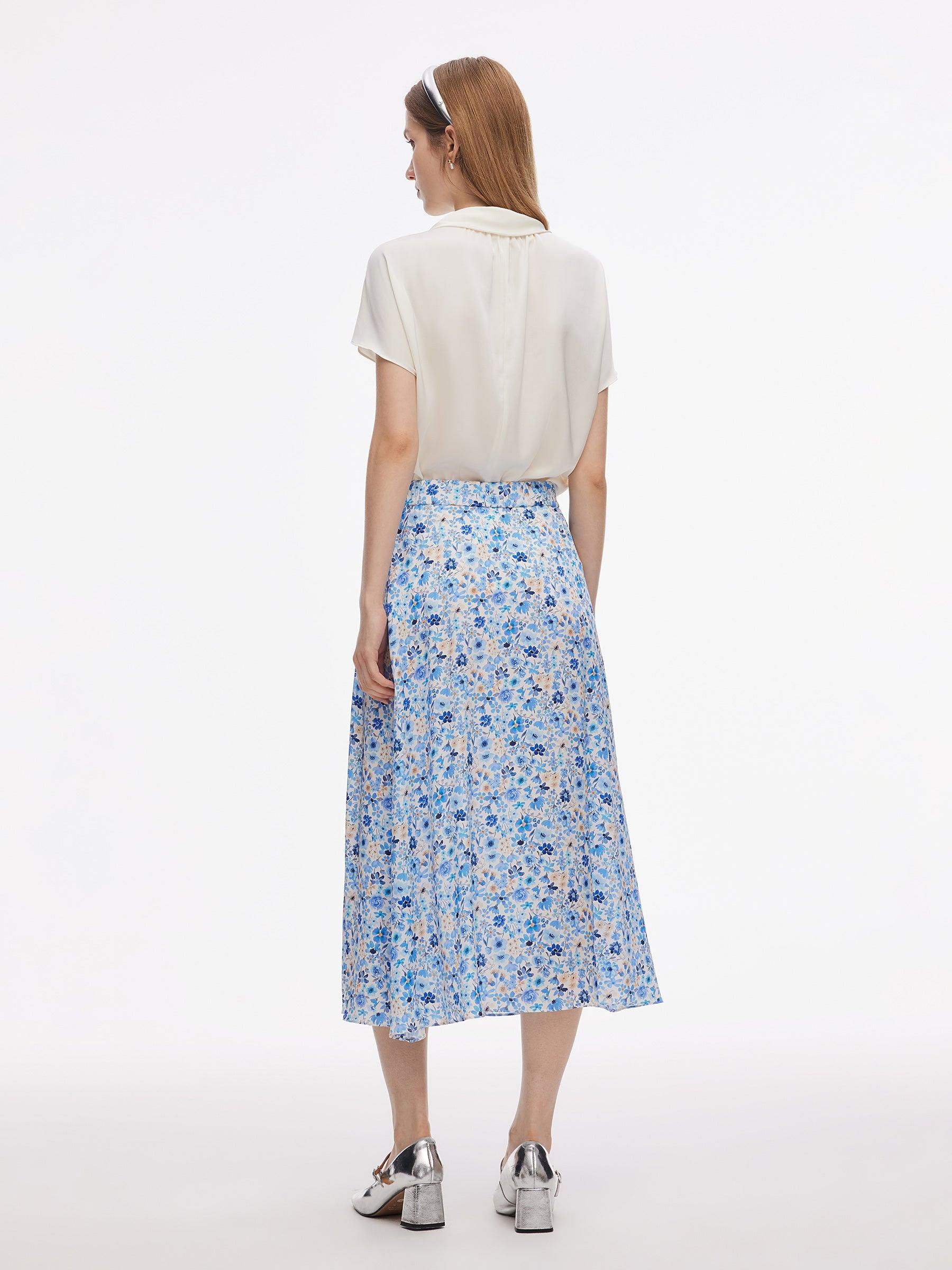 -19MM Stretchy Mulberry Silk -With elastic waistband at the back waist -With invisible side zipper Offered in Liberty-inspired floral print in cool blue hue, this 19MM Stretchy Mulberry Silk skirt feels like a gentle embrace on your skin, ensuring comfort and style. The classic A-line silhouette flatters every figure.