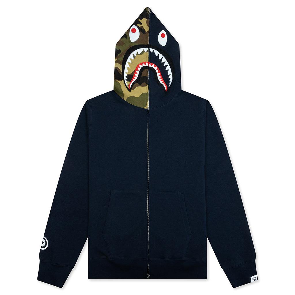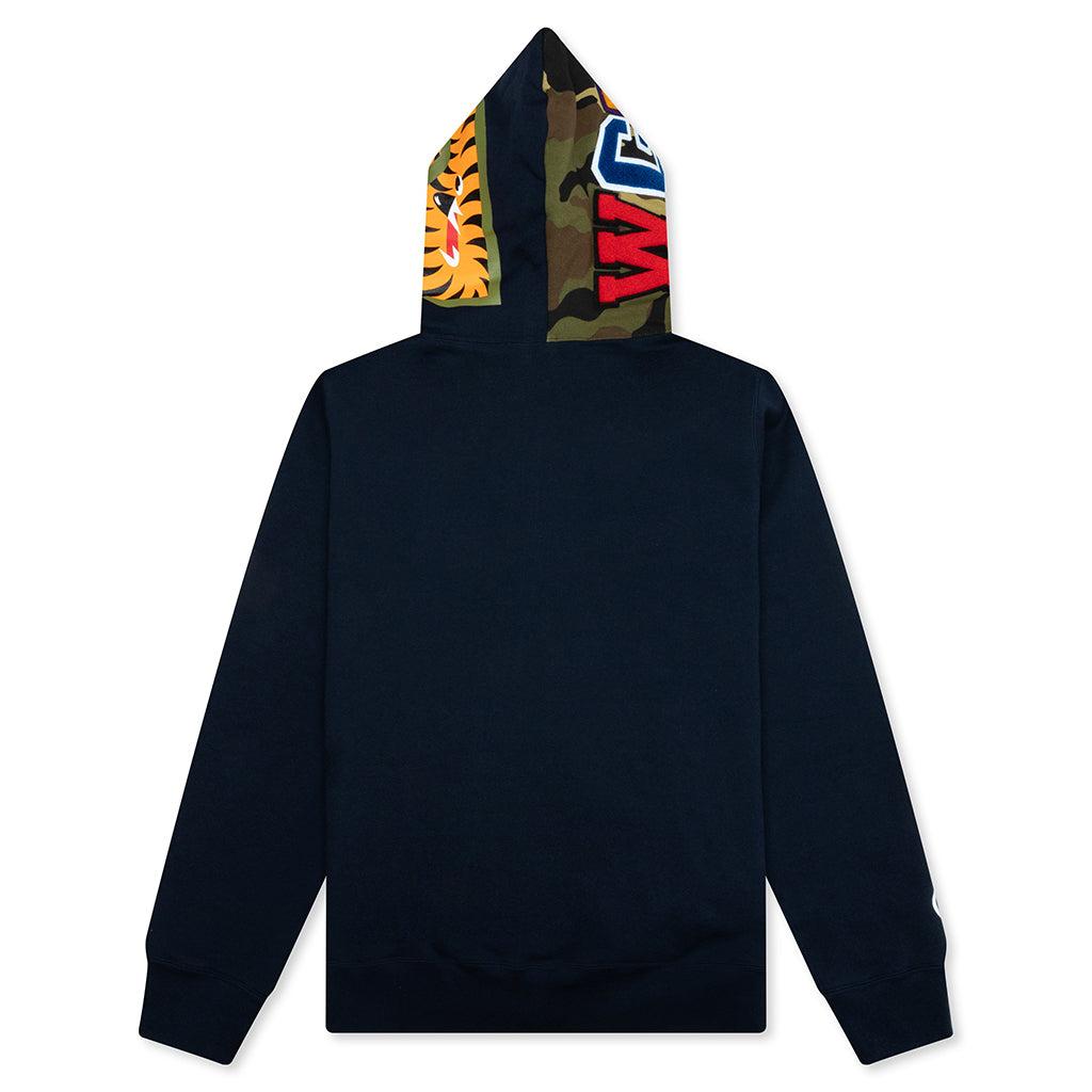 A Bathing Ape presents the 1st Shark Full Zip Hoodie—the newest addition to its iconic Shark hoodie collection. Featuring the signature full-zip closure that extends up to the hood, the hoodies is decorated in felt and woven patches and screen-printed graphics. The hood showcases the Shark face logo and BAPE branding. Finished with ribbed trims and a kangaroo pocket. 100% Cotton Full zip closure to hood Two-way zipper Ribbed trims Kangaroo pocket Felt patches/woven patches Screen-printed graphics BAPE branding Woven brand tag at hem Style No: 001ZPK701005M-NVY