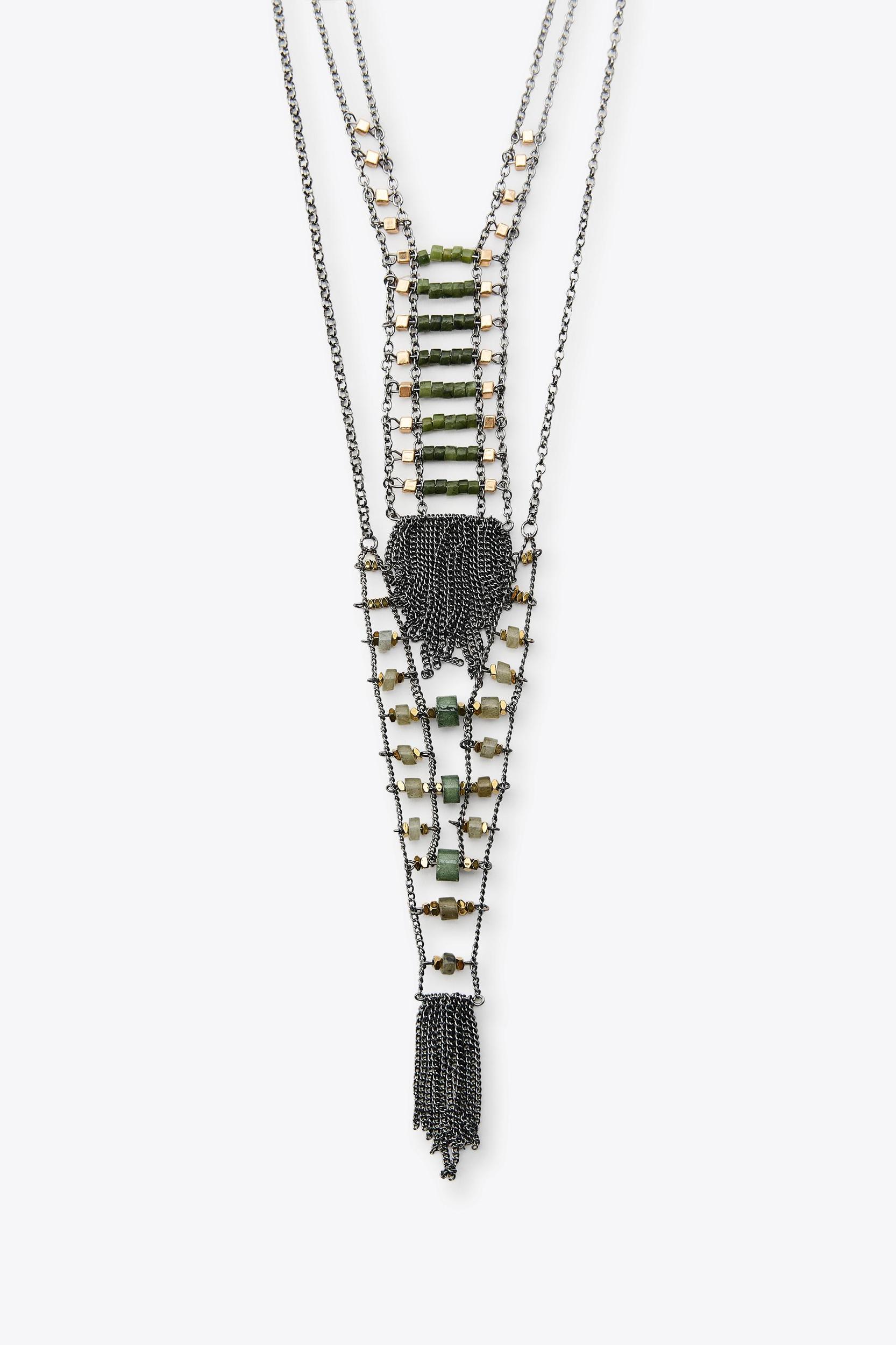 Two-pack of metal link necklaces. Features hanging fringe detail and contrasting color bead appliques. Lobster clasp closure.