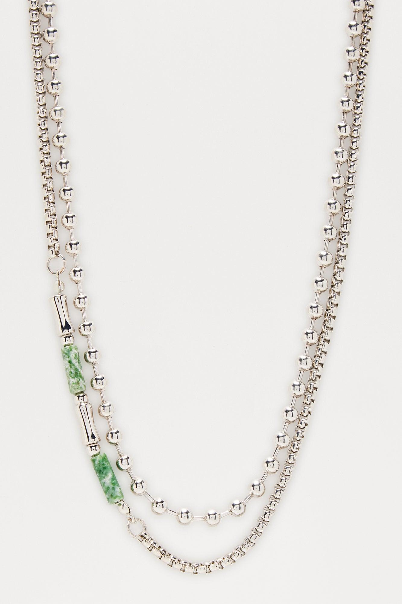 Available In Silver. Stacked Style Clasped Closure 2 Piece Set 19" Chain 21" Chain With Green Beads Imported California Proposition 65WARNING: Cancer and Reproductive Harm - www.P65Warnings.ca.gov.