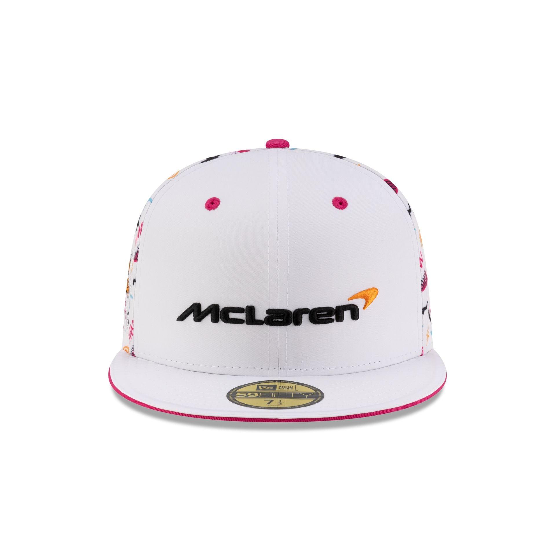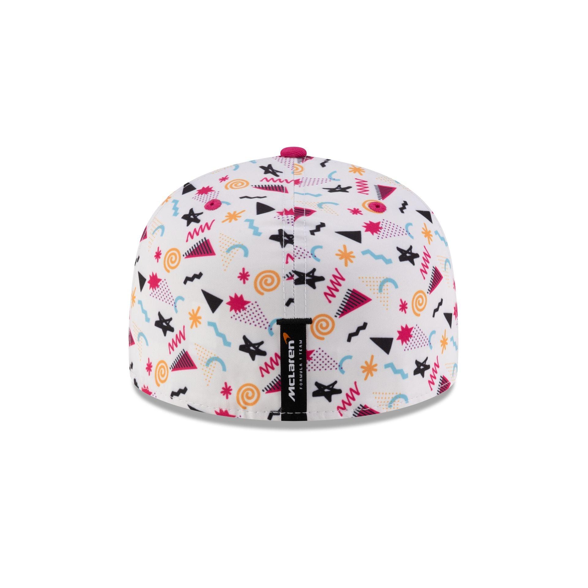 The 2025 Miami Race Special McLaren Formula 1 Team 59FIFTY Fitted Cap features an embroidered McLaren Racing wordmark at the front panels with a woven team tag at the rear. Additional details include a Miami McLaren Formula 1 Team patch at the right-wear side with a Miami inspired allover print, a pink pipe lined visor, and a white undervisor.