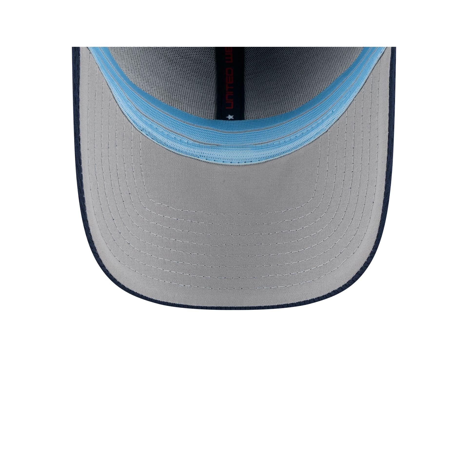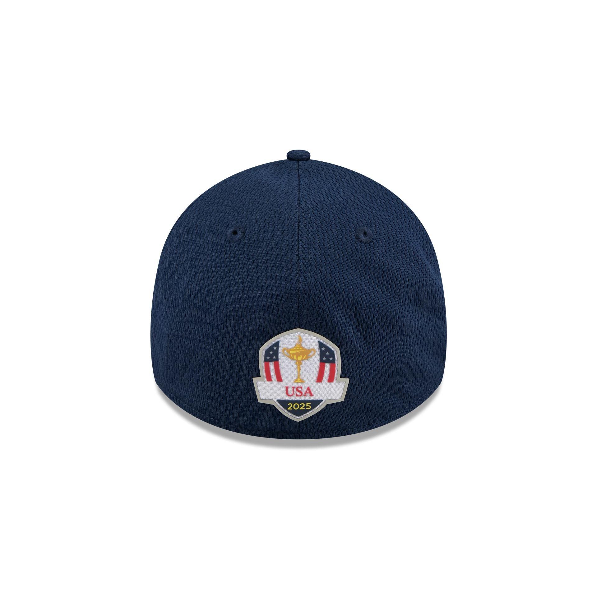 The 2025 Ryder Cup Team USA Flag 39THIRTY Stretch Fit features a silicone Team USA Flag at the front panels with a Ryder Cup logo at the rear. Additional details include embroidered stars at the right-wear side, a rope at the visor, and a gray undervisor.