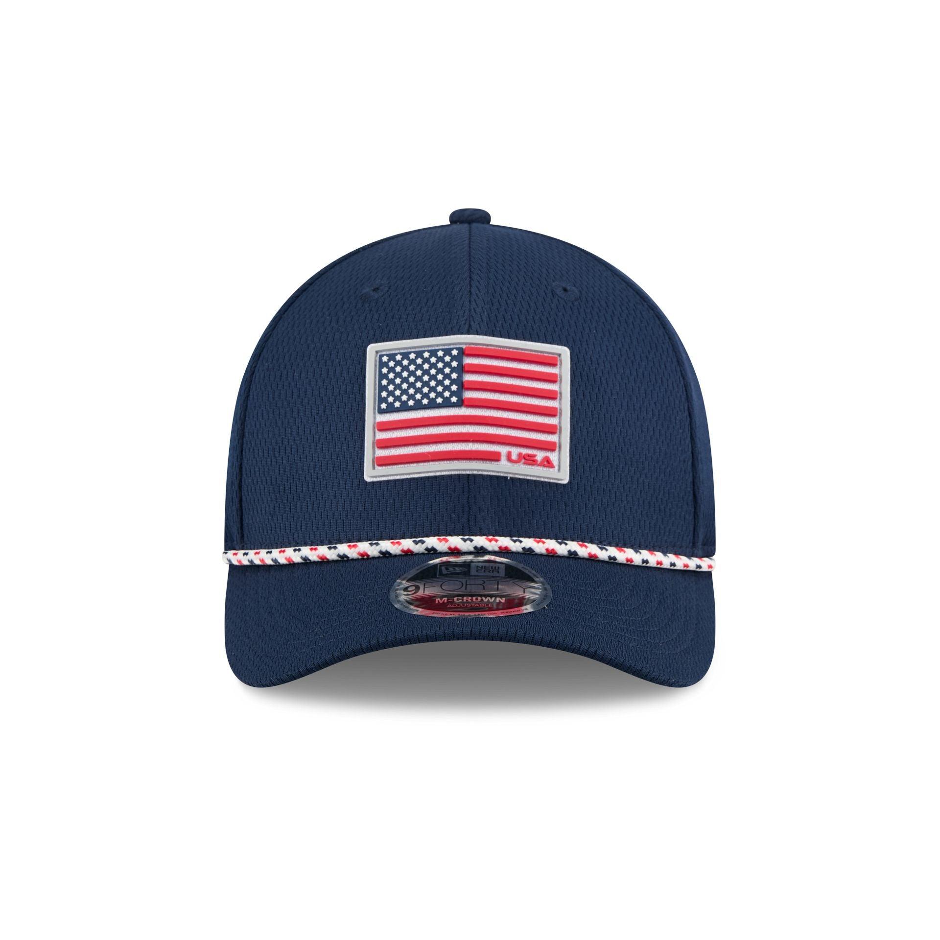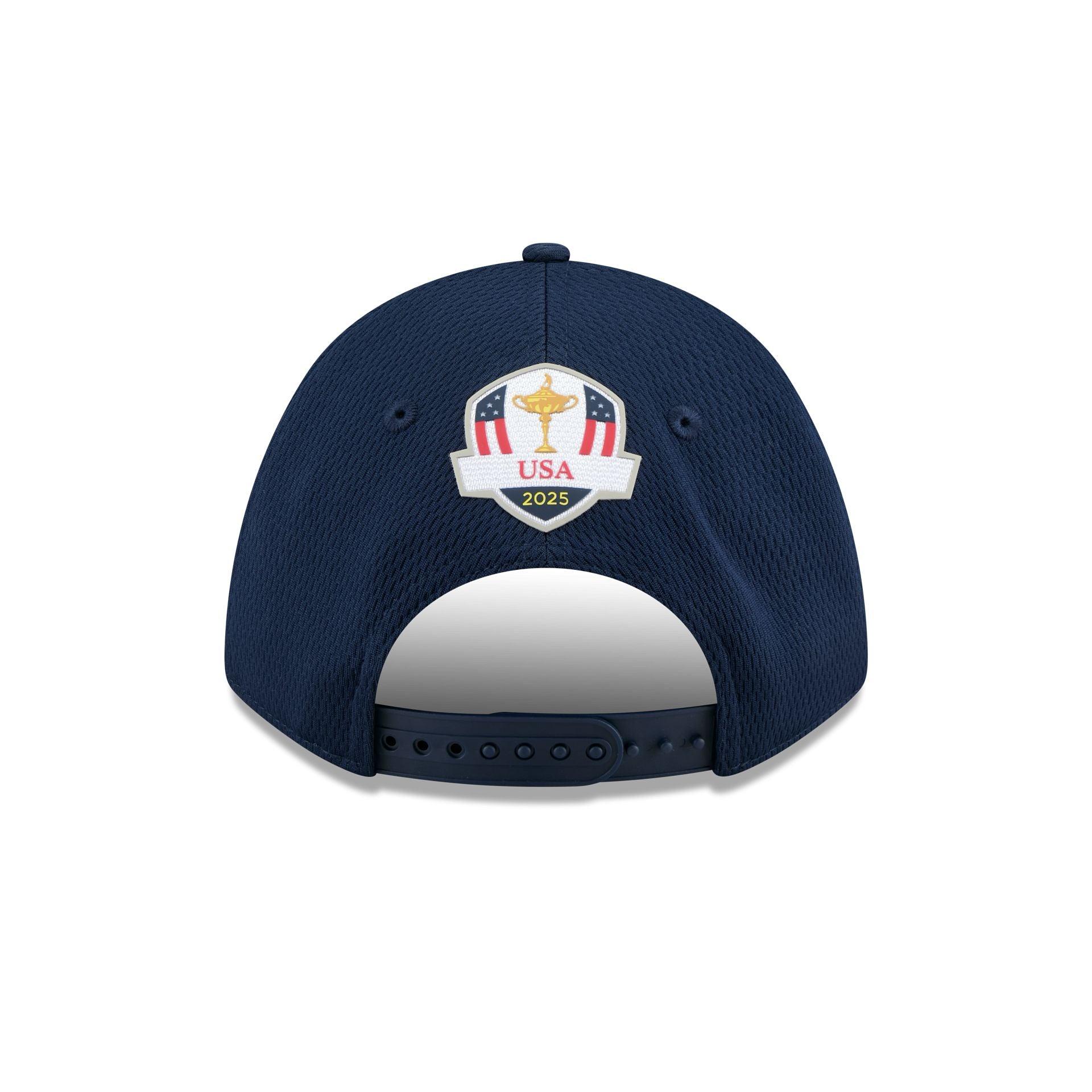 The 2025 Ryder Cup Team USA Flag 9FORTY M-Crown Snapback features a silicone Team USA Flag at the front panels with a Ryder Cup logo above an adjustable snapback closure at the rear. Additional details include embroidered stars at the right-wear side, a rope at the visor, and a gray undervisor.