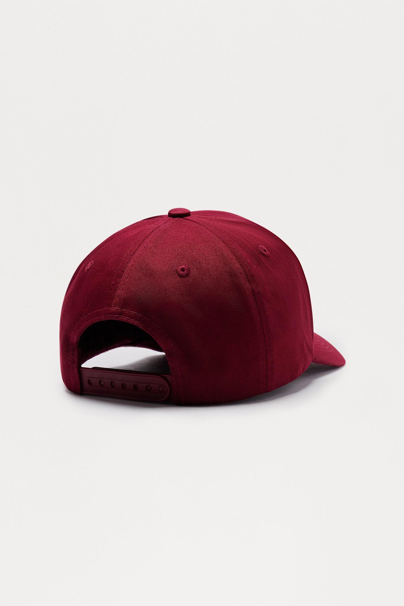 Available In Burgundy. 5 Panel Silhouette Structured Body Embroidered Detail Pearl Detail Curved Brim Adjustable Snapback Closure 100% Cotton Imported California Proposition 65WARNING: Cancer and Reproductive Harm - www.P65Warnings.ca.gov.