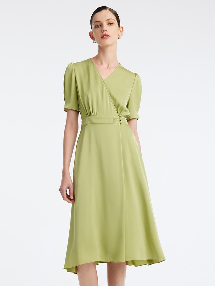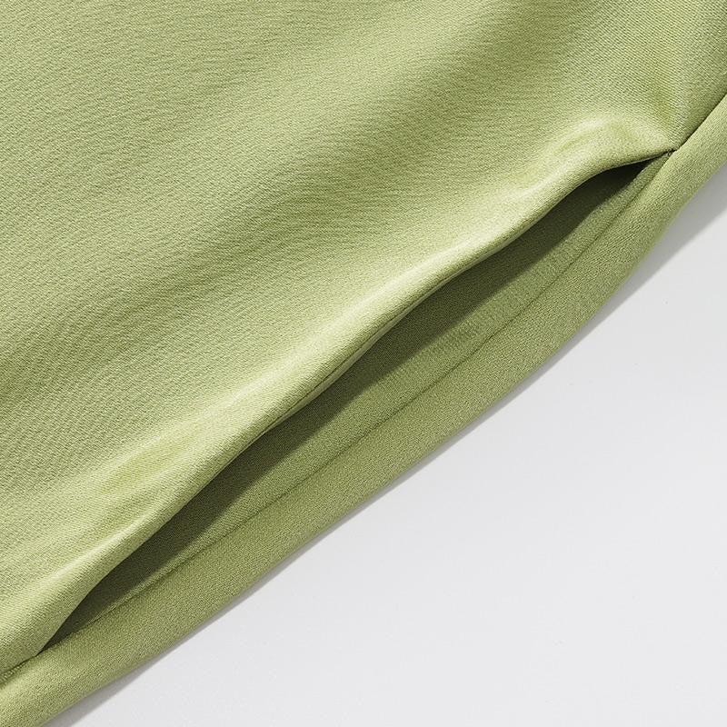 -22 Momme silk fabric -V-neck -A-line fit The dress is made of 22 momme silk fabric, which is soft, lightweight, and comfortable to wear. It features a cinched waist with an X-line fit, giving a slimming and figure-flattering effect. The cross V-neck design exposes the collarbone and enhances the neckline. 22 Momme V-N