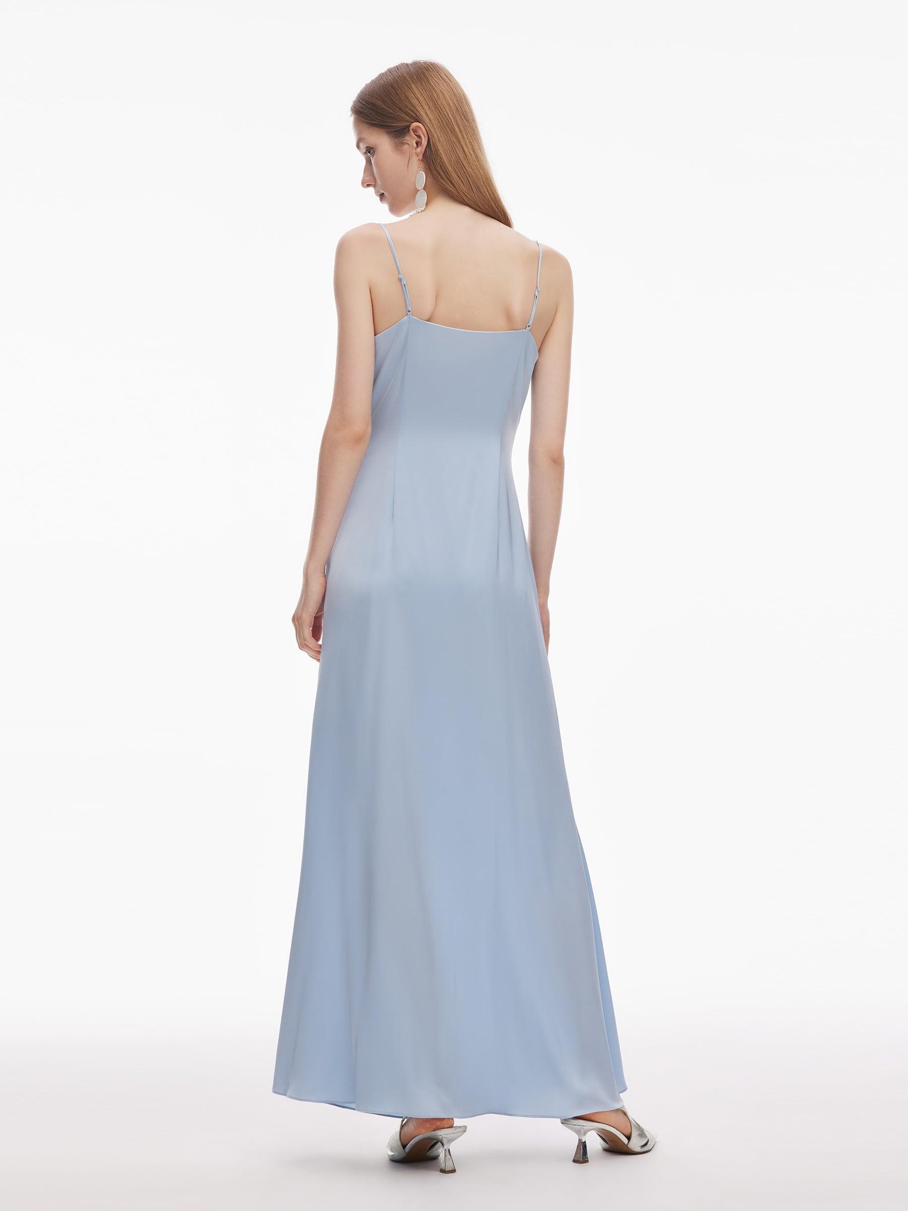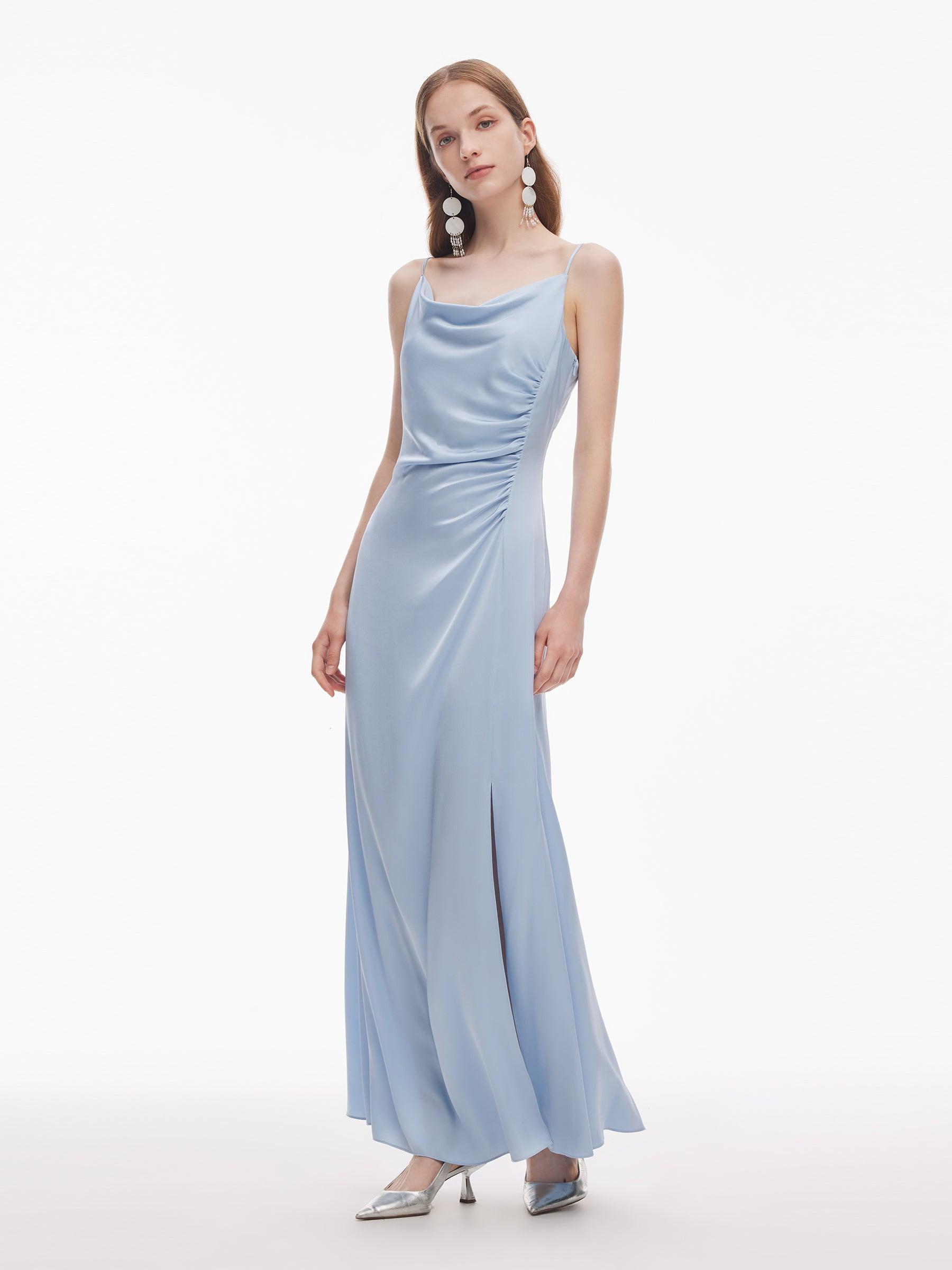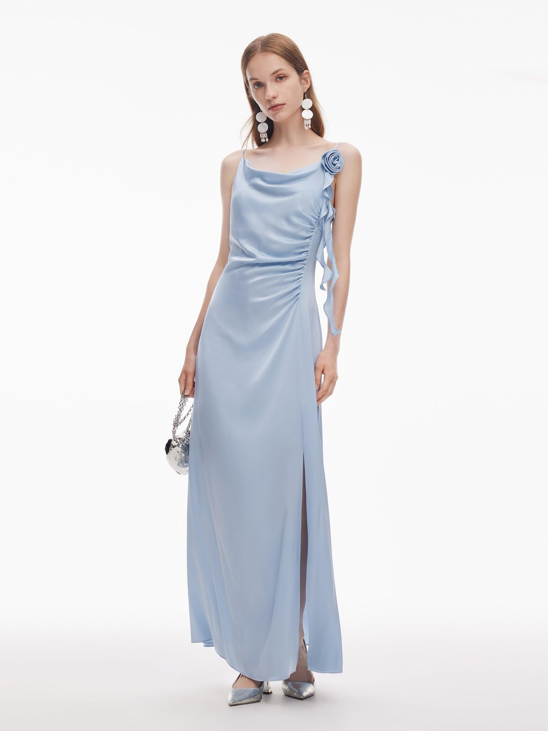 -22MM Stretchy Mulberry Silk -With detachable flower -With invisible side zipper With a detachable rose and a cowl neckline that flatters your neck,this maxi dress combines sensuality with practicality. A flowing silhouette with a fitted upper body and waist softly skims curves without constraint. The side slit introdu