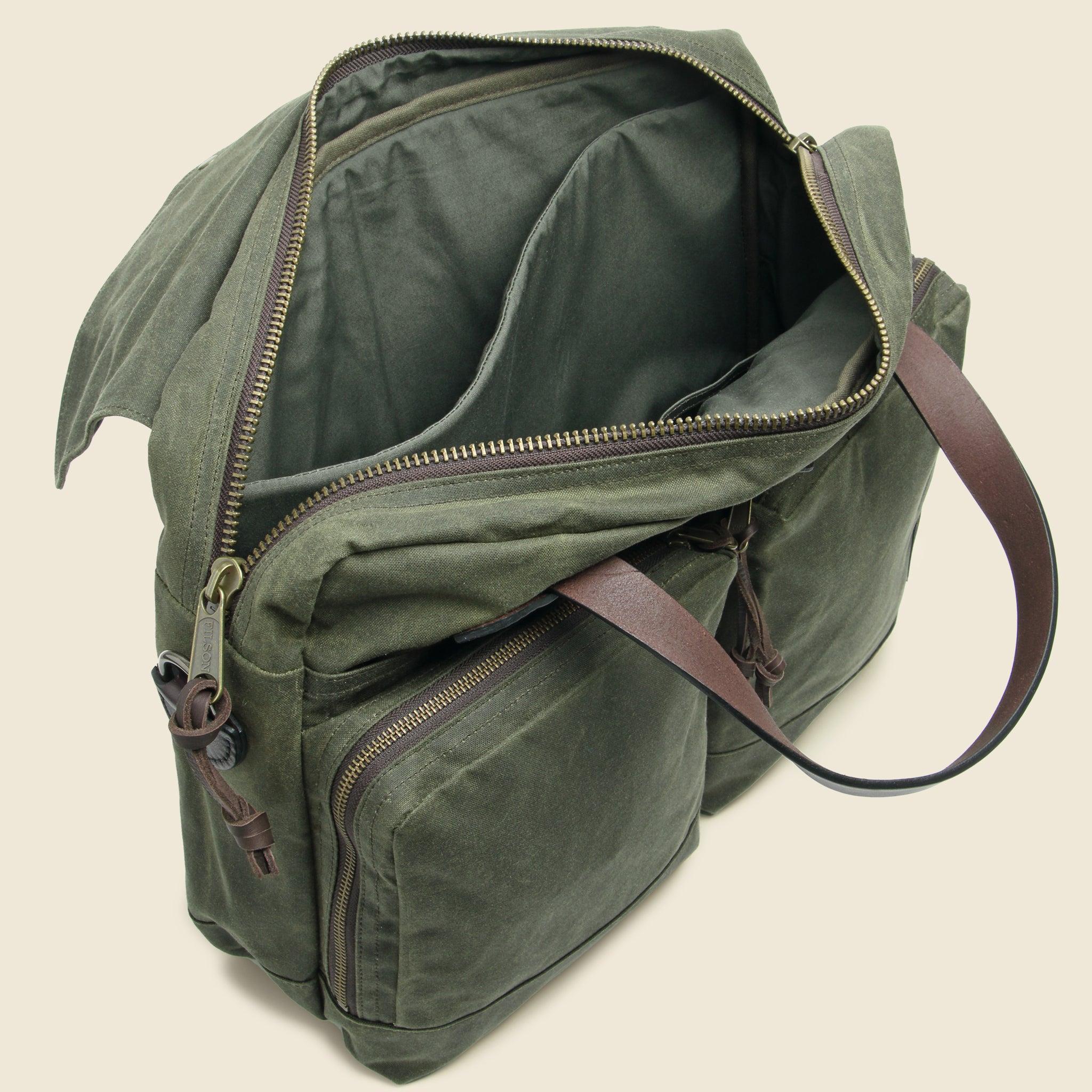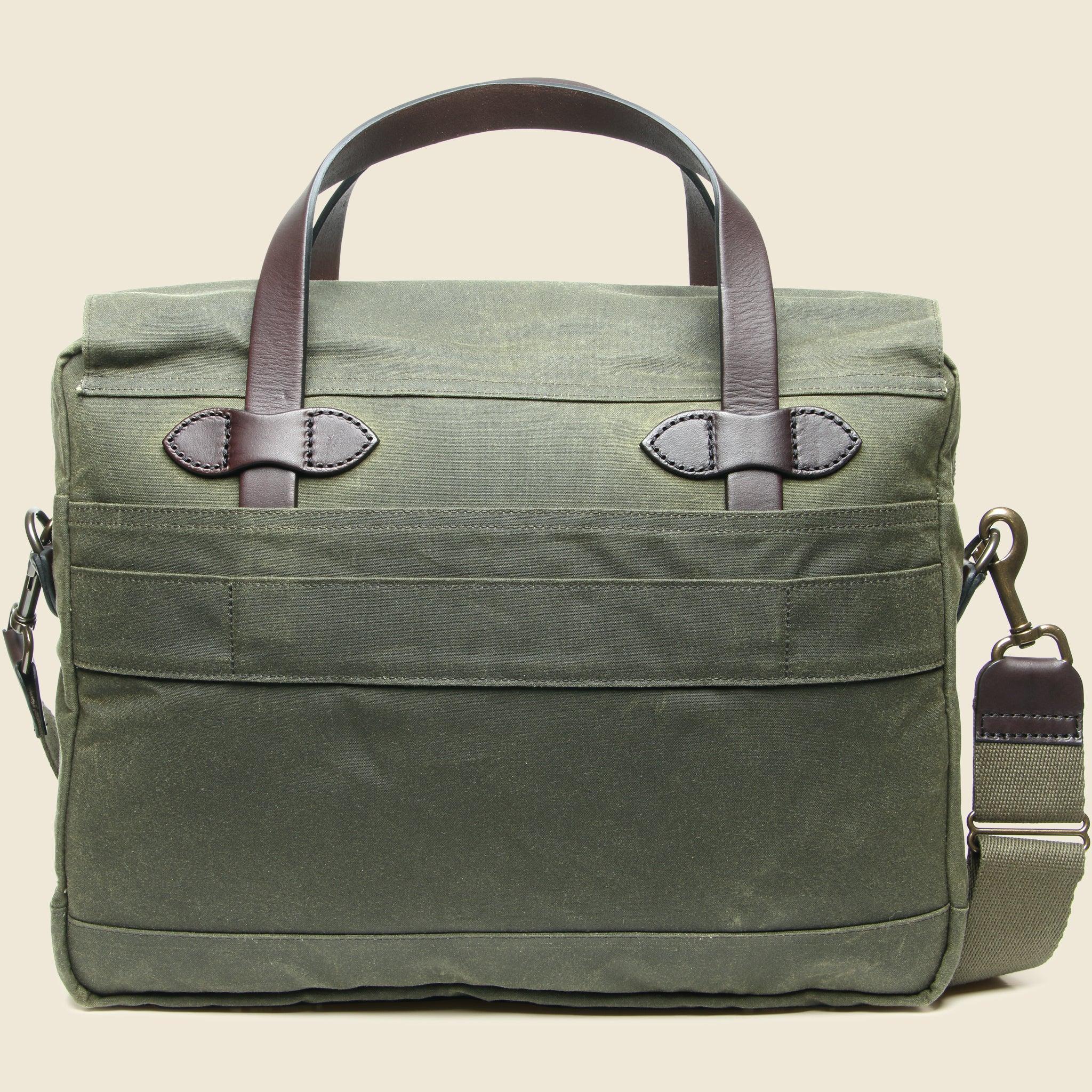 The 24 Hour Tin Cloth Briefcase is made with Filson's toughest waxed canvas. Able to withstand rain, snow, punctures, and tears, this briefcase is meant to travel and meant to last a lifetime. Sporting a versatile otter green color, and fully lined with cover cloth, the 24 Hour Briefcase is sure to stay sharp for years to come. Weather-repellant heavyweight waxed canvas Storm-flap top with snap closure Interior dividers and pockets Holds up to a 15" standard laptop Adjustable cotton shoulder strap Bridle leather handles and body tab details Materials: 100% waxed cotton canvasDimensions: 16" W x 12"H x 5.5" D