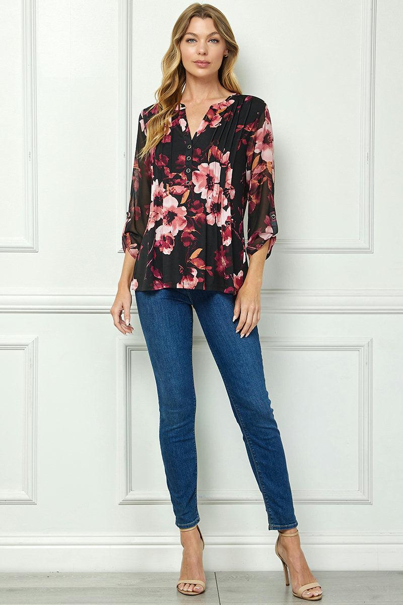 3/4 Button Tab Sleeve Pintuck Mandarin Collar Popover Blouse in Black