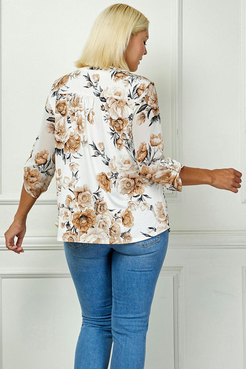The 3/4 button tab sleeves offer versatile styling—wear them rolled up for a casual touch or down for a more polished finish. Designed in a soft mix-media fabric that drapes beautifully, this piece transitions seamlessly from work to weekend.