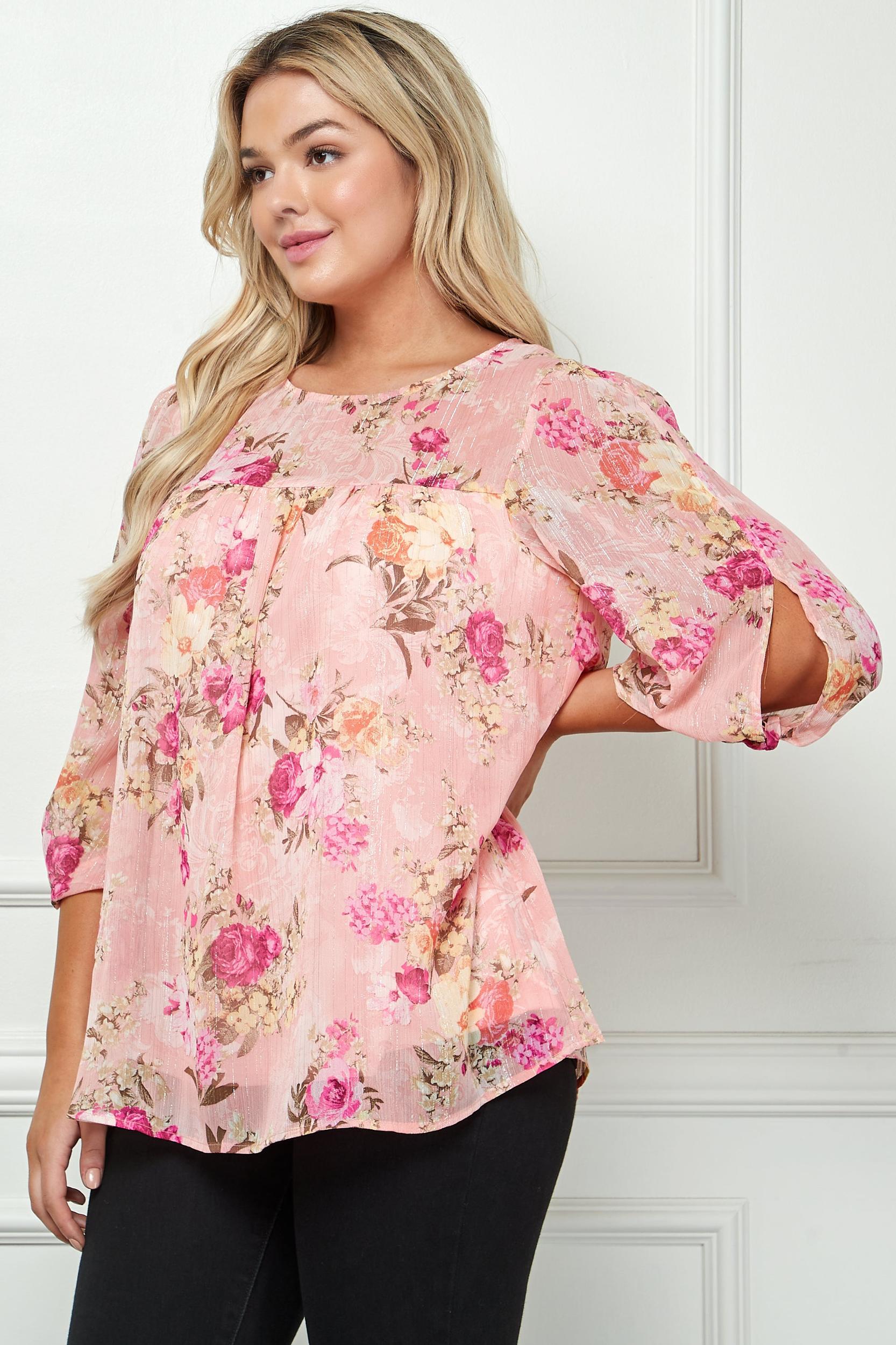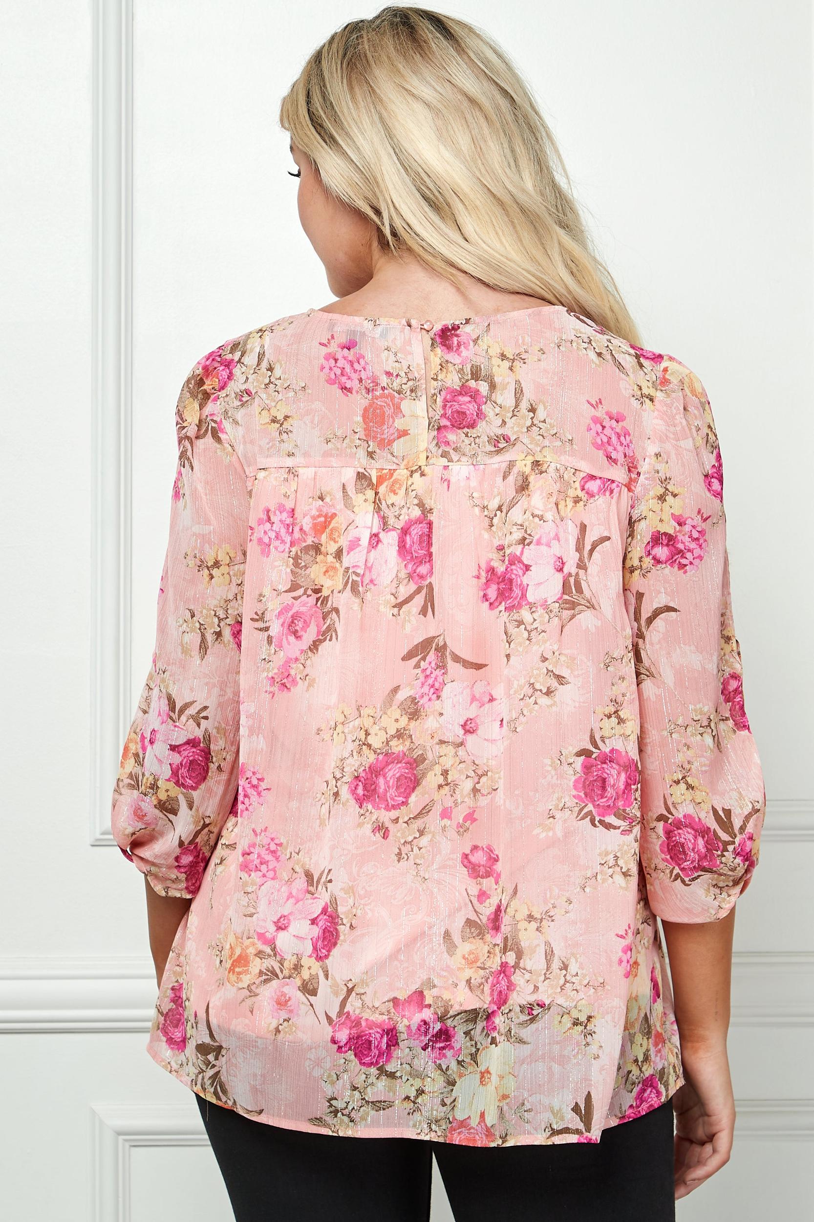 3/4 Knot Sleeve Front & Back Yoke Lined Blouse in Print Chiffon Yoryu with Varigated Stripe Lurex, beautiful floral print and colors complete its elegance.