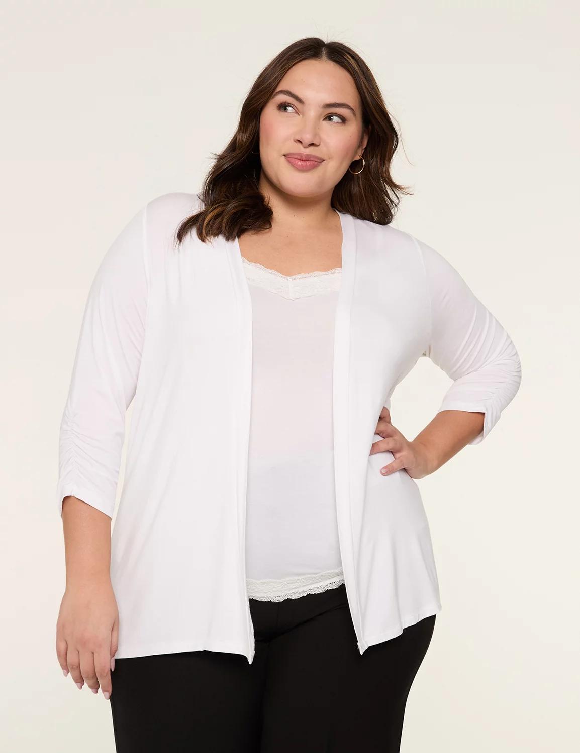 Available in Plus Size Looking for a no-fuss layer that perfectly pairs with everything? Presenting this open-front overpiece with ruched sleeves. FIT: Classic. Designed for curves and a not-too-tight, not-too-loose, just-right fit. Front Body Length From Shoulder: 31 (On Size 18), Extended: 33 Longer length is perfect for added coverage FEATURES: Open front 3/4 ruched sleeves FABRIC: Soft, stretchy jersey knit Machine Wash 95% Rayon/5% Spandex Item Number #405118 Imported Plus Size Top . Plu