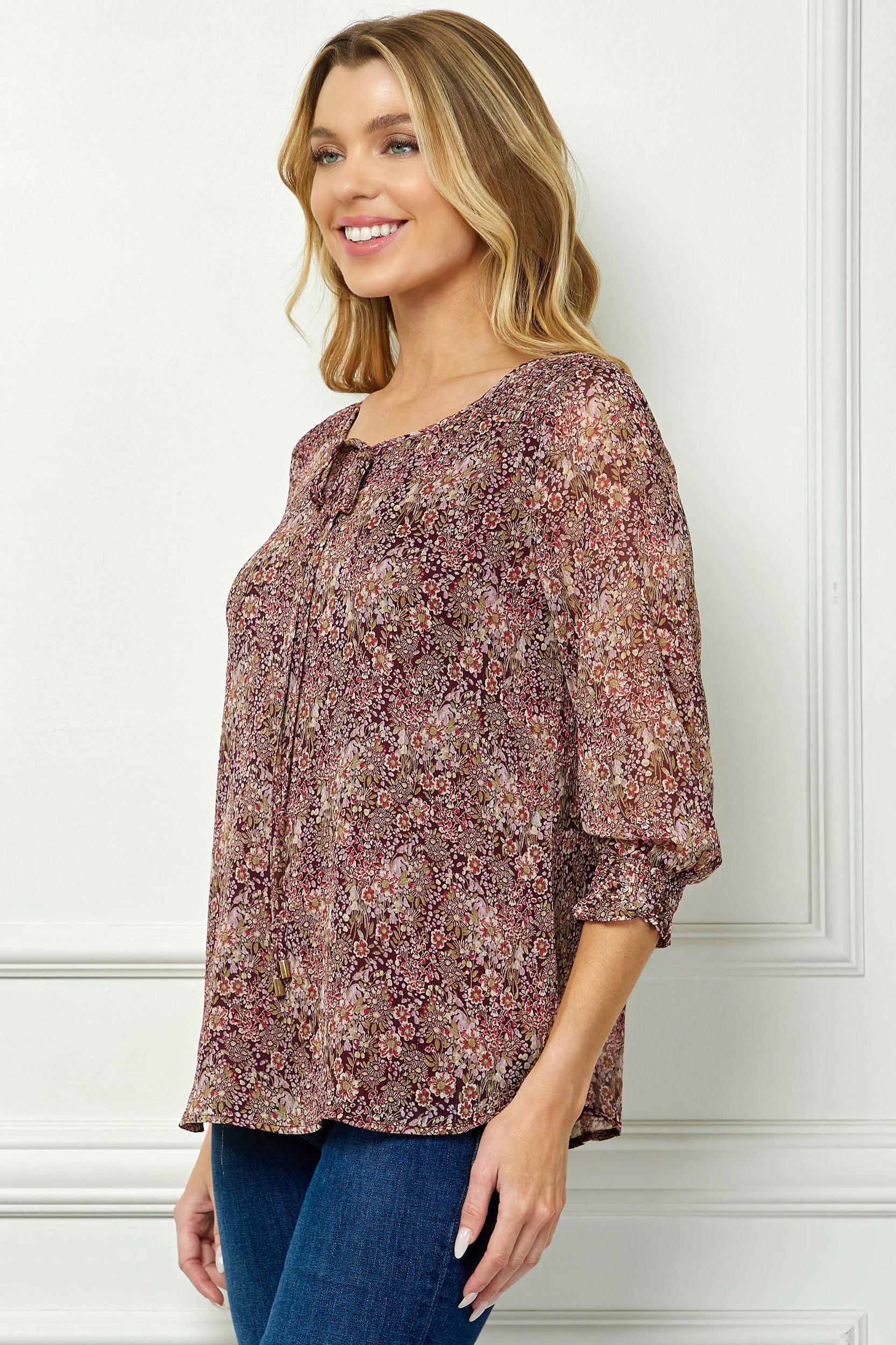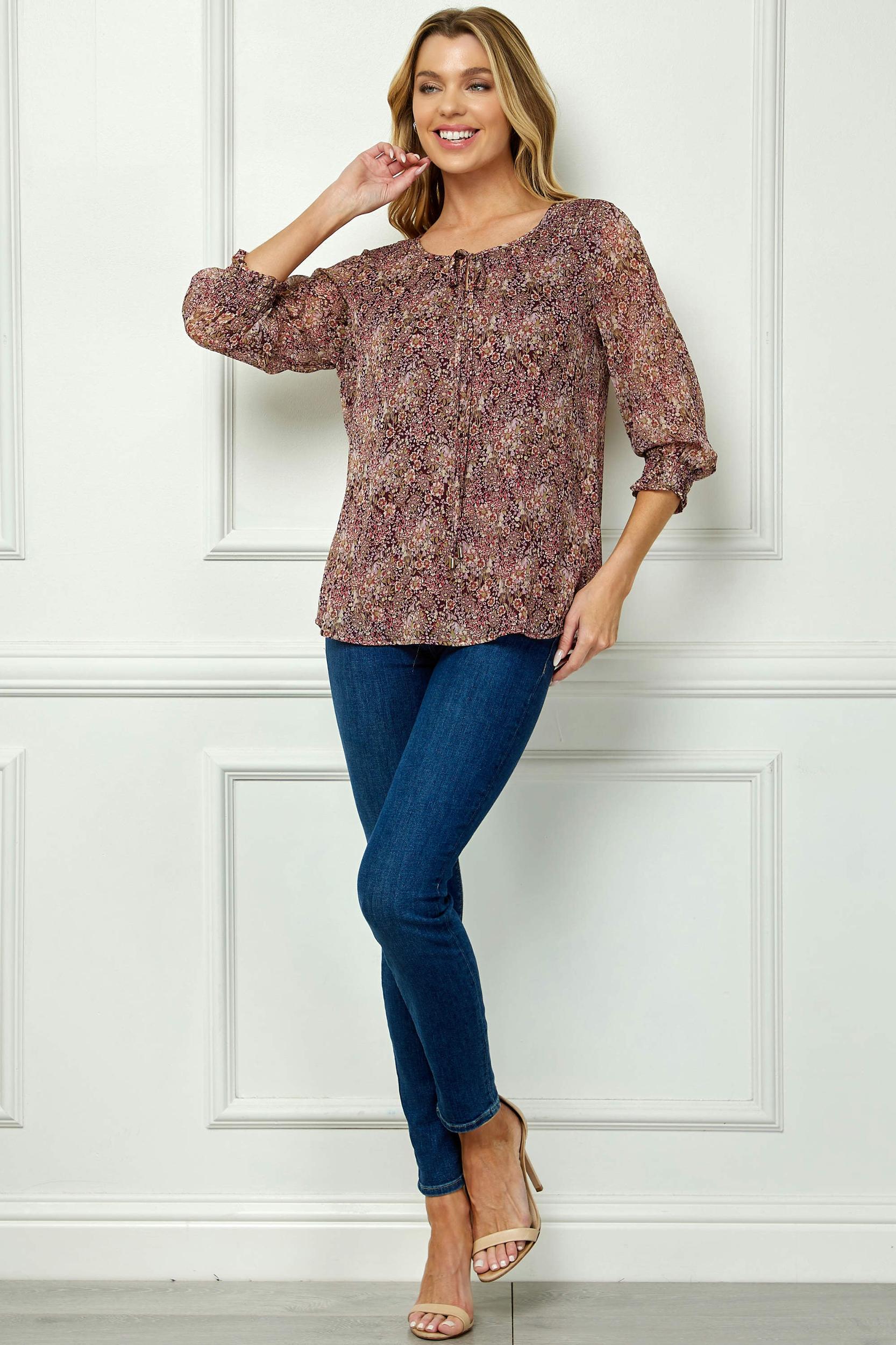 The smocked shoulders and sleeves bring texture and shape, while the 3/4 length sleeves provide easy, all-day wear. A delicate beaded tie front neckline adds just the right amount of detail, making this top versatile enough for both casual outings and polished occasions. Pair it with jeans for a relaxed look or with skirts and trousers for something more refined.