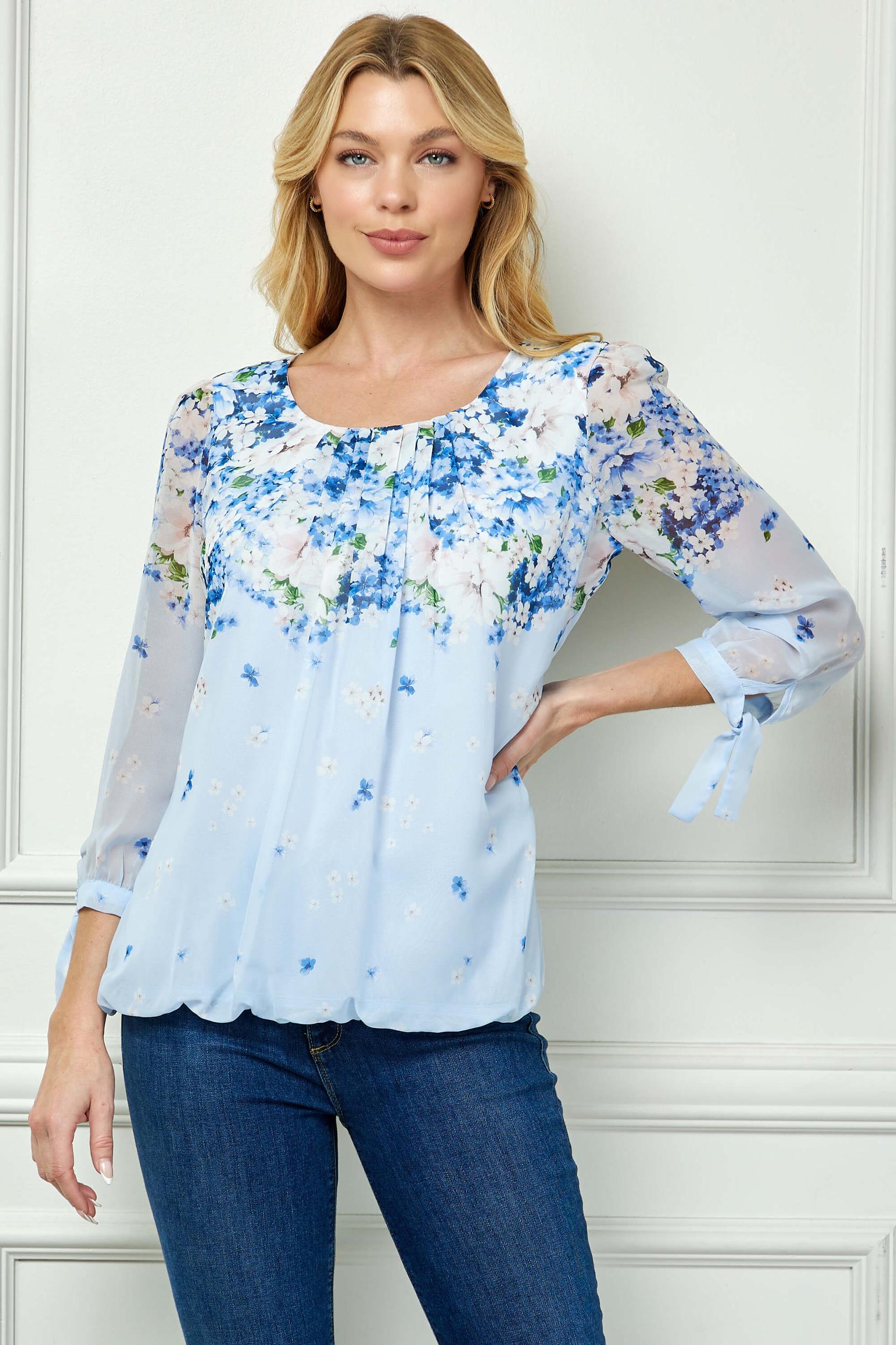 Refined and effortlessly wearable, this blouse blends feminine detail with a flattering, polished silhouette. The softly pleated scoop neckline adds texture and elegance, while the border print creates a beautifully finished look that feels both classic and modern.