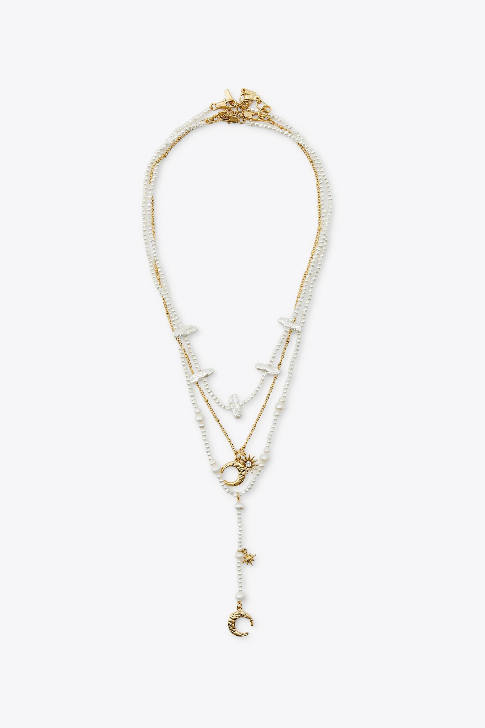 - Pearl necklace in varying sizes. Metal pendants in the shape of a carved moon and star. Lobster clasp closure.