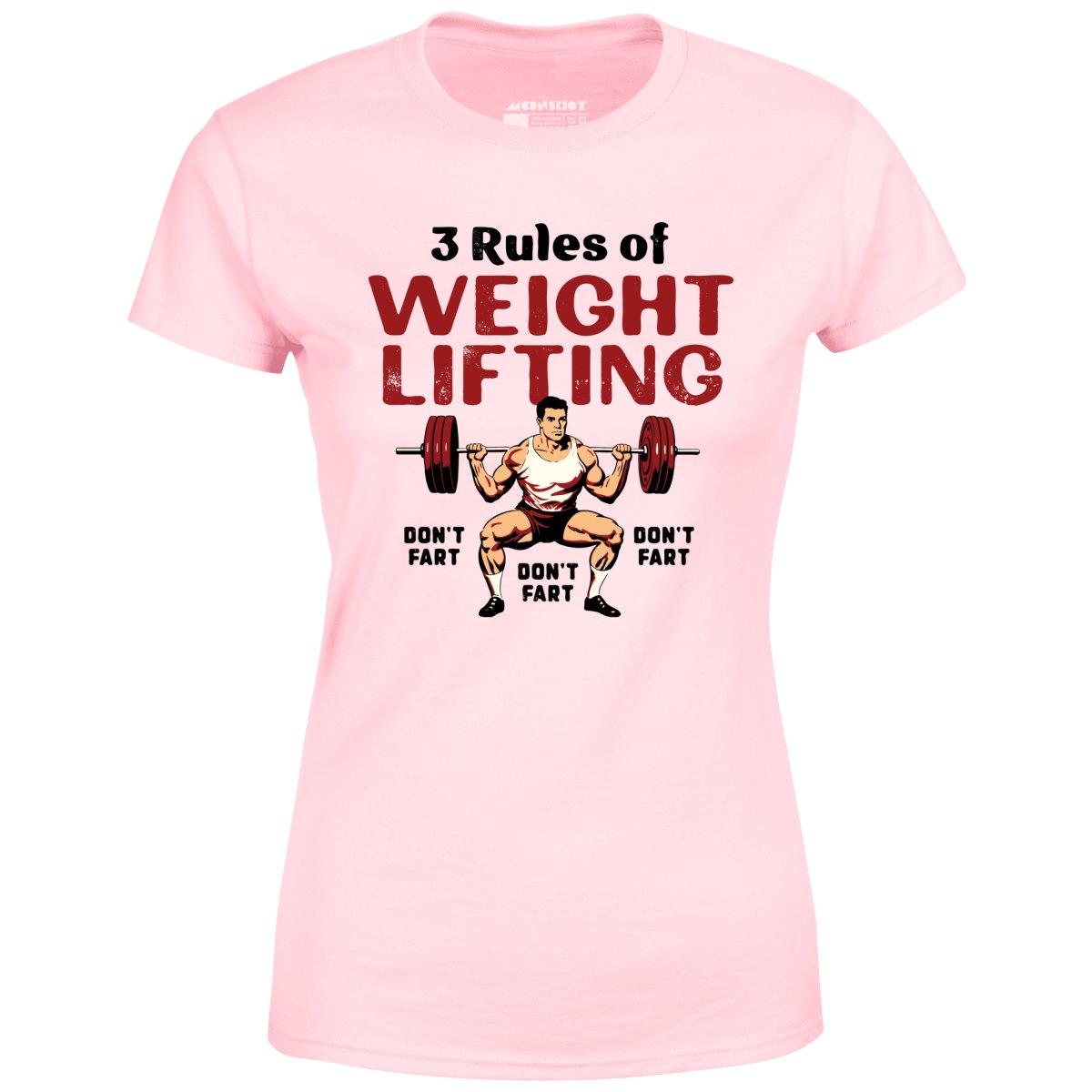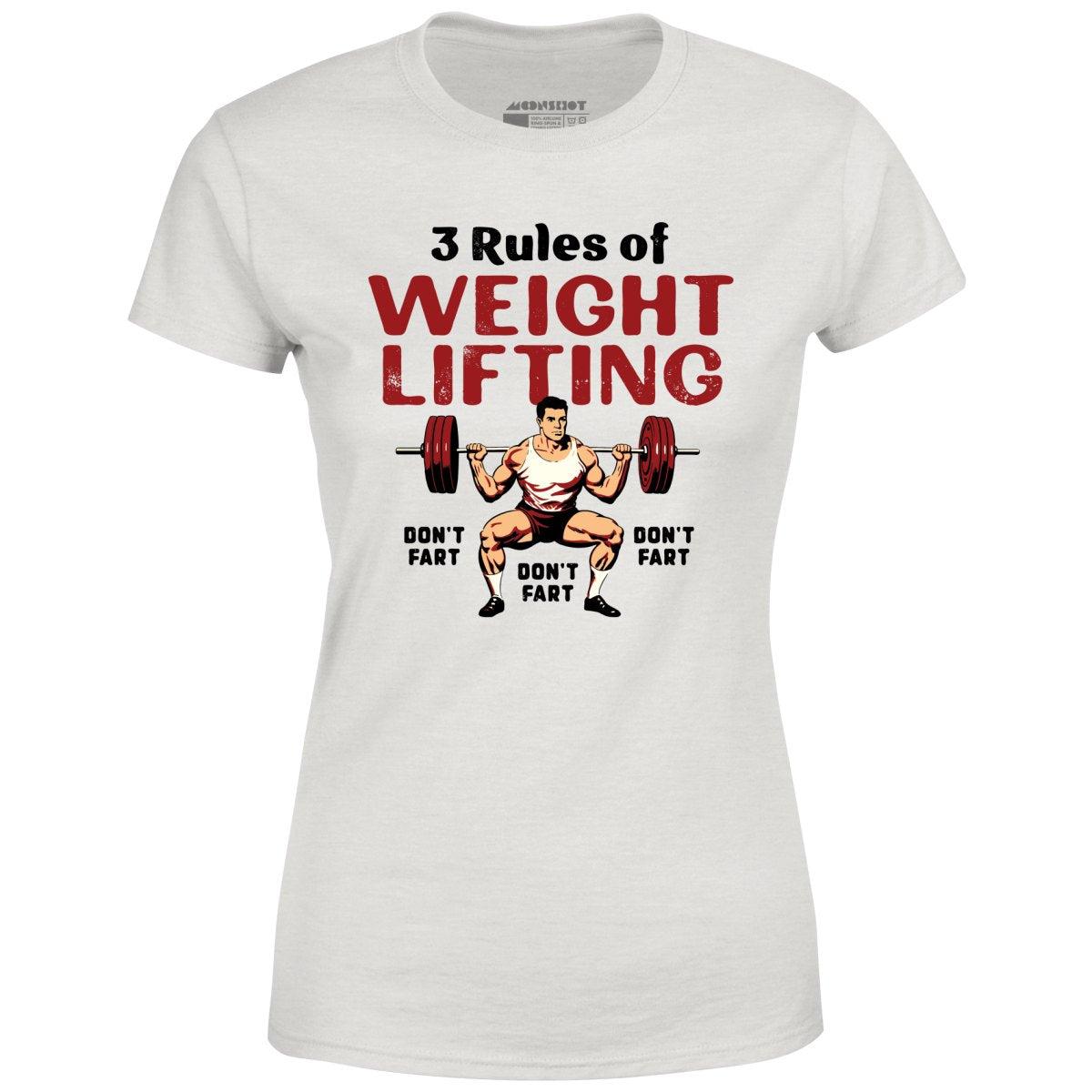 The 3 rules of weightlifting. Don't fart! Don't fart! Don't fart! Printed on our super soft 100% ringspun & combed cotton women's T-Shirt. Or upgrade to our Luxury 52/48 cotton/poly vintage heather edition for an even softer classic look. We print & ship all of our high quality graphic tees in the USA.