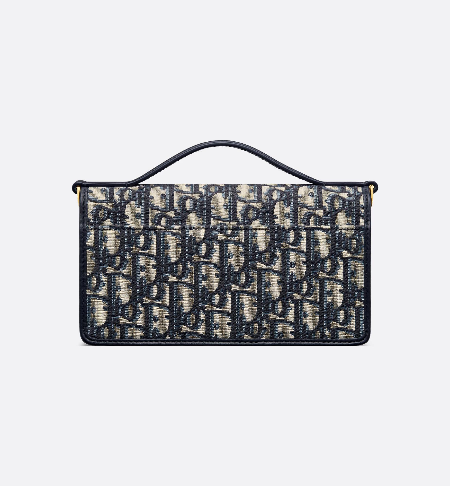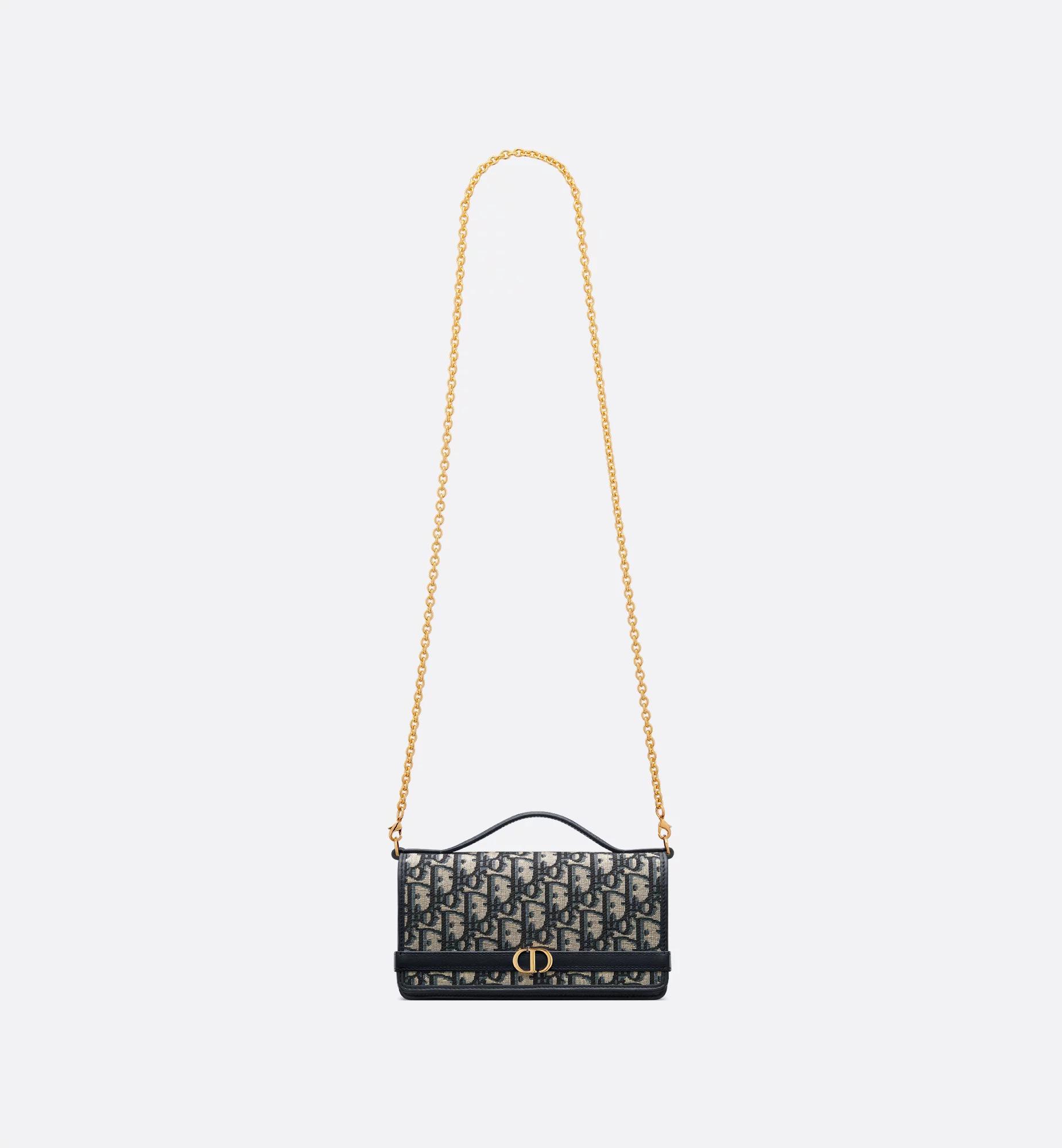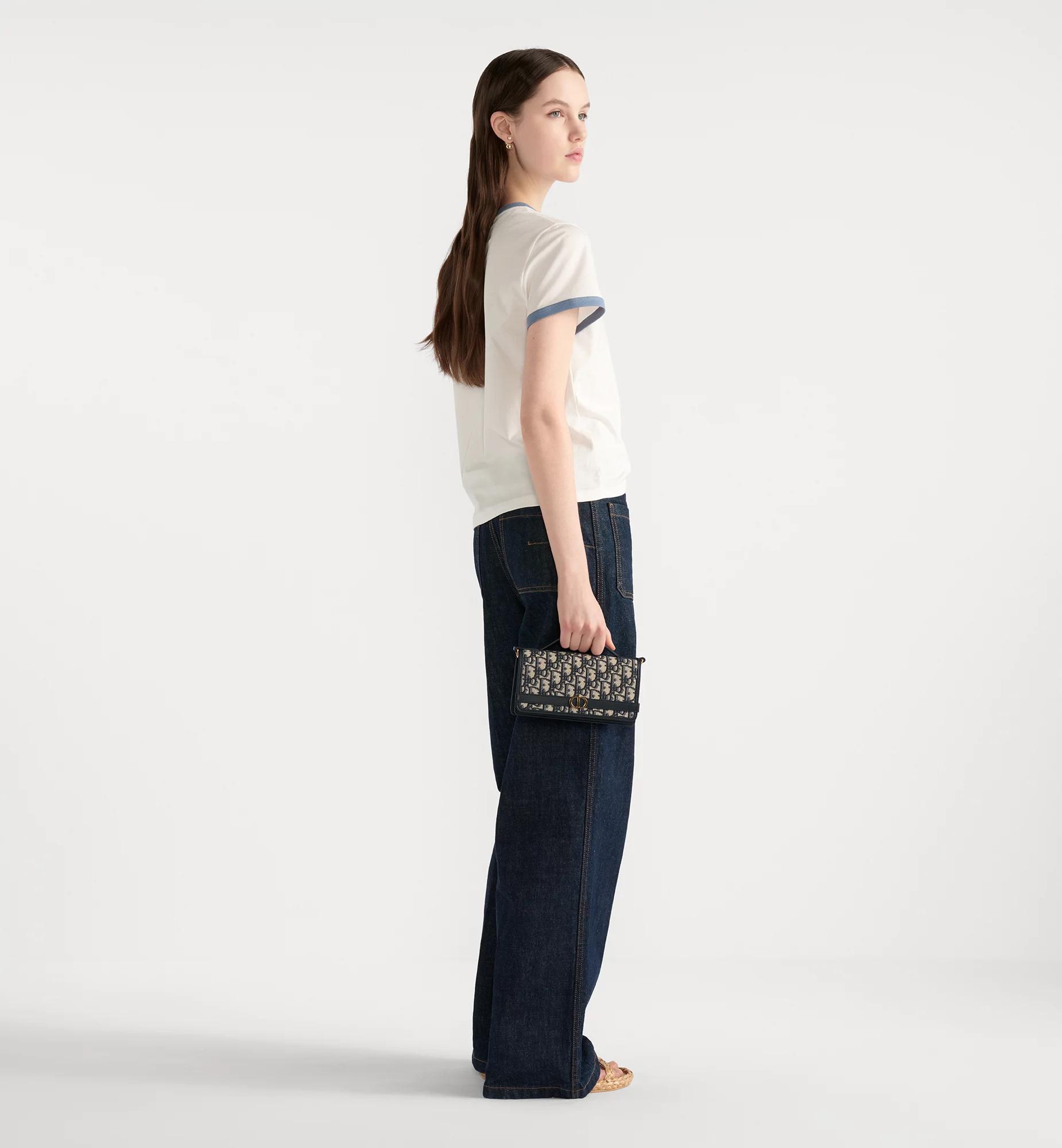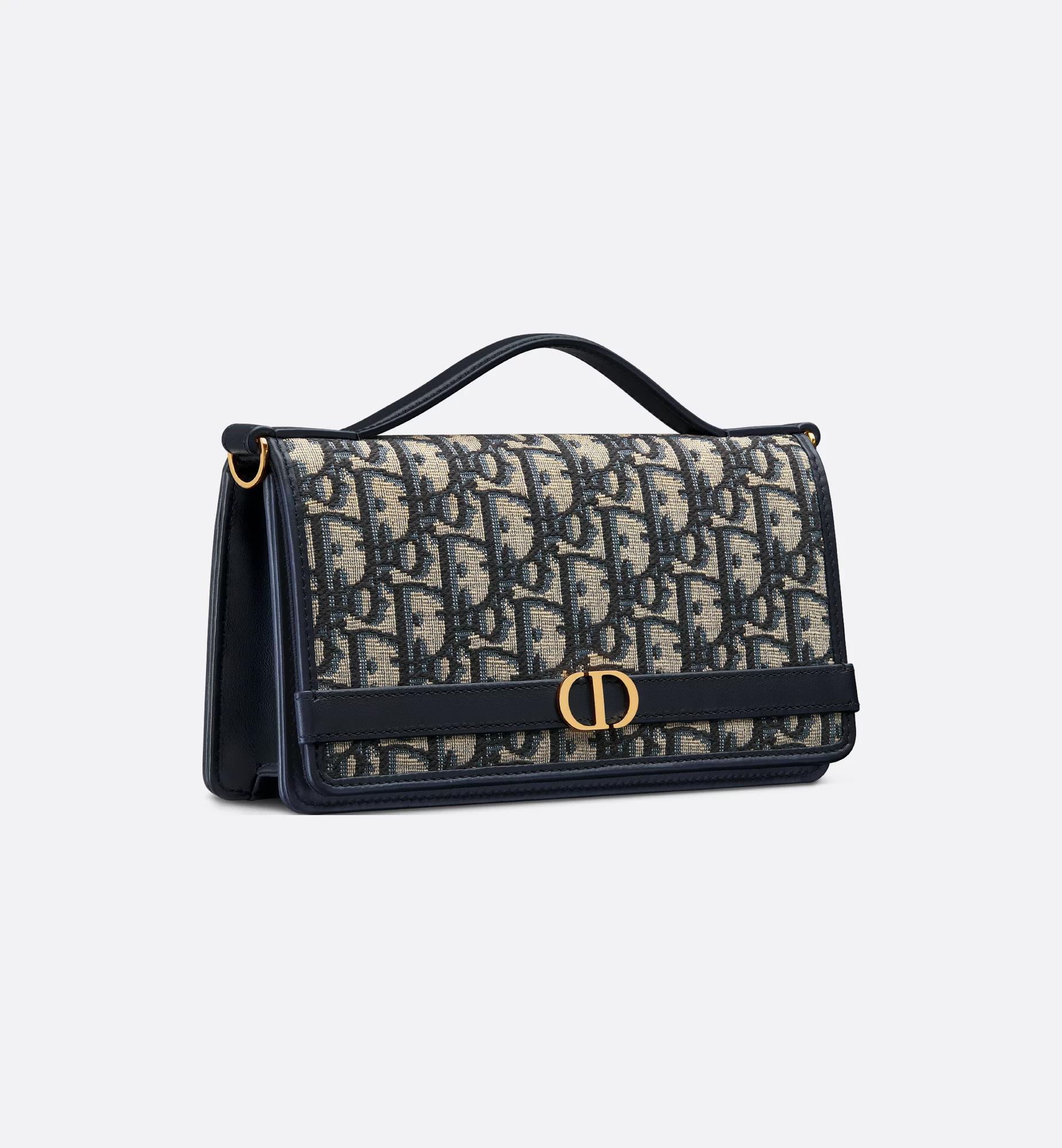 New for Fall 2025, the sophisticated Cigale pouch with chain enhances the 30 Montaigne line with a compact and practical design. Crafted in blue Dior Oblique jacquard, it features a flap embellished with a decorative blue calfskin strap adorned with an antique gold-finish metal CD signature. The compartment with card slots, along with the rear slip pocket, will hold all the essentials, while the removable chain and leather top handle allow the bag to be elegantly carried by hand, worn over the shoulder or crossbody. Main composition: cotton and calfskin. Cotton, calfskin and technical fabric lining. CD signature on the front. Flap closure. Interior compartment. Rear slip pocket. Three card slots. Leather top handle. Removable chain strap. Dust bag included. Made in Italy