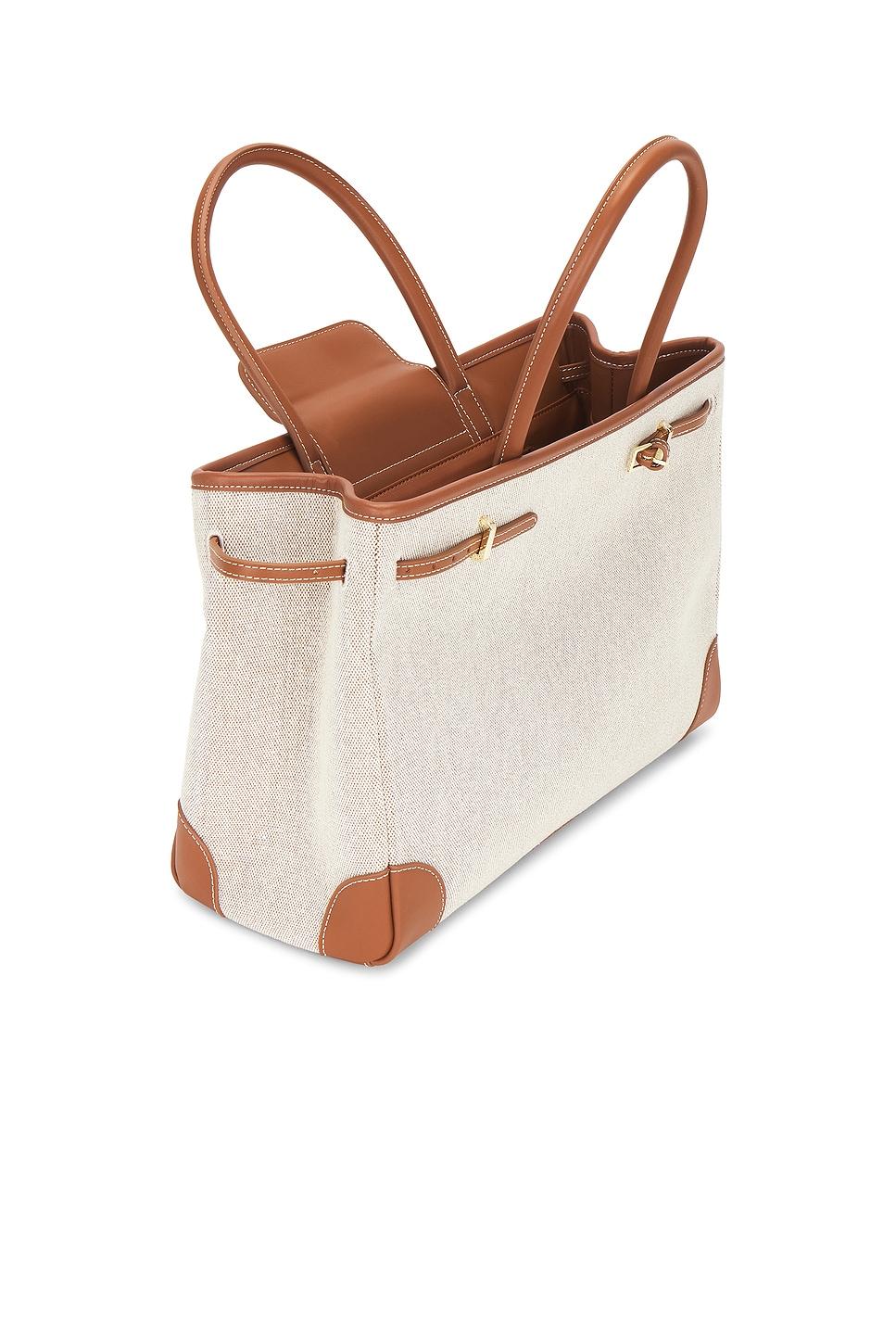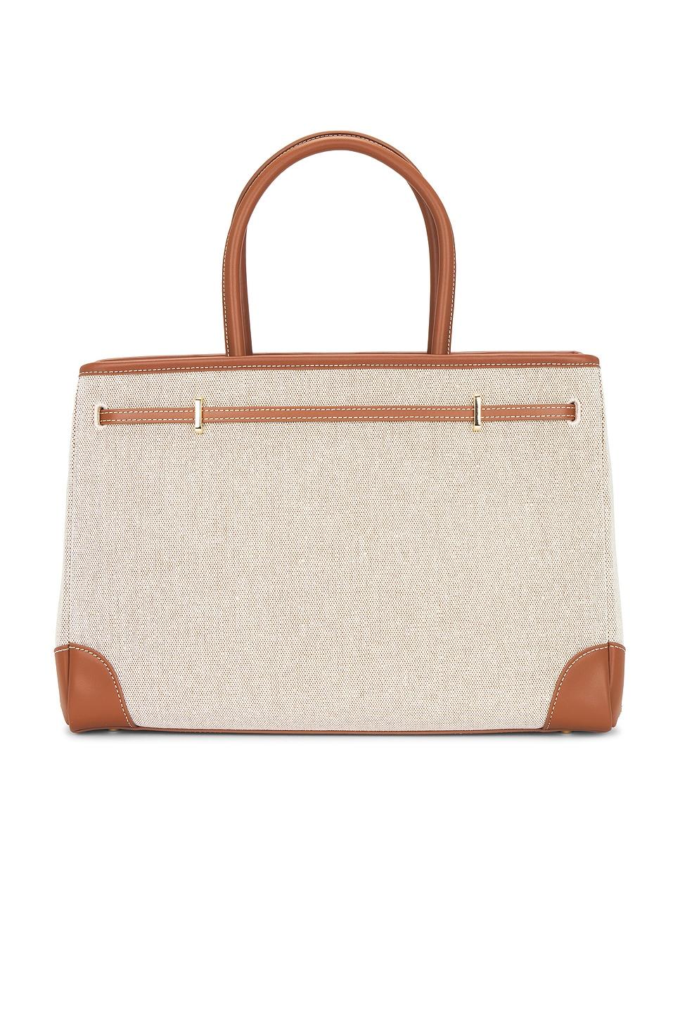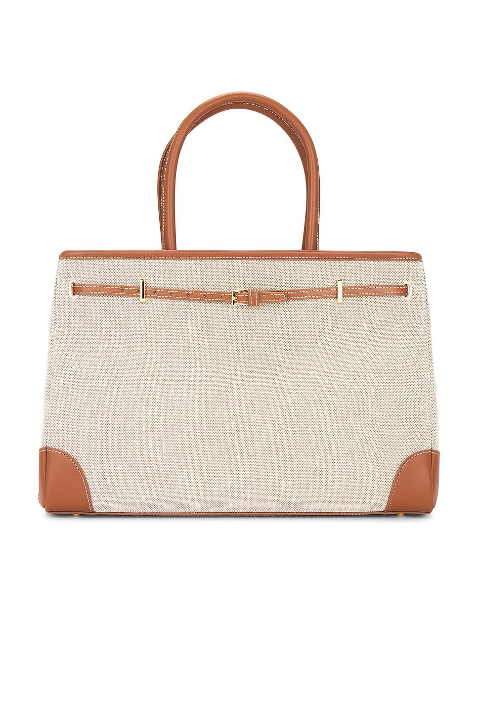 Canvas exterior with faux leather trim and faux leather lining. Top magnetic button closure. One main compartment. Interior zipper and slip pockets. Belted detail. Detachable and adjustable faux leather shoulder strap. Measures approx 13.25" W x 9.5" H x 5.25" DShoulder strap with a 15.5" dropTop handle with a 6" drop. Made in China. Revolve Style No. VAFI-WY28. Manufacturer Style No. Canvas Book Tote Bag 33.