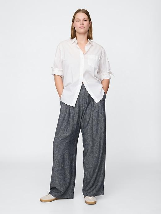 Soft, heavyweight linen-blend pleated trousers. E-waist with concealed hook and bar closure, zip fly. Front slant pockets, back welt pockets. Certain styles have allover prints. This product was made in a factory that invests in gender equality and women’s empowerment. Through RISE (Reimagining Industry to Support Equality) and Gap Inc.’s program P.A.C.E. (Personal Advancement & Career Enhancement), we support people who make our clothes to build the skills, knowledge, confidence, and resilience needed to advance in work and life. Learn more here. #713998