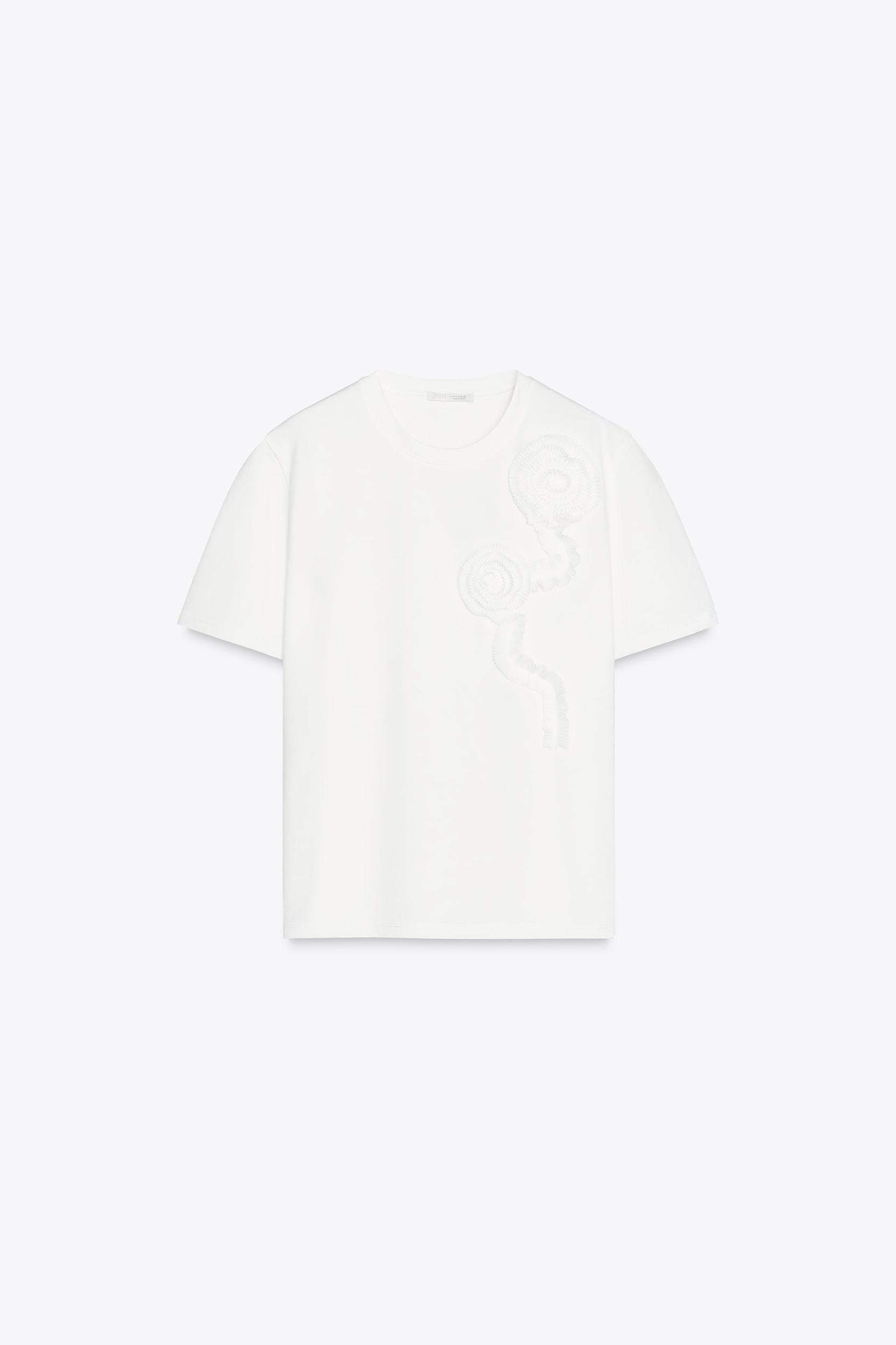 MIDWEIGHT - REGULAR FIT - ROUND NECK - NORMAL LENGTH - SHORT SLEEVE Cotton T-shirt. Round neck and short sleeves. Front tonal 3D floral detail.
