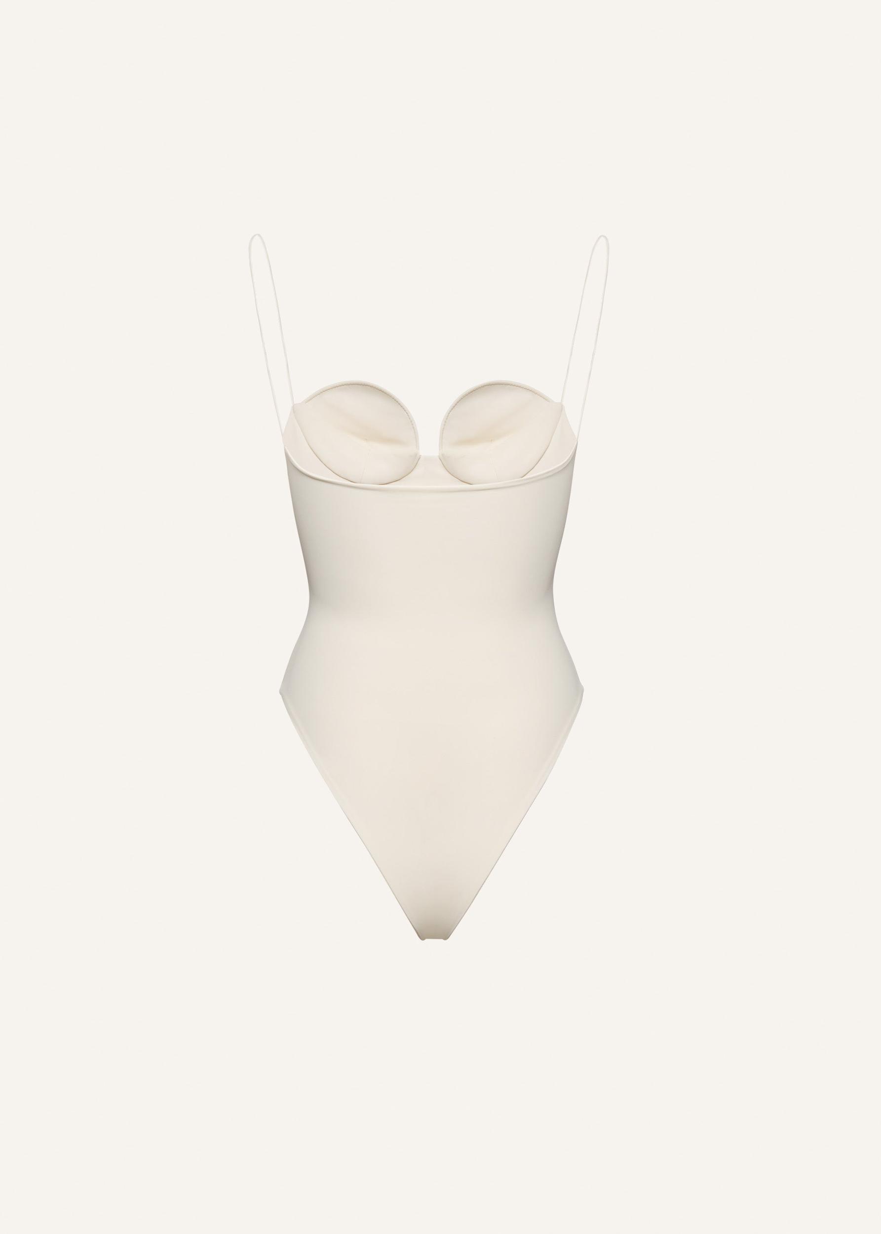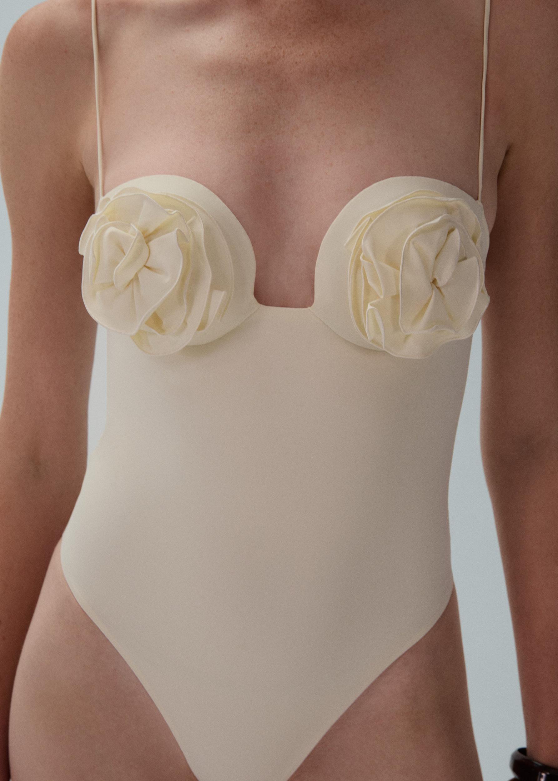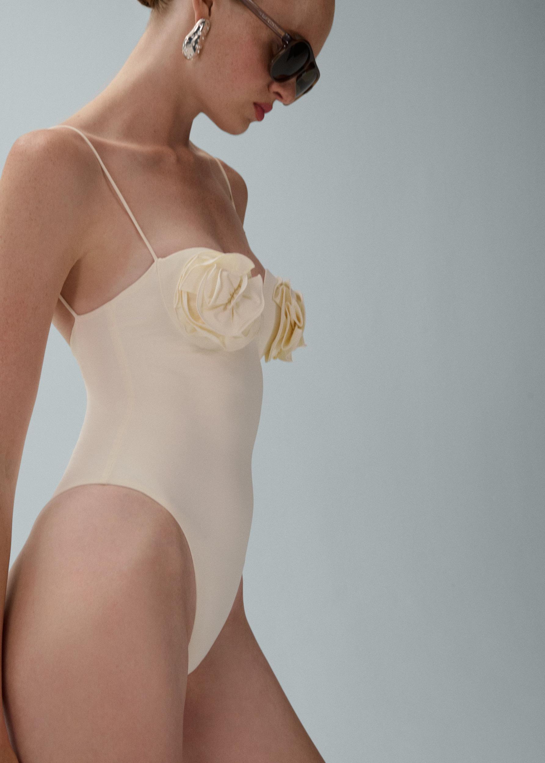 Signature to Magda Butrym's swimwear collection is a retro one piece swimsuit with a high leg, bustier underwire bra, and thin straps, which converts into a bodysuit. This season, the bustier style features 3D flowers on each of the bra cups.
