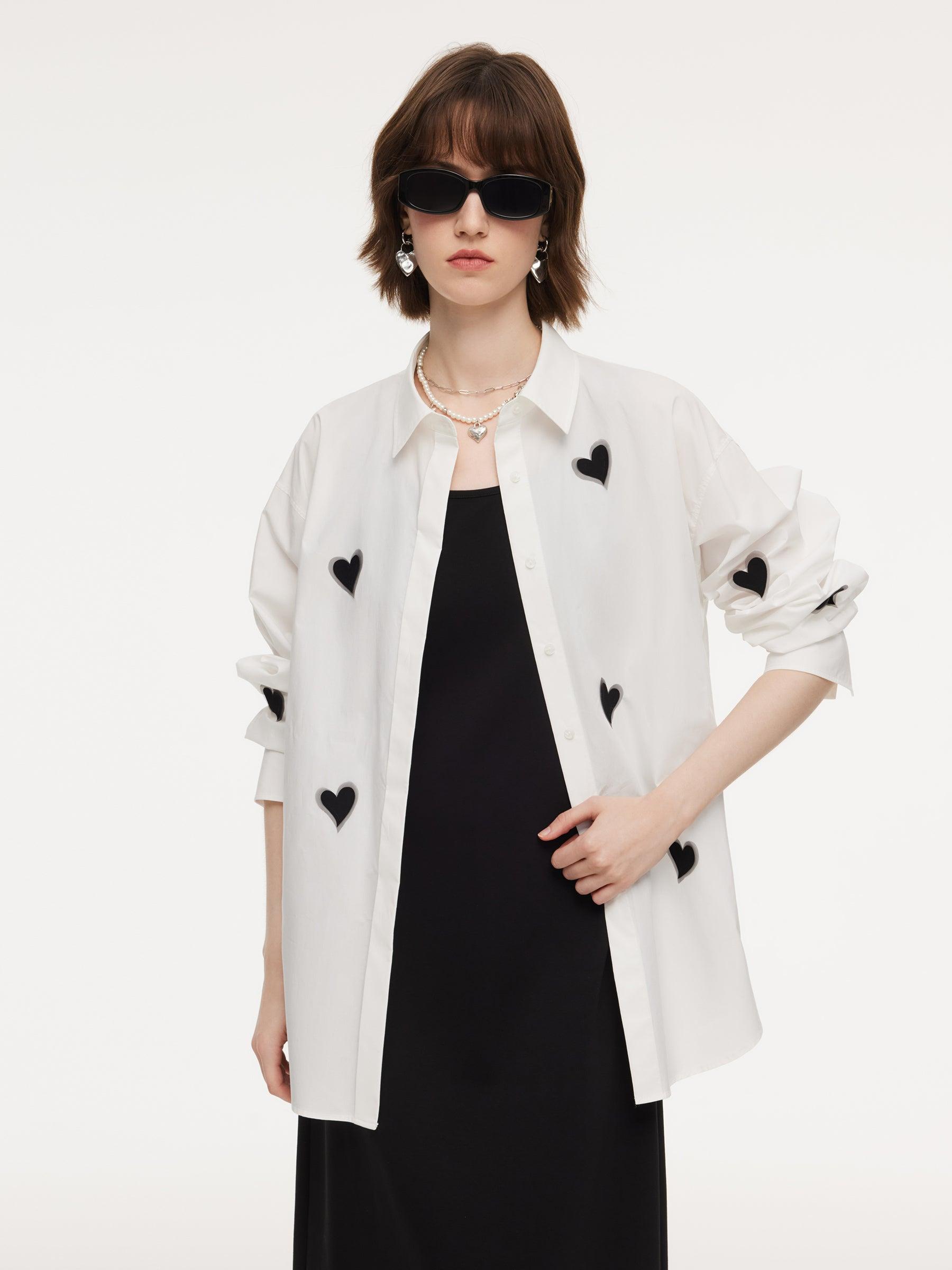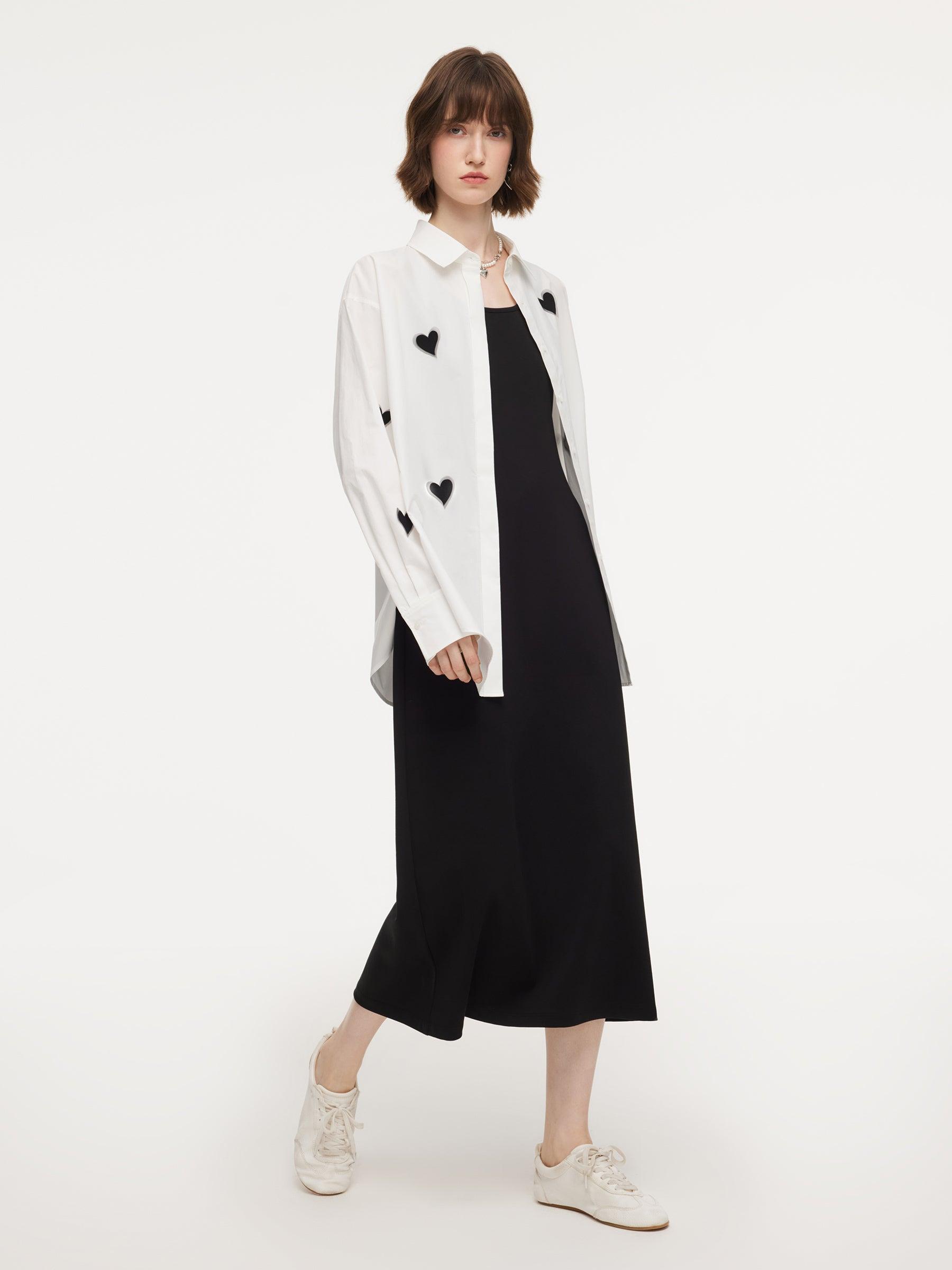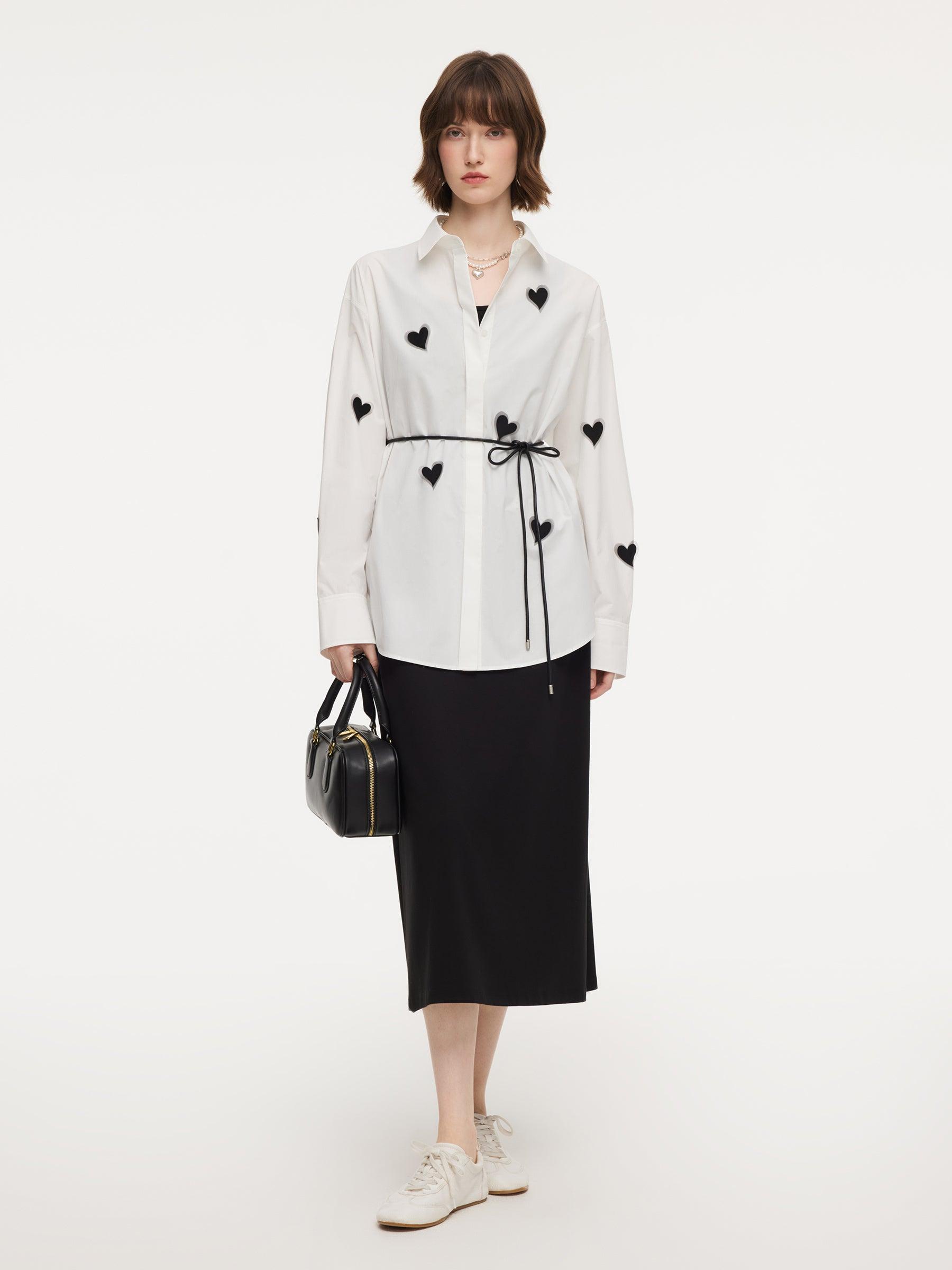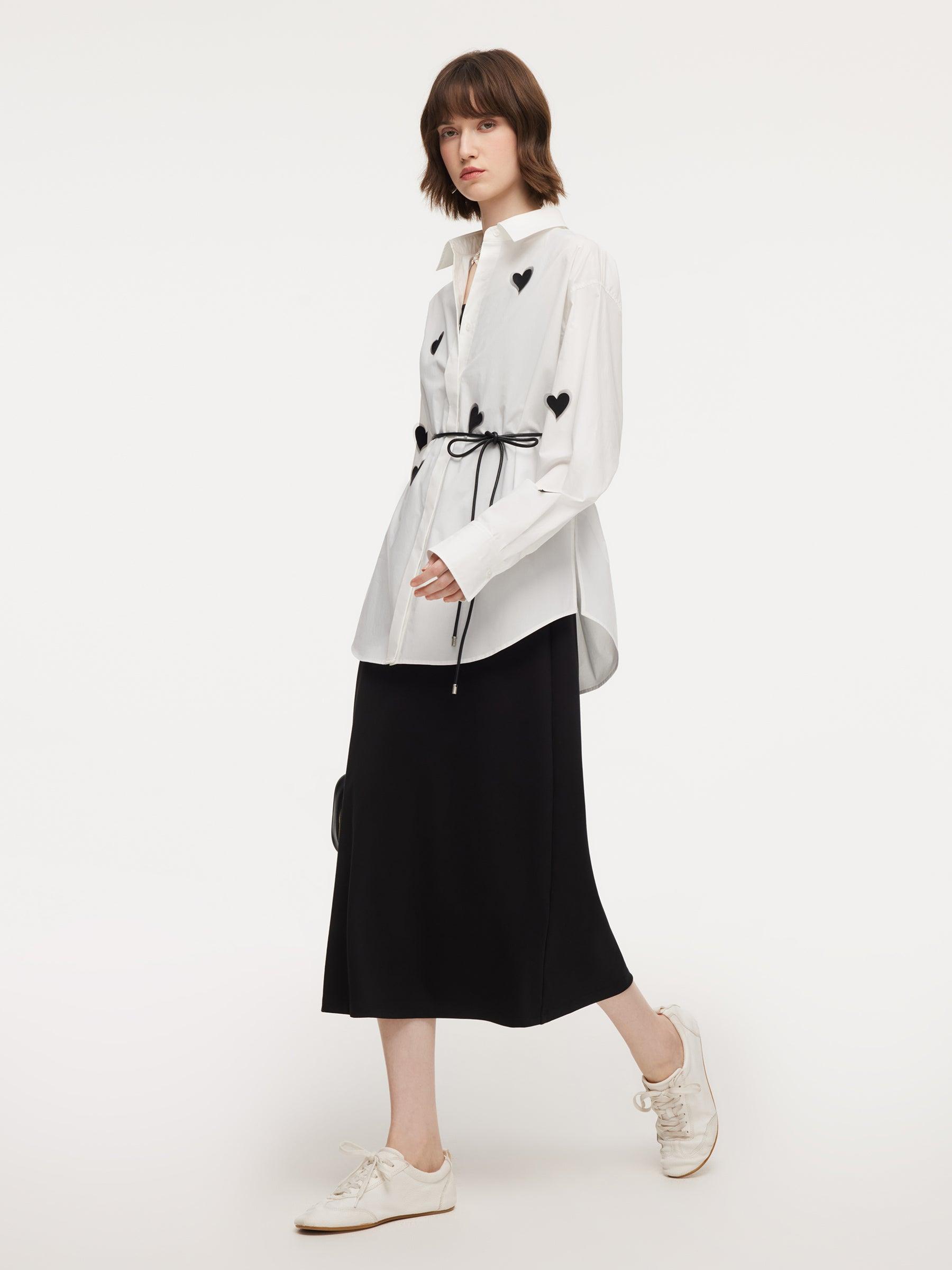 -Cotton blend fabric -Two-piece set -With self-tie belt This two-piece set features a premium cotton-blend shirt paired with a sleeveless knit dress, offering a slim inner fit and a relaxed outer silhouette. The shirt is designed with a hidden placket and a unique 3D double heart motif. Complete with a wax self-tie bel