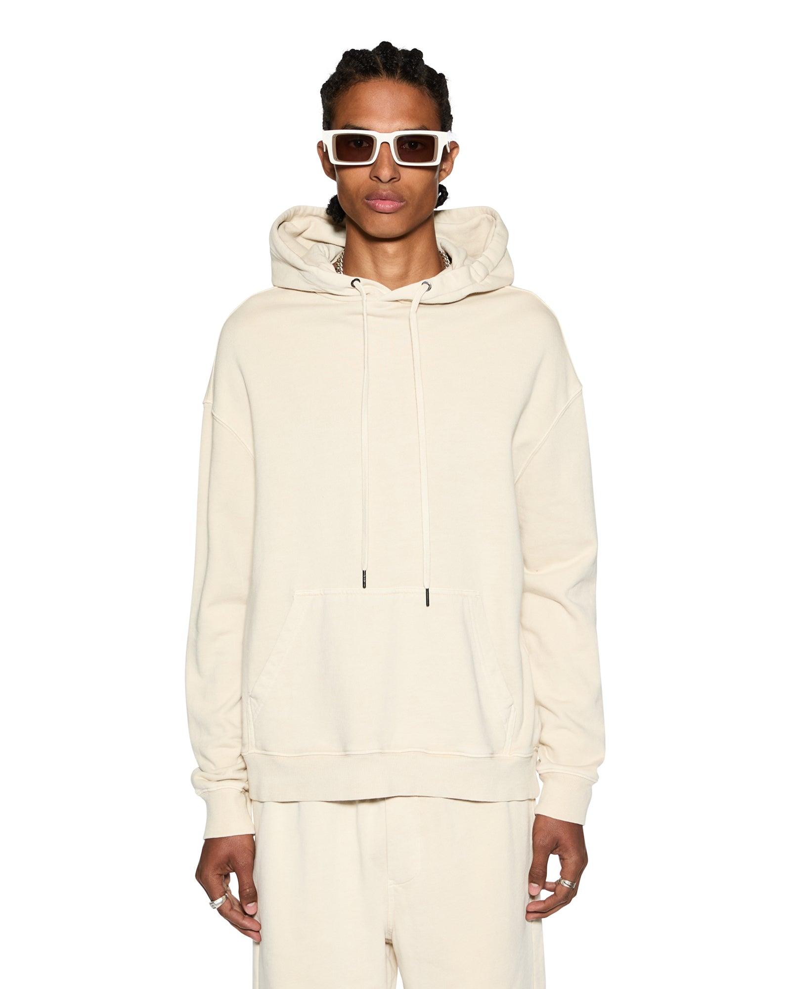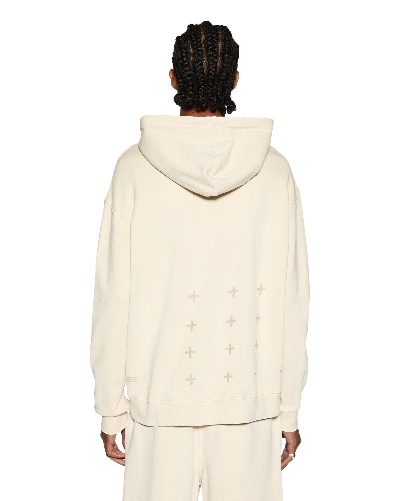 The Kross Biggie Hoodie Desert is an oversized fit in a cream colourway. Garment dyed and made from a premium cotton open ended jersey with aged wash. This style features original Ksubi oversized back 4x4 cross print, hood with metal drawstring, branded hardware, signature rats tail and Ksubi t-box printed branding.