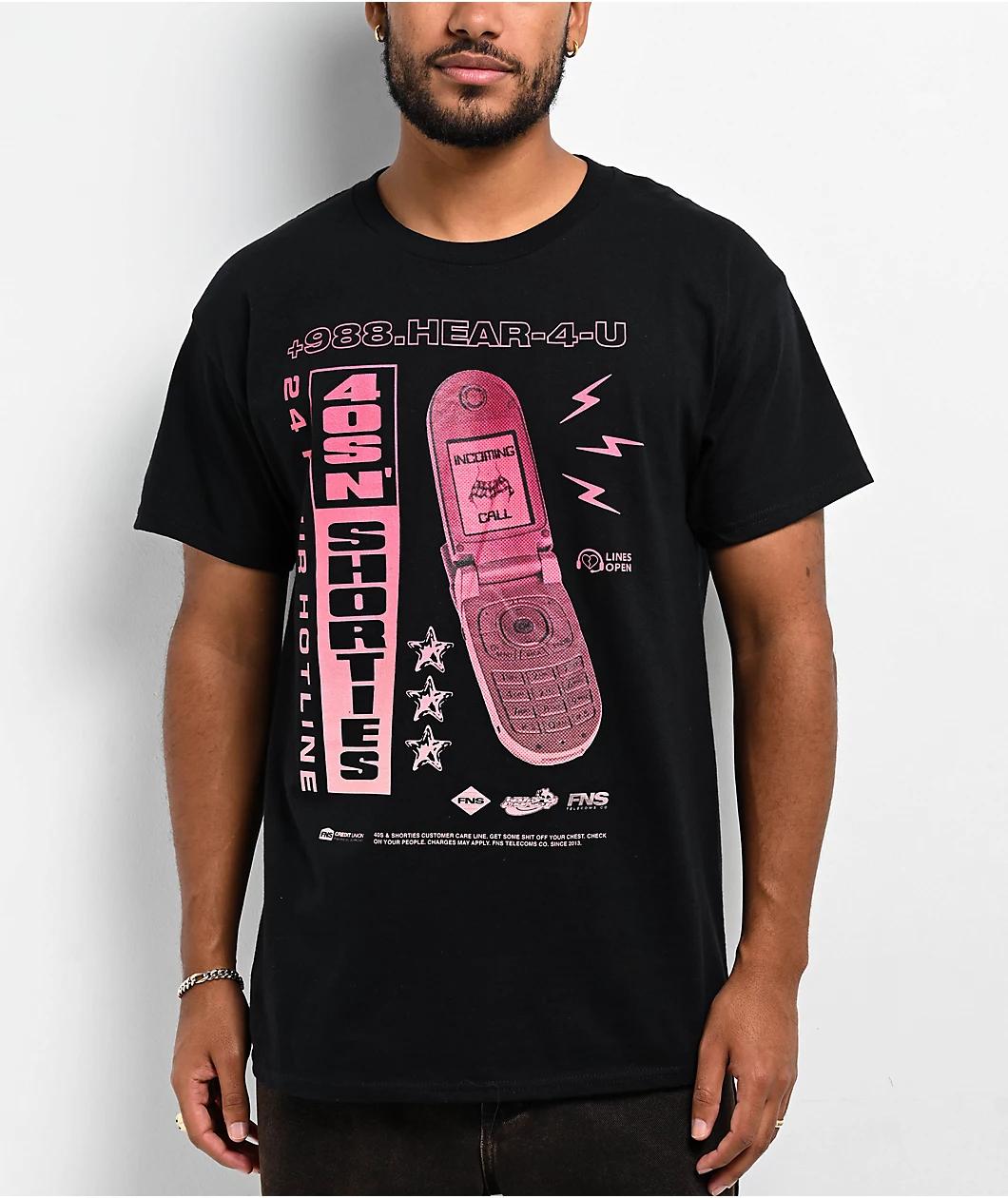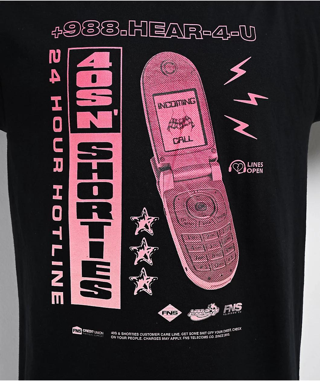 Arriving in a black colorway, 40s & Shorties welcomes the 24hr Hotline t-shirt with a loud screen-printed design on the front. The hot pink imagery displays a vintage burner cellphone adorned with branding, lightning bolts, stars, and a faux number r