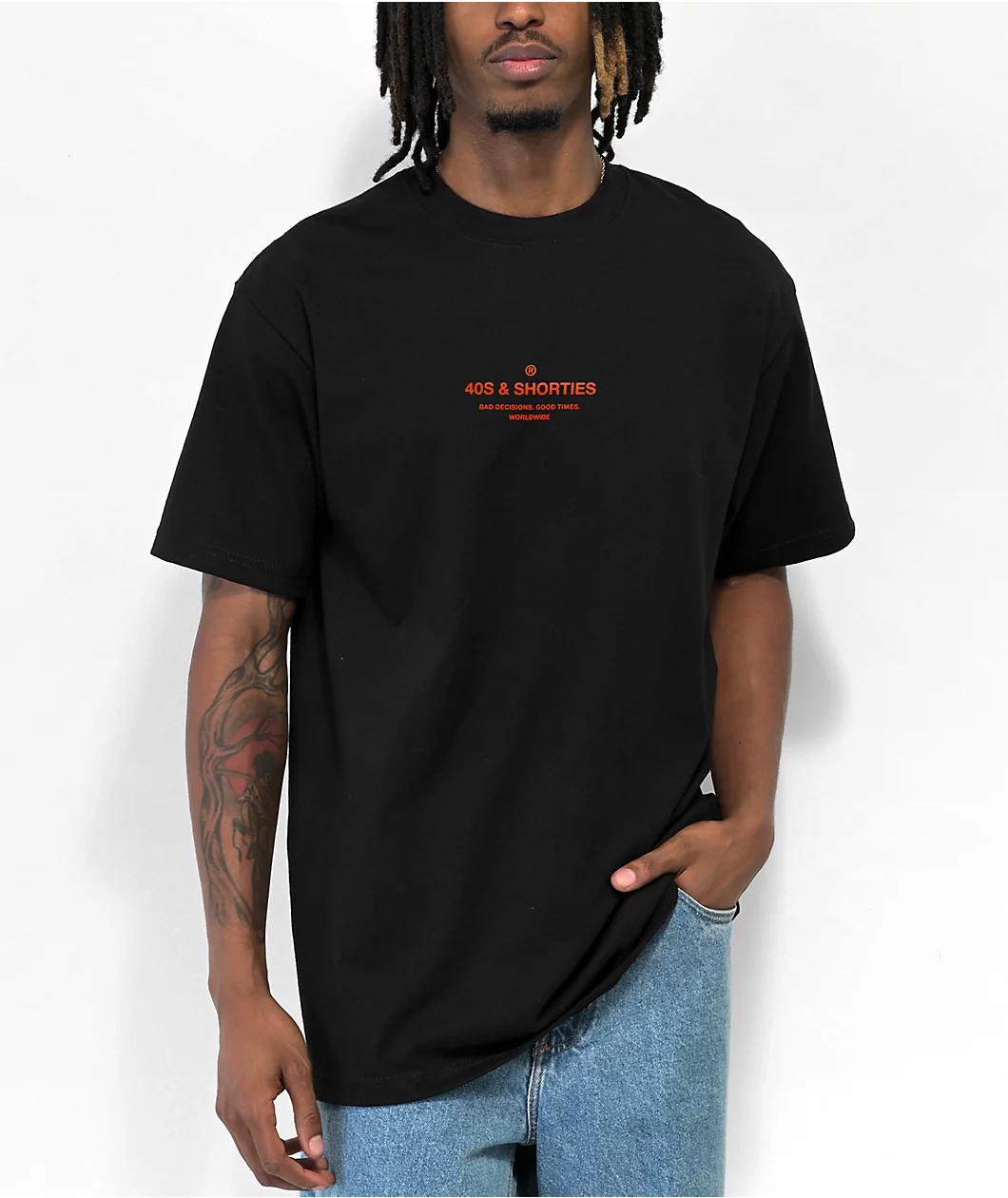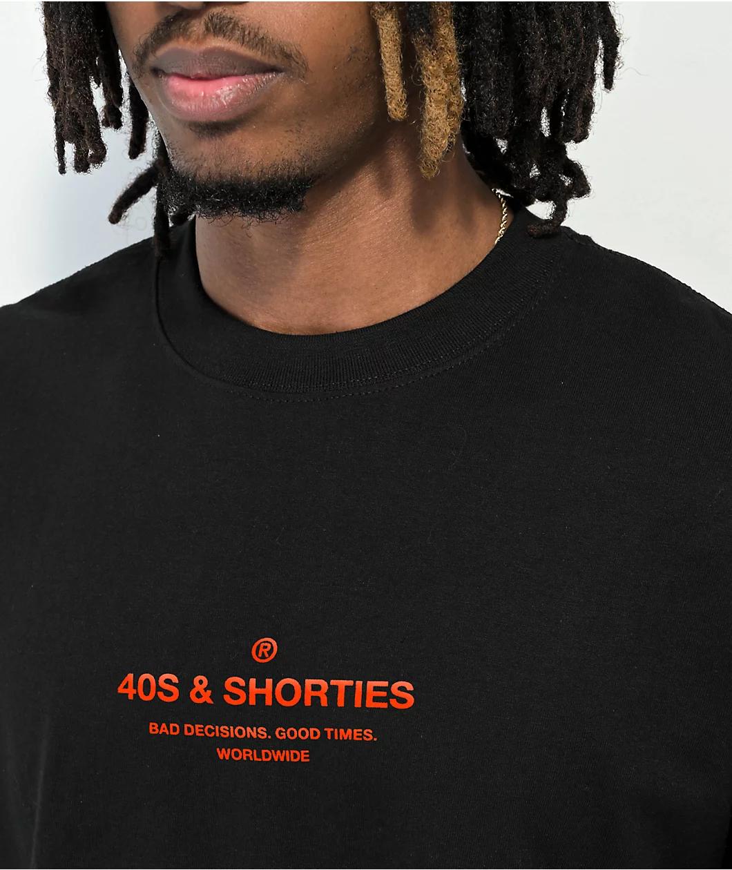 A classic, black cotton t-shirt from 40's & Shorties sold exclusively at Zumiez that has pink logo graphics printed at the center chest and across that back with text "40S & SHORTIES. Bad Decisions. Good Times. Worldwide."