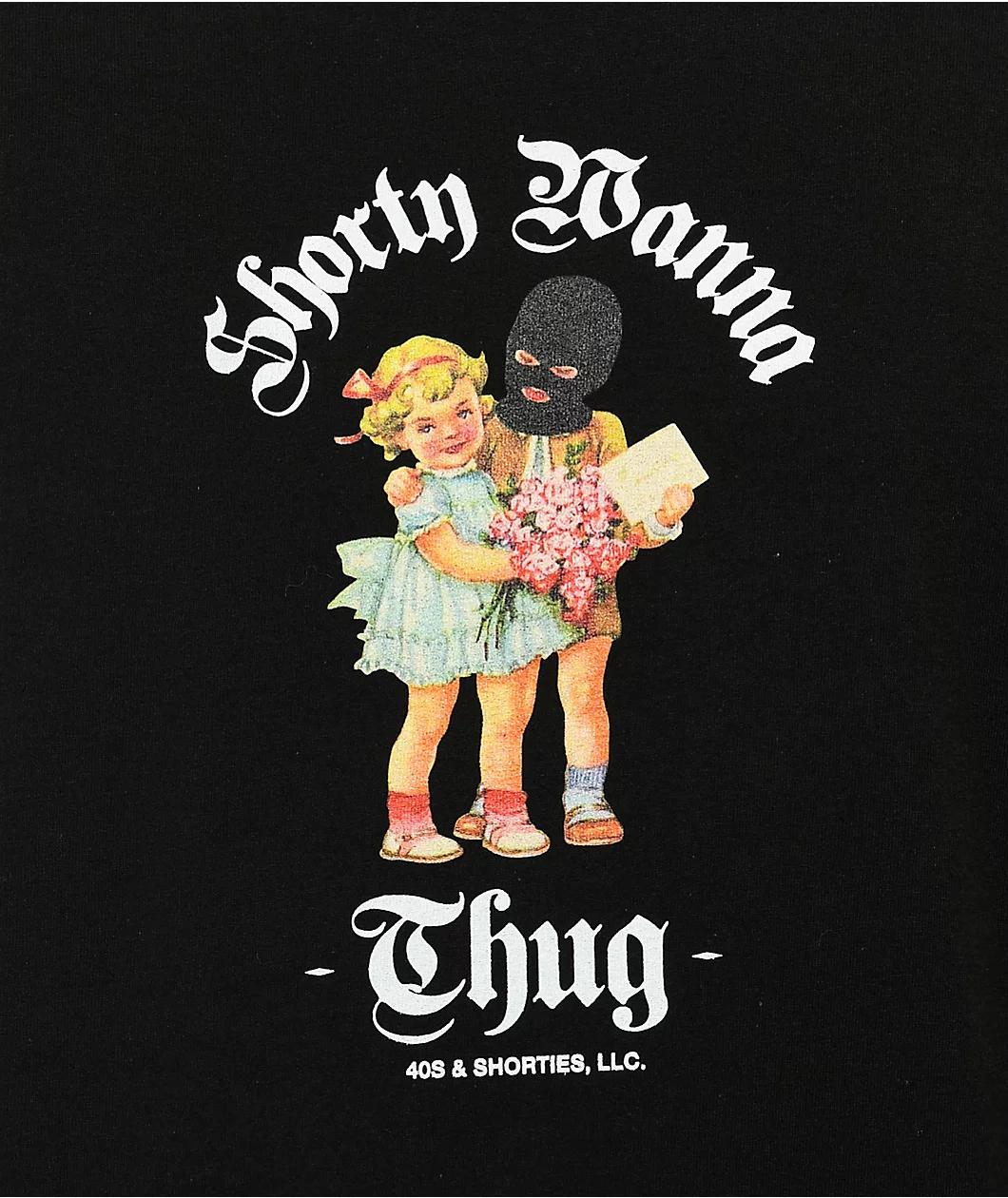 From 40s & Shorties comes the Wanna Thug black t-shirt constructed from soft, midweight cotton. The shirt features a graphic at the chest of two young children embracing each other, one with flowers, and the other with a balaclava mask on. The shirt also