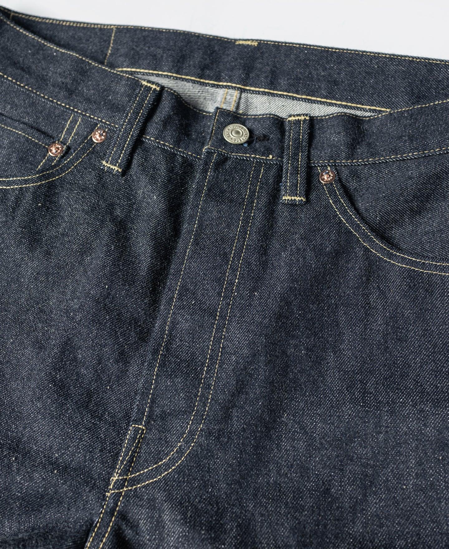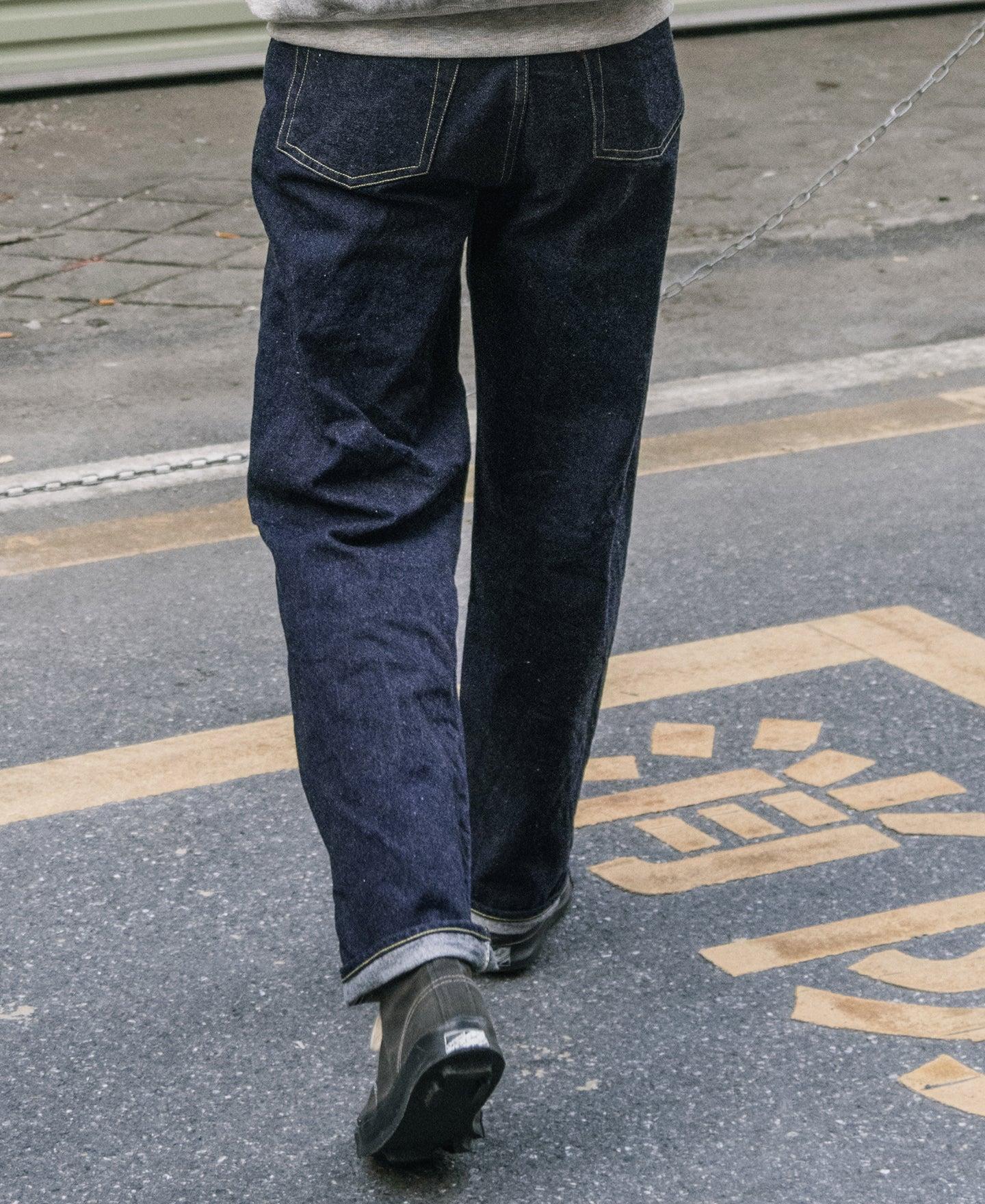 Model wears raw denim sized based on one-wash measurements for an accurate fit.