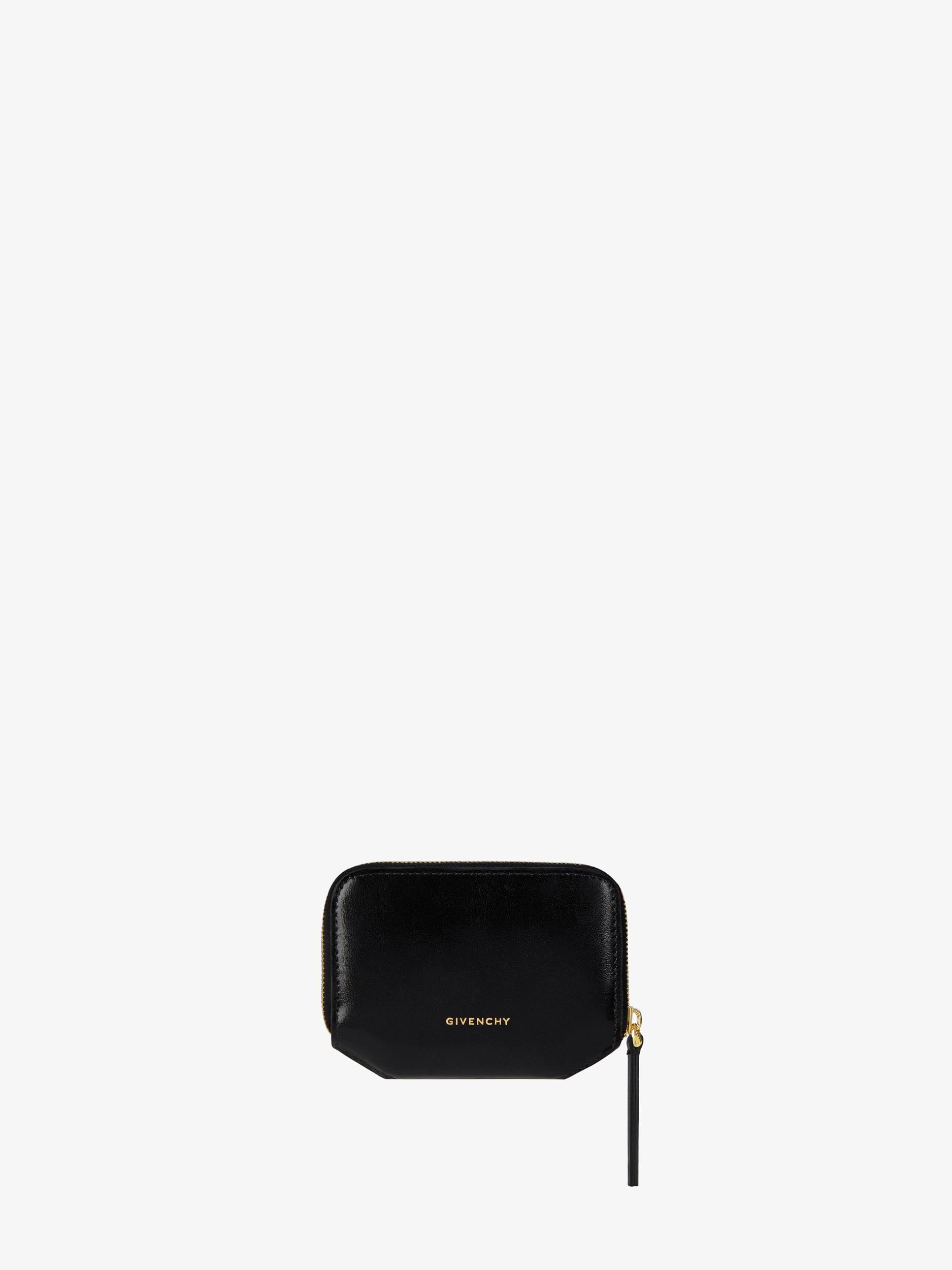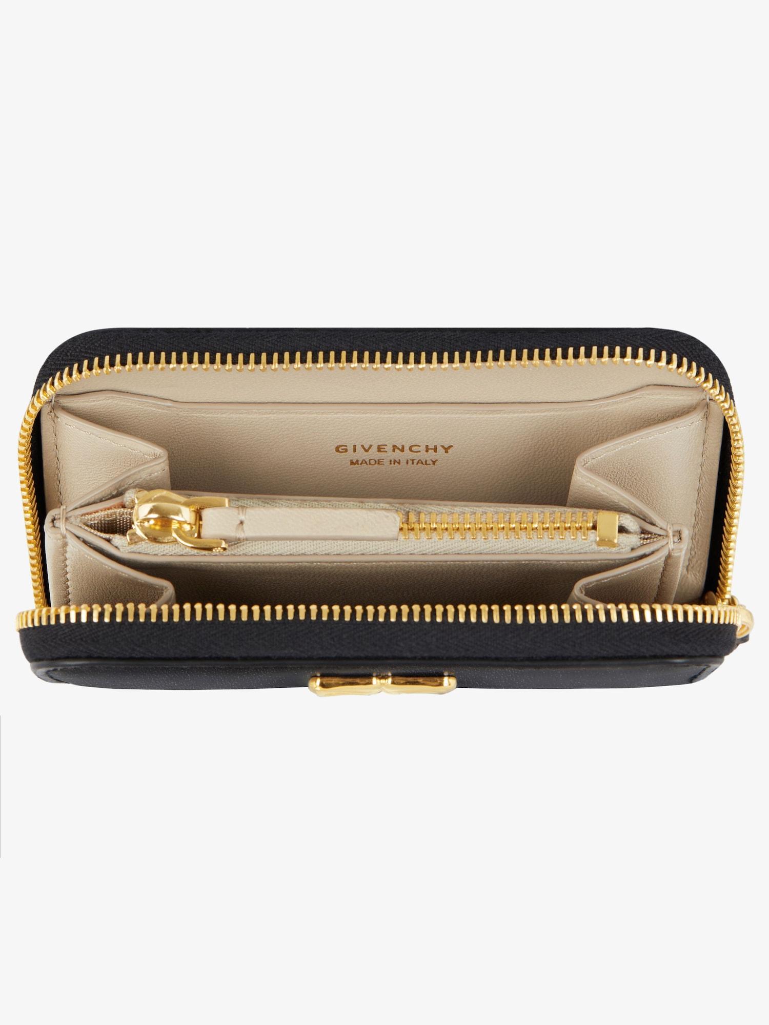 Beveled wallet in Box calfskin leather. 4G Liquid line. Zipped closure with leather zipper pull. Metal 4G Liquid emblem on the front. Golden GIVENCHY signature on the back. Golden-finish metal details. Two main compartments. One zipped center coin pocket. Two card slots.