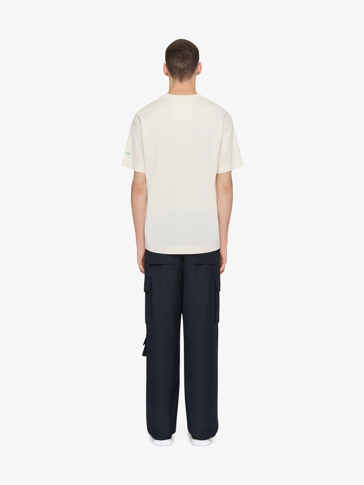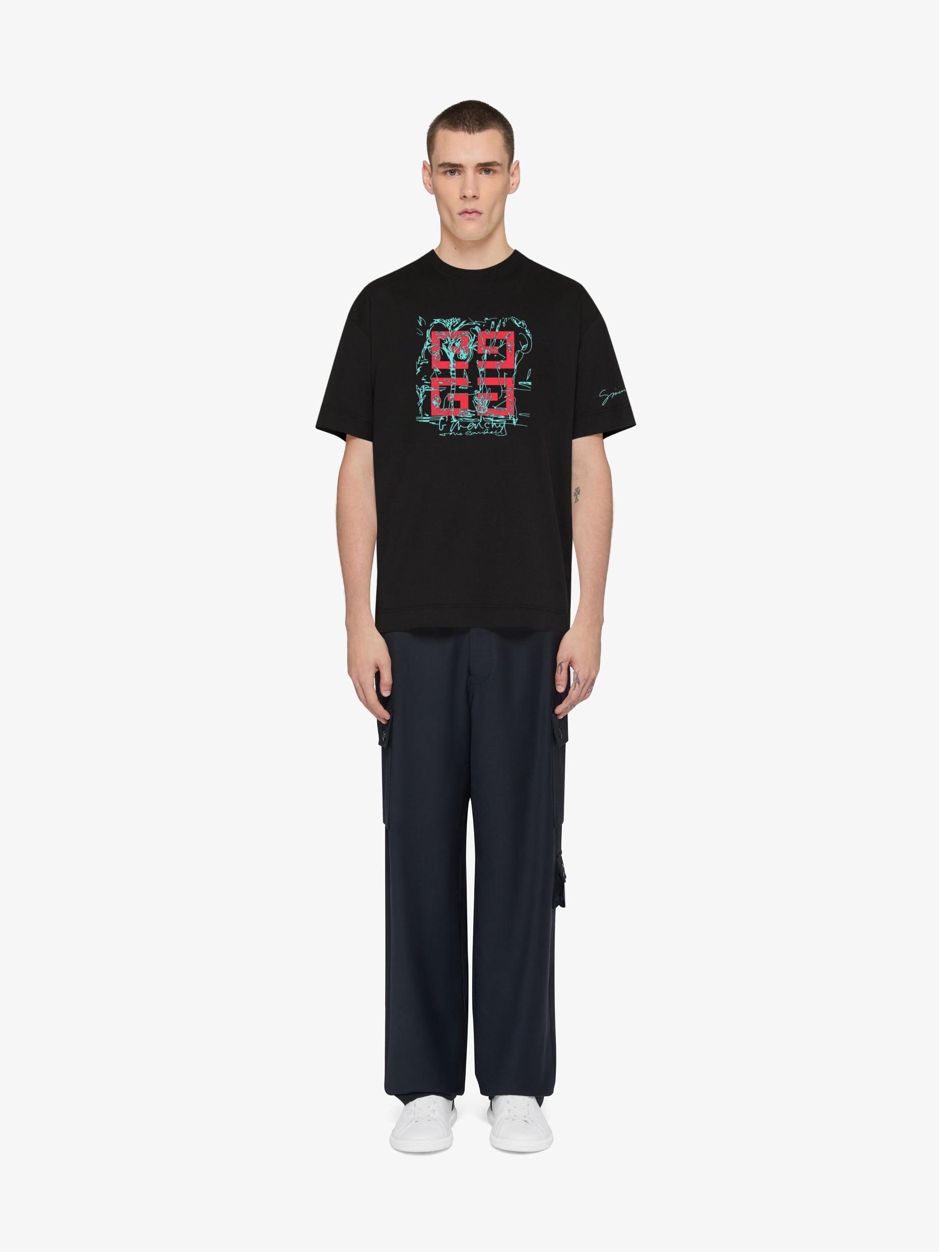 In collaboration with Tomo Campbell, London based artist who focuses on contemporary artworks, Givenchy House presents an artistic Summer 25 capsule collection for men. Tomo reinterprets the iconic 4G, introducing a fresh color palette and a line sketch drawn from his own artwork. Short-sleeved t-shirt in cotton. Crew neck. 4G emblem printed on the front. Artwork by Tomo embroidered on the front. Small GIVENCHY signature embroidered on the sleeve. Classic fit. Model measures 6.1 Feet and wears a size M.