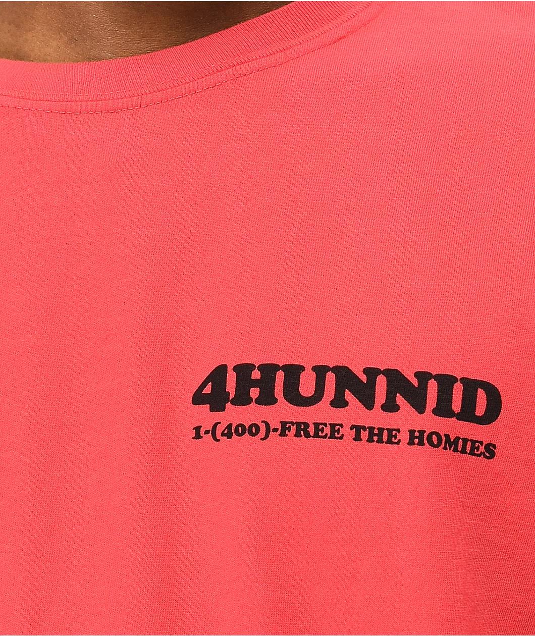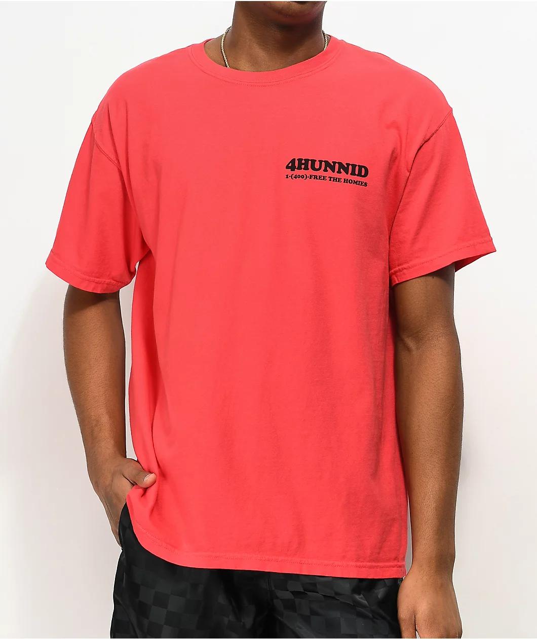 Fight the system with the 4Hunnid Bail Bonds red t-shirt. This light red tee comes with screen-printed black logo script on the left chest for classic branding, while throughout the back is a large image of a faux advertisement for a bail bonds company fo