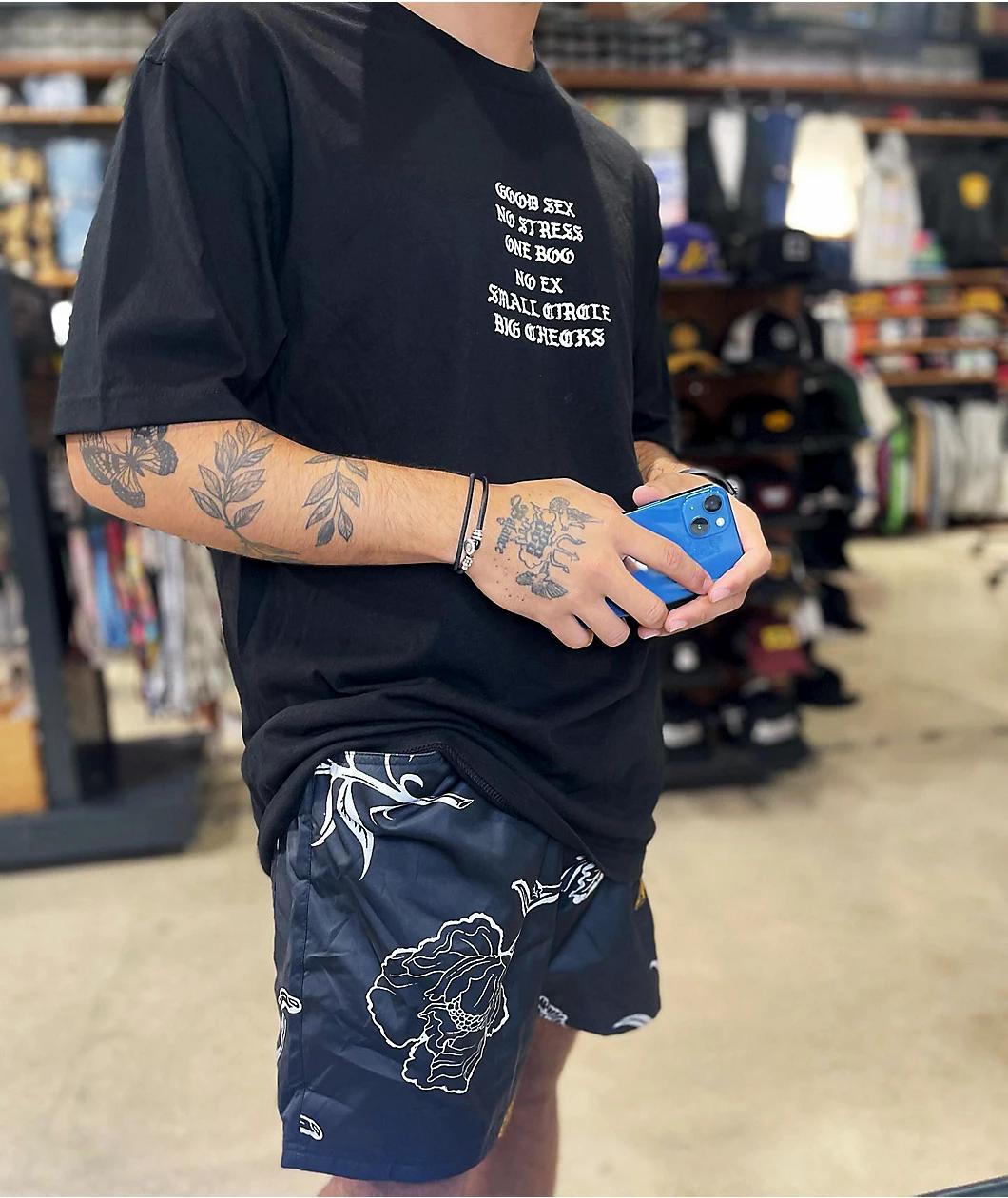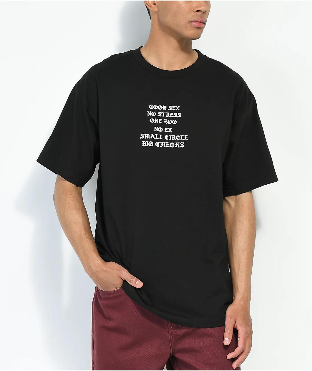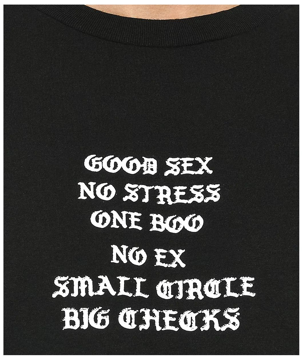 From rapper YG's brand, 4Hunnid, comes the Fourever Good Sex V2 t-shirt in a classic black colorway and soft cotton construction. This 4Hunnid shirt has "Good sex, no stress, on boo, no ex, small circle, big checks" screen-printed in white on the chest an