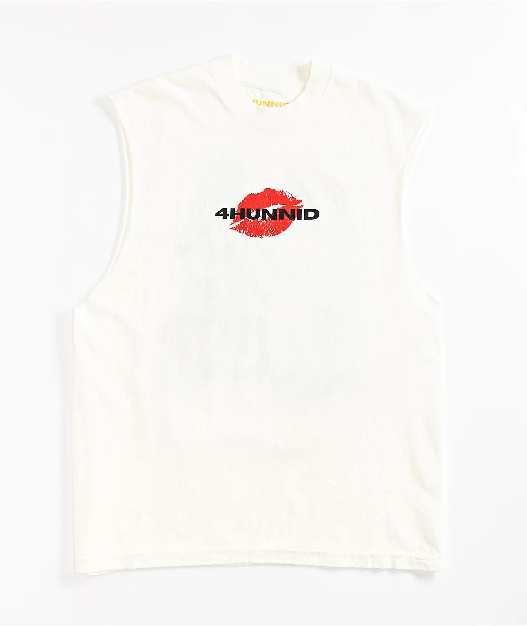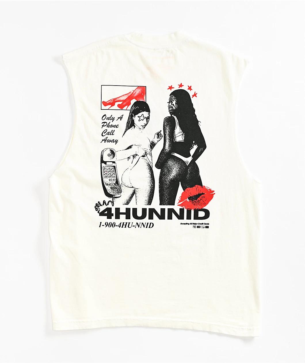 Offering a loose muscle tee fit, the Hotline white tank top from 4Hunnid features law raw edge arm openings giving it a diy look and feel. The chest features a 4Hunnid lipstick kiss logo, while the back is finished with two ladies with "Just A Phone