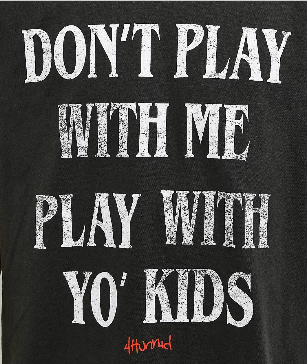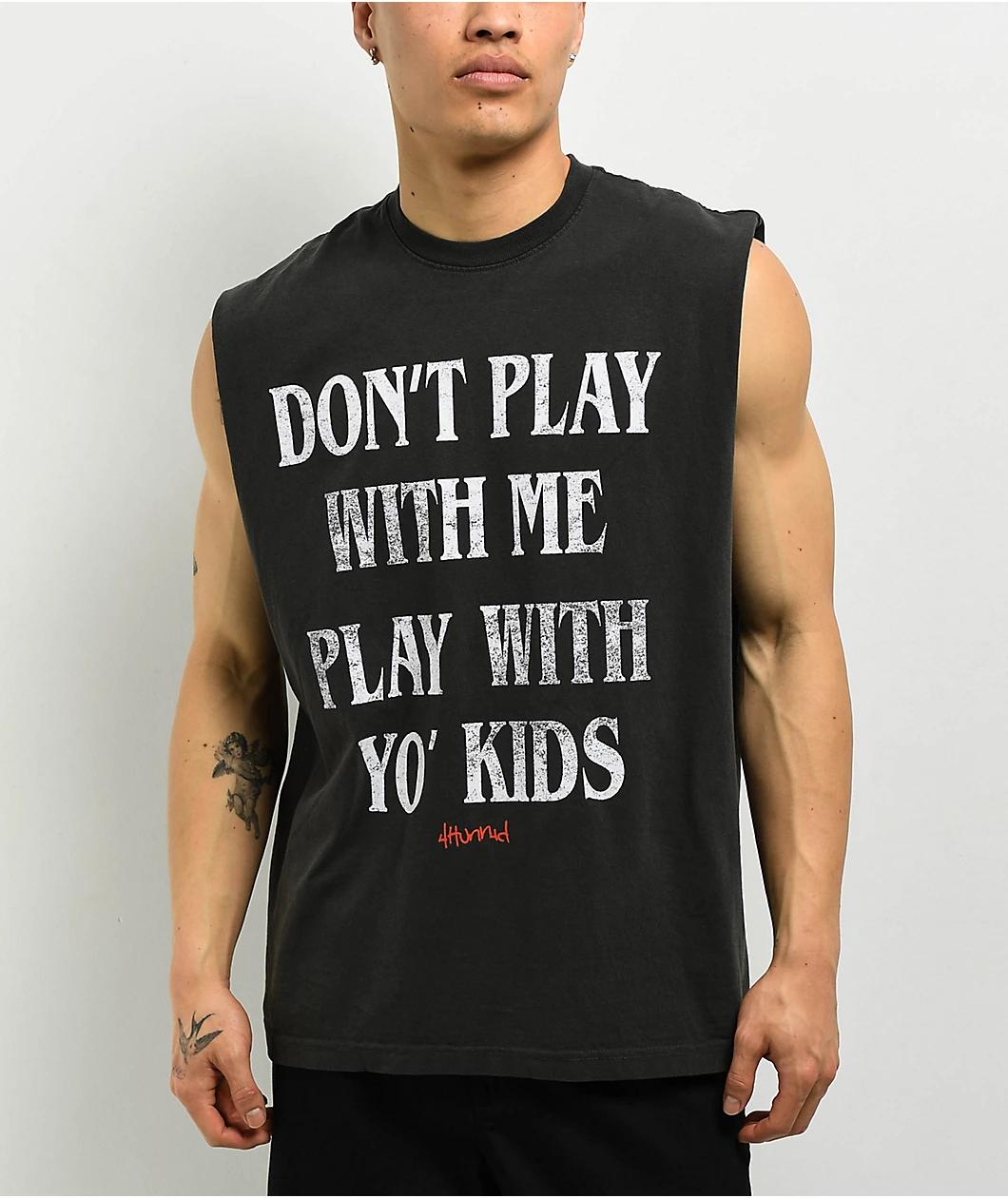 From YG's clothing label 4Hunnid comes the Play tank top in a vintage black colorway. Printed on the front of the muscle tee is "Don't Play With Me Play With Yo' Kids" in a faded font delivering a tough old-school look. Subtle but noticeable branding