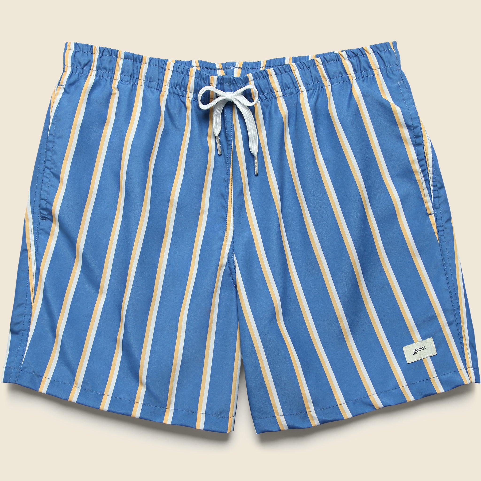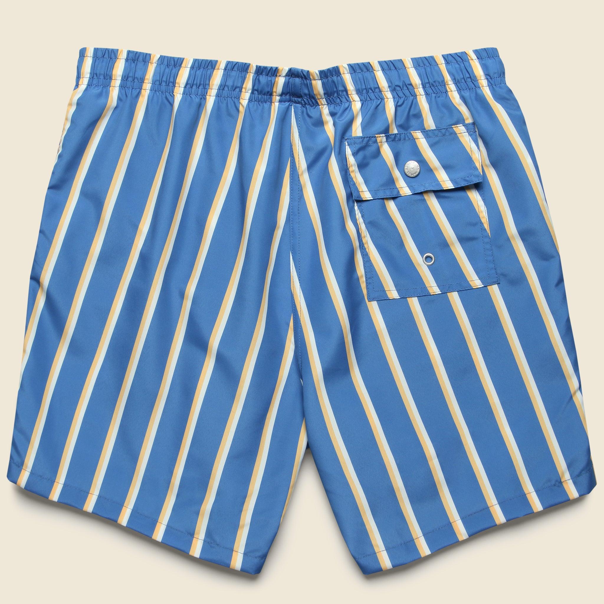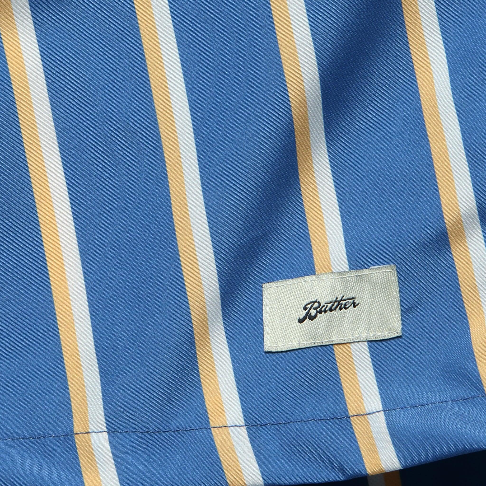 Bather’s swim trunks are made from quick-drying polyester for easygoing comfort in and out of the water. This pair’s been printed with a vertical striped pattern and detailed with an elasticized waist with an ultra-fine, four-way stretch mesh lining that’s so soft and comfy you’ll almost forget it’s there. Finished with two front pockets, custom-tipped drawstrings, and a back pocket with a snap closure, these trunks are a summer essential. Quick-dry polyester Printed striped pattern Comfortable four-way stretch lining Reinforced, deep side pockets Back pocket with Bather snap closure Fit true to size Materials: Shell: 100% quick-dry polyester | Lining: 90% nylon, 10% spandex The following measurements are for size Medium: Waist: 30-32” | Rise: 11” | Inseam: 5 ½” | Thigh: 11” | Leg Opening: 26”