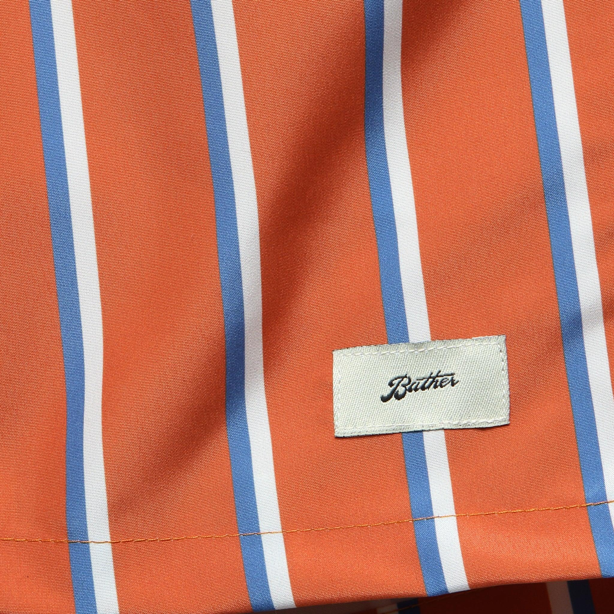 Bather’s swim trunks are made from quick-drying polyester for easygoing comfort in and out of the water. This pair’s been printed with a vertical striped pattern and detailed with an elasticized waist with an ultra-fine, four-way stretch mesh lining that’s so soft and comfy you’ll almost forget it’s there. Finished with two front pockets, custom-tipped drawstrings, and a back pocket with a snap closure, these trunks are a summer essential. Quick-dry polyester Printed striped pattern Comfortable four-way stretch lining Reinforced, deep side pockets Back pocket with Bather snap closure Fit true to size Materials: Shell: 100% quick-dry polyester | Lining: 90% nylon, 10% spandex The following measurements are for size Medium: Waist: 30-32” | Rise: 11” | Inseam: 5 ½” | Thigh: 11” | Leg Opening: 26”