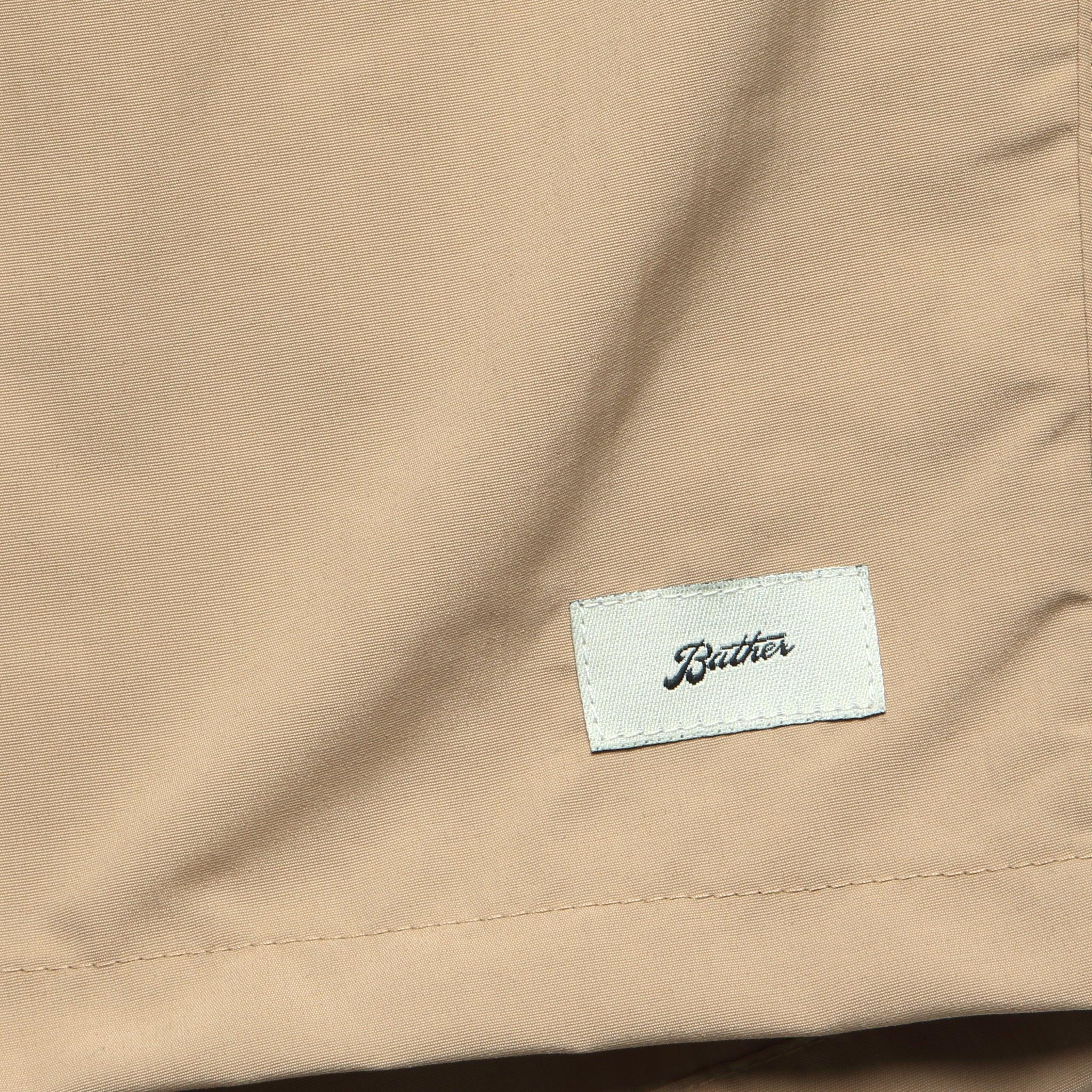 Bather's simple & functional swimwear is designed and sewn in Toronto, Canada. Made to wear on and off the beach, this signature trunk features an elasticized waist with an ultra-fine four-way stretch mesh lining, a quick-dry shell, custom-tipped drawstrings, and a single back pocket with a snap closure. Comfortable four-way stretch lining Quick-dry shell Reinforced deep side pockets Back pocket with Bather snap enclosure Traditional fit that runs true to size We recommend taking your normal size Materials: Shell: 100% recycled quick-dry nylon | Lining: 90% nylon, 10% spandex The following measurements are for size Medium: Waist: 30“ | Inseam: 5 ½“ | Thigh: 11“ | Leg opening: 26“ | Rise: 11“