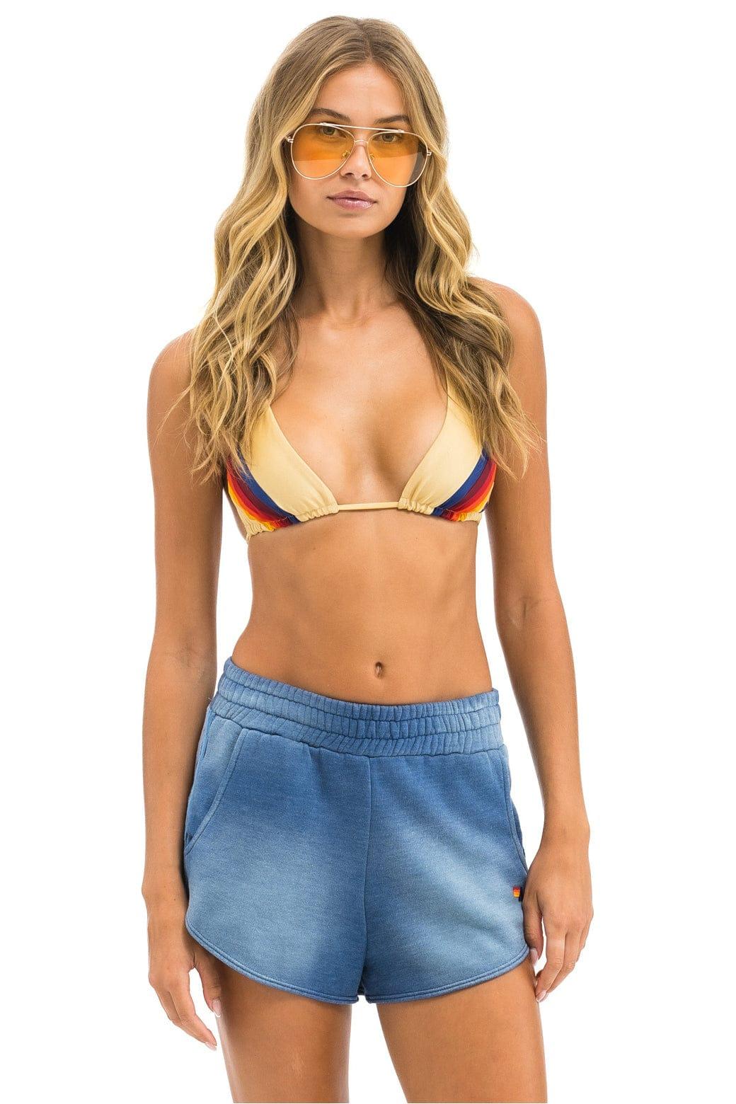 Without a doubt the coziest shorts ever. True to the classic Aviator Nation style, these shorts are super retro & SO soft. The hand stitched stripes down the side of this perfectly faded wash will keep you lookin' fresh and funky all season long. Our single needle stitch work gives each garment a unique, one of a kind effect. All of our products go through an intense breaking-down process that gives them a vintage feel you'll love because it's broken in from day one of wearing it. You're going to live in these shorts. - Hand sewn in our own factory in the heart of Los Angeles- Tri-Blend Fabric: 50% polyester, 38% cotton, 12% rayon- Machine wash cold with like colors. Hang or tumble dry on low- Model wearing size S