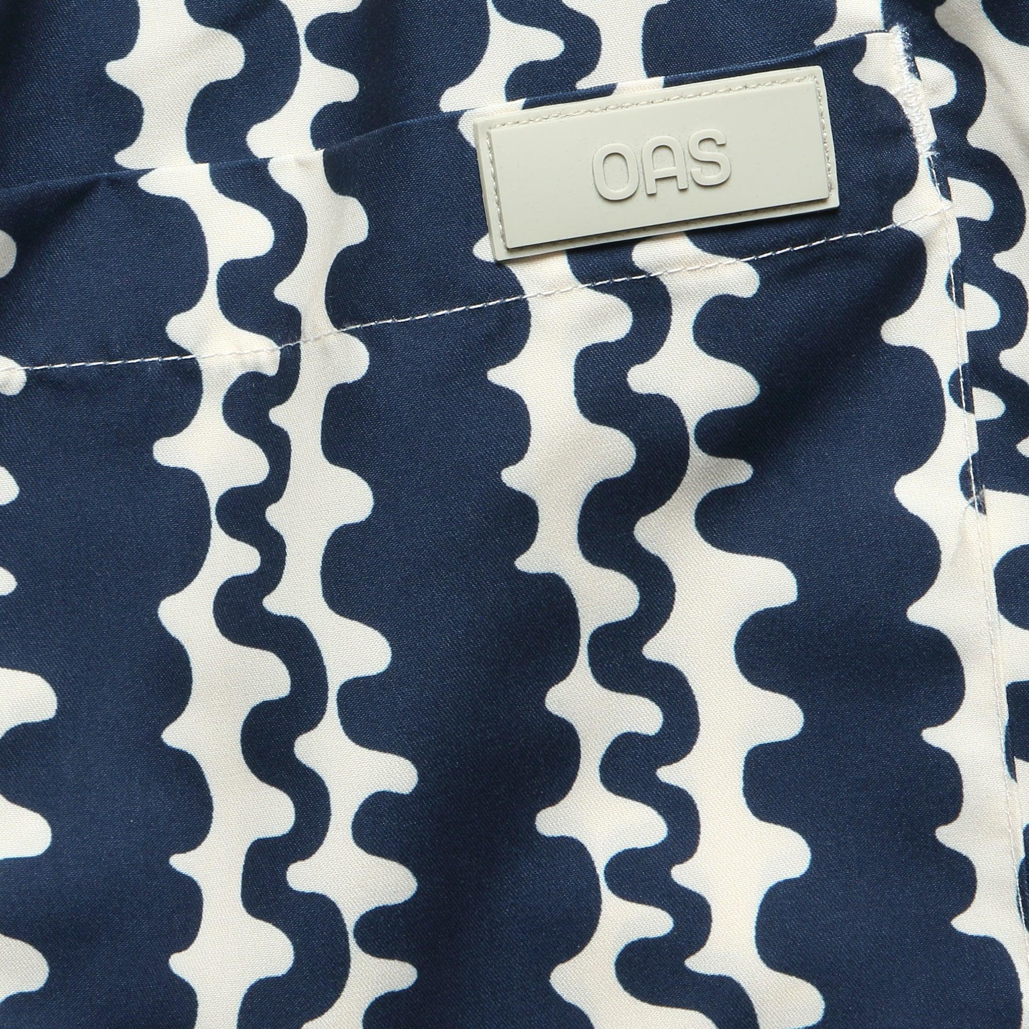 These Swim Trunks from OAS are made from a quick-drying, lightweight polyester to give you resort-level comfort whether you’re hanging ten or taking a dip to beat the heat. They’ve got two front pockets, a back pocket, and a hidden zipper pocket for a hotel room key or your bank card on the beach. Finished with a fit that’s not too tight and not too baggy, a comfortable mesh lining, and printed with a rhythmic wave pattern, these trunks are an easy go-to for a fun summer. Quick-drying, lightweight polyester Printed rhythmic wave pattern Elastic waistband with adjustable drawstring Dual side-slit hand pockets Back drop-in pocket Hidden zippered pocket 5" inseam hits at upper thigh Traditional fit that runs true to size We recommend taking your normal size Materials: 100% polyester The following measurements are for size Medium: Waist: 30-32” | Inseam: 5” | Thigh: 12” | Leg opening: 24” | Rise: 11 ½”