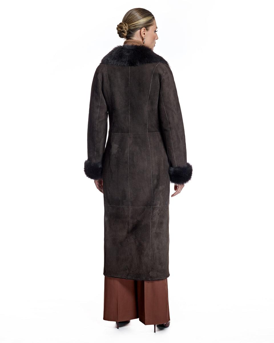 The design is elevated with a plush Toscano lamb notch collar and refined turn-back cuffs, adding texture and visual depth. Thoughtfully detailed with inner and outer tie closures for a secure, adjustable fit and functional slit pockets, this coat combines luxury with everyday practicality. Its full-length profile delivers dramatic impact and enduring style.