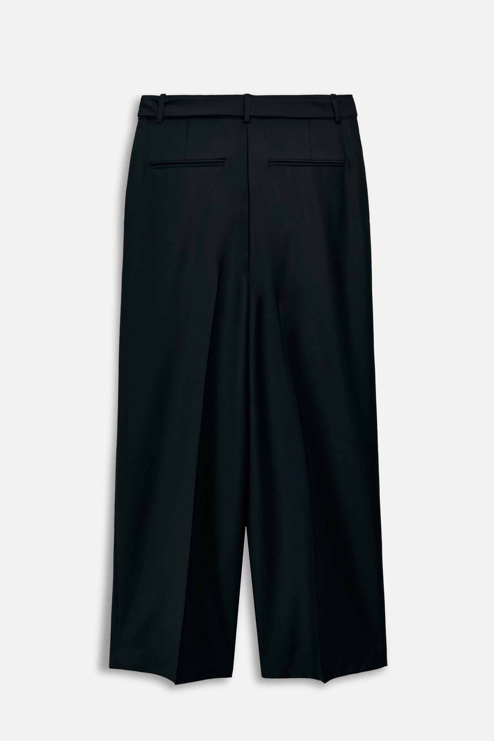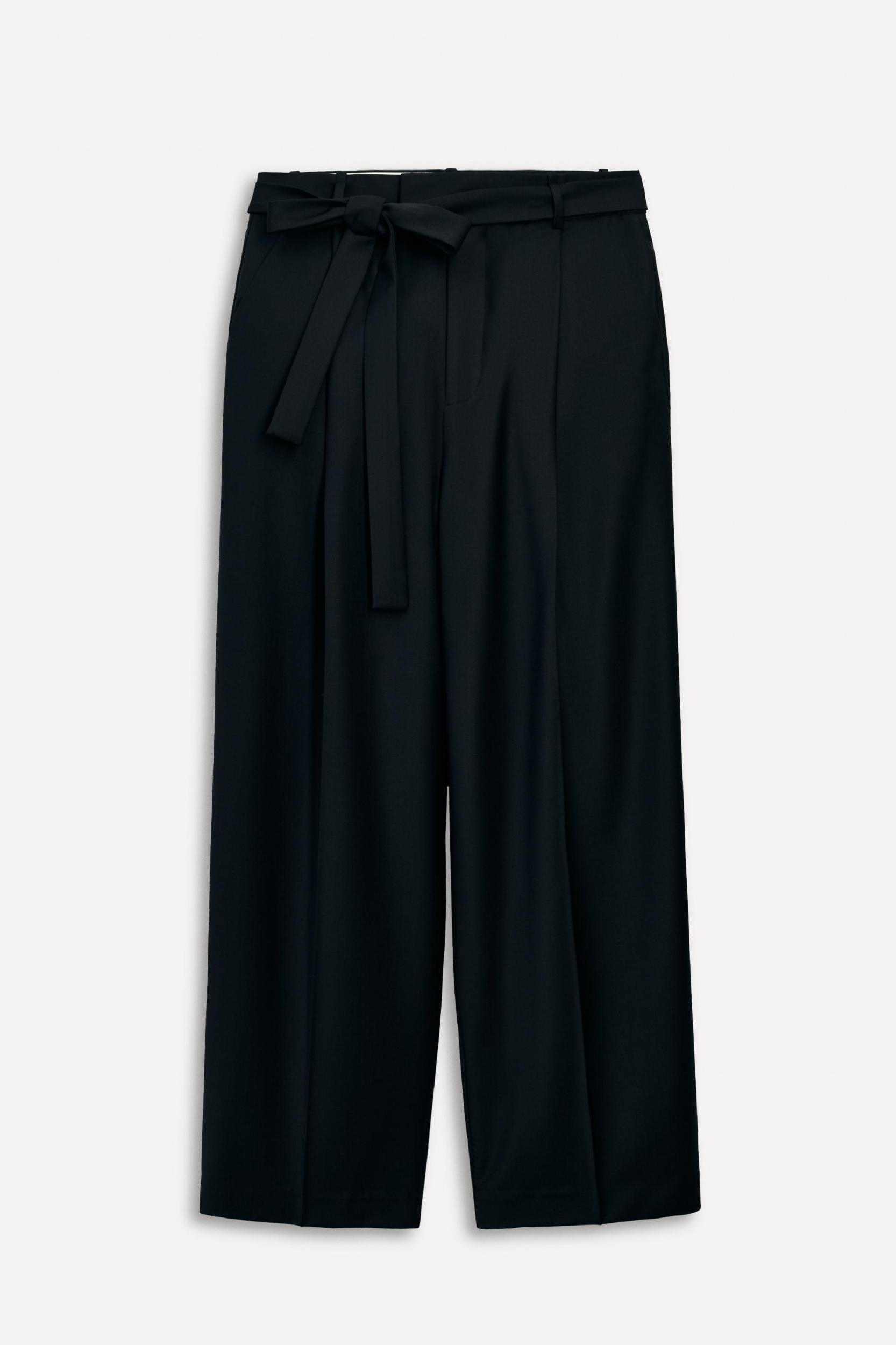 Pants made of wool blend yarn. High-waisted with belt loops. Side pockets and faux welt pockets at the back. Contrasting topstitching detail on the inner waistband. Self-tie belt in the same fabric. Front closure with zipper, interior button, and metal hooks.