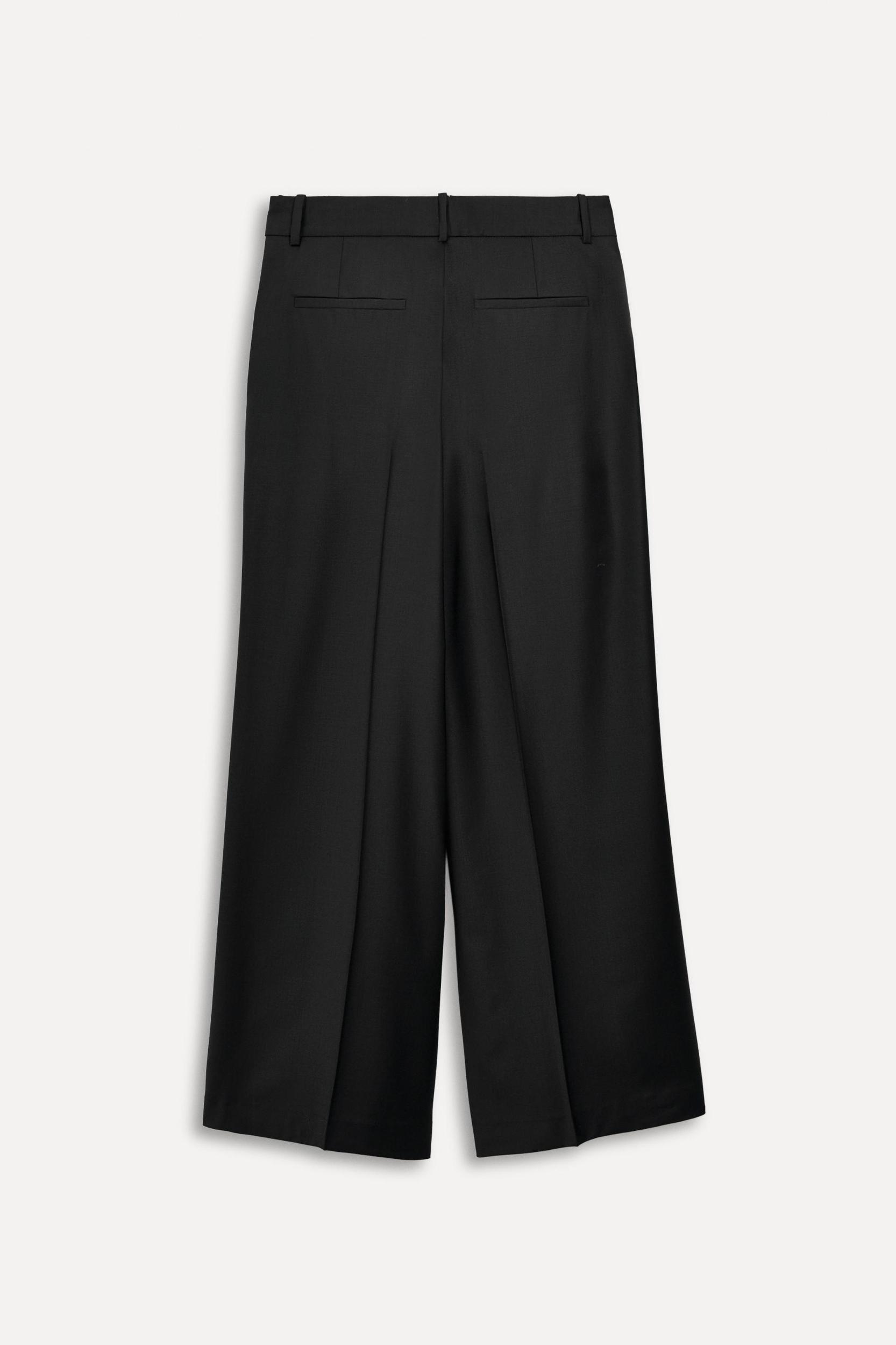 Pants made of wool blend yarn. High-waisted with belt loops. Side pockets and faux double welt pockets. Contrasting inner waistband detail with topstitching. Pressed front crease. Front closure with zipper, interior button, and metal hooks.