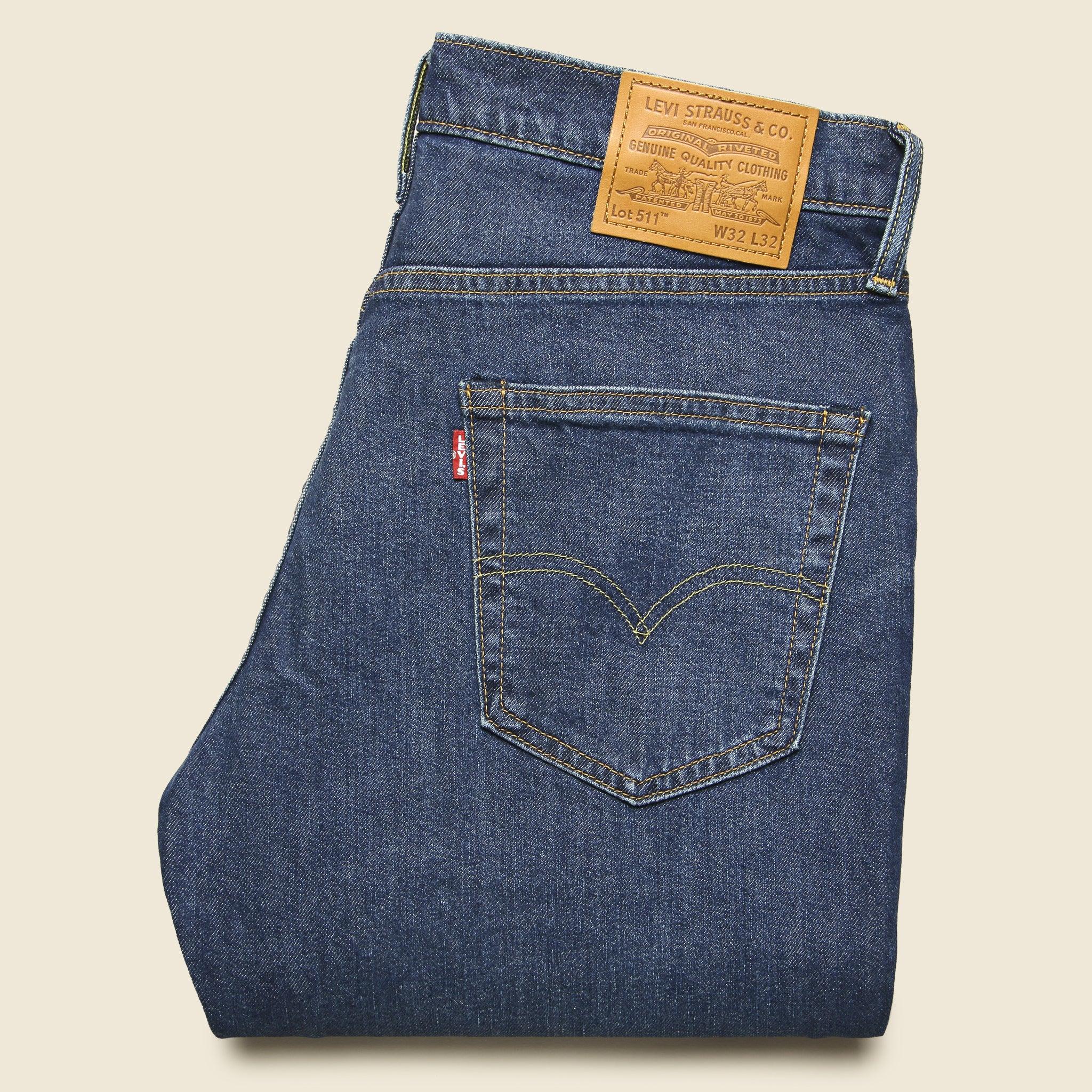 Whiskered and faded throughout, these low-rise jeans are made from a combination of cotton, Tencel lyocell, and elastane for both supreme comfort and flexibility. Classic five-pocket styling topped with a zip-fly, leather patch logo, and signature Levi's topstitching on the pockets. Flex fit cotton blend Medium/ Dark Wash Zip-fly Low-rise that sits below the waist Slim fit from hip to ankle We recommend taking one size up from your normal size for a more easygoing fit Materials: 70% Cotton, 28% TENCEL Lyocell, 2% Elastane The following measurements are for size 32: Waist: 32” | Rise: 10” | Inseam: 32”| Thigh: 15” | Leg Opening: 12”